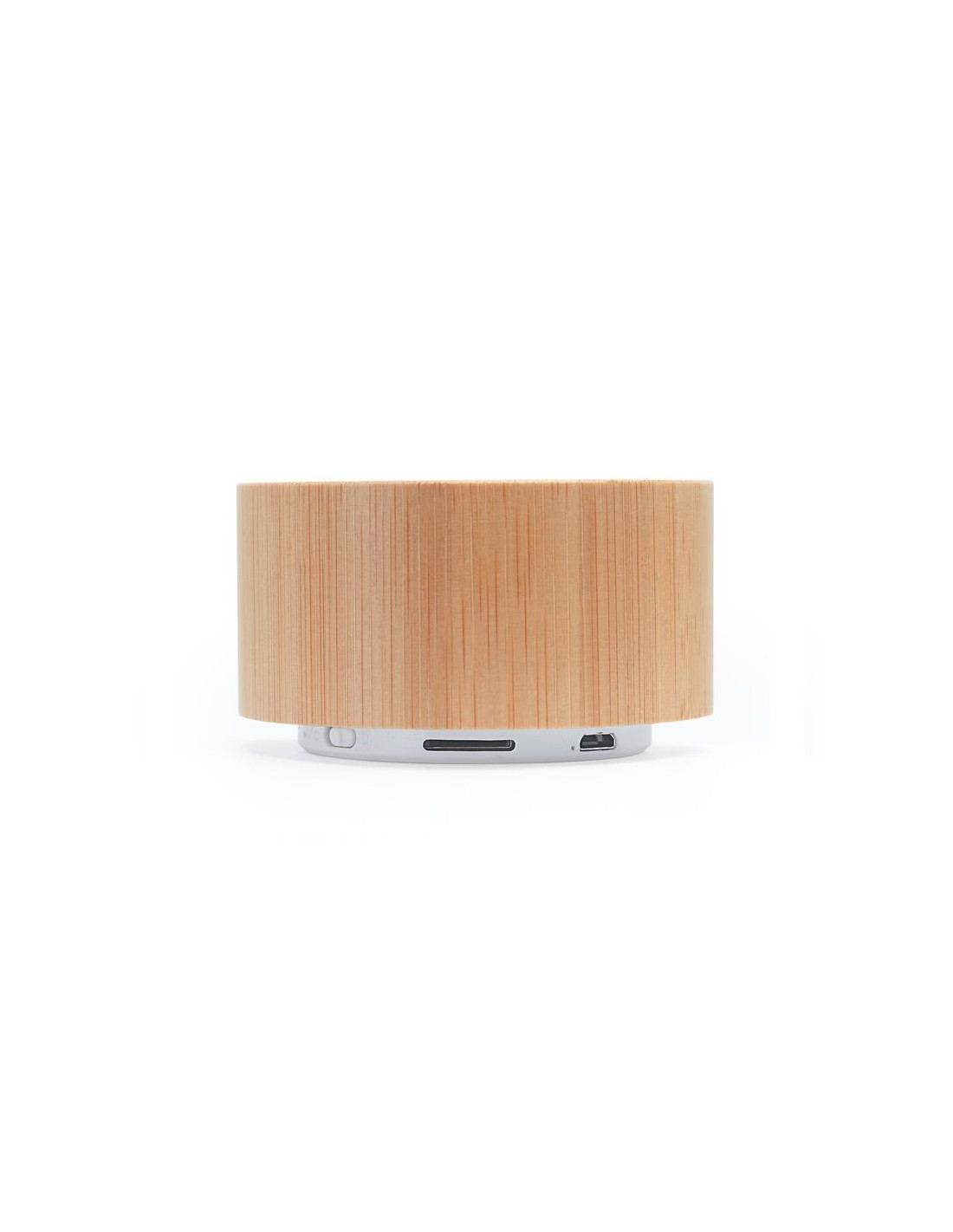 Altoparlante rotondo senza fili con corpo in ABS bianco e bambù naturale, bottoni bianchi e griglia, funzione radio FM, vivavoce, slot per schede mini SD e 3W di potenza, batteria ricaricabile, cavo incluso, base antiscivolo.