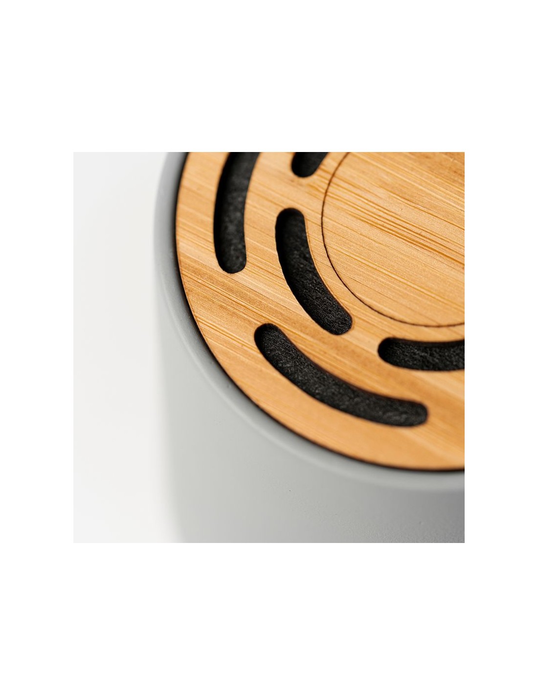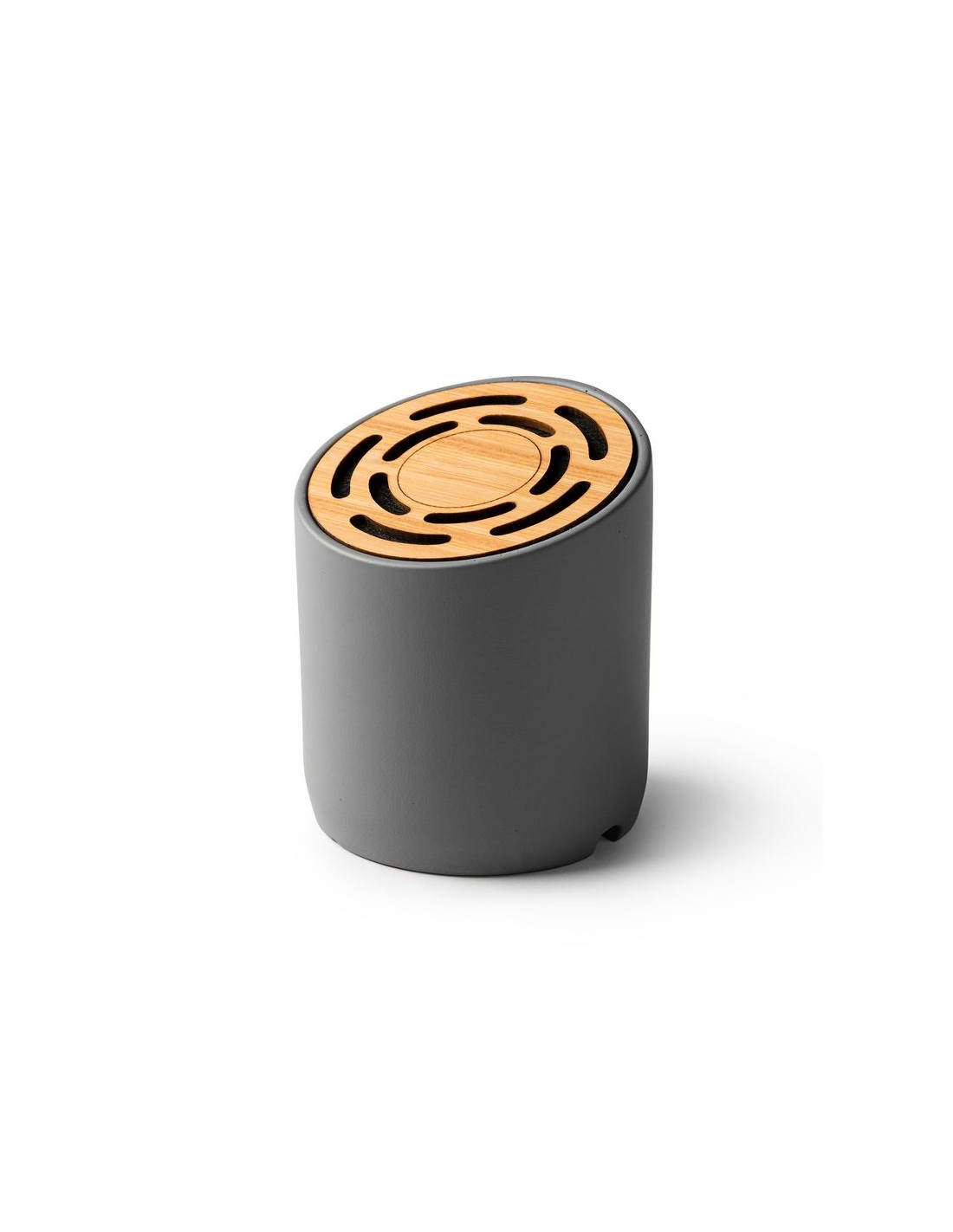 Altoparlante wireless Bluetooth 5.0 con corpo rotondo in cemento calcareo e superficie in bambù naturale, potenza 3 W e batteria ricaricabile, cavo di ricarica incluso, confezione in scatola eco design.