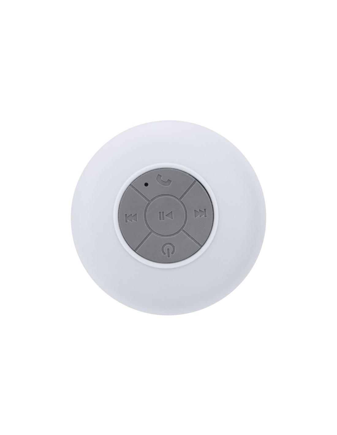 Altoparlante wireless con corpo in ABS resistente agli schizzi d'acqua, fissaggio tramite ventosa, funzione vivavoce, potenza 3W, batteria ricaricabile tramite cavo Micro USB, cavo incluso, confezione in scatola design.