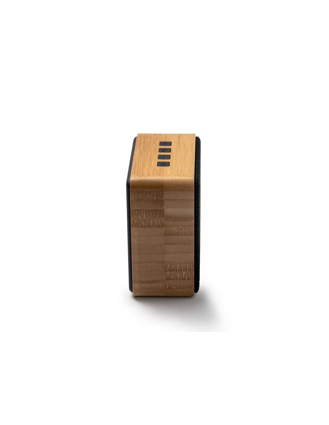 Cassa wireless con struttura principale in bambù e tessuto RPET, uscita da 3W e batteria ricaricabile, connessione di tipo C, cavo incluso, confezione in scatola dal design ecologico.