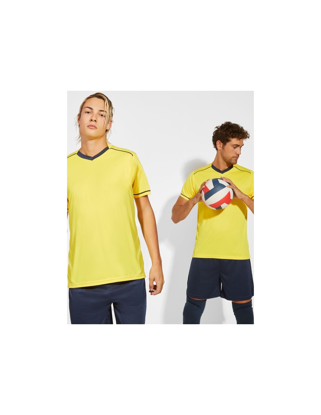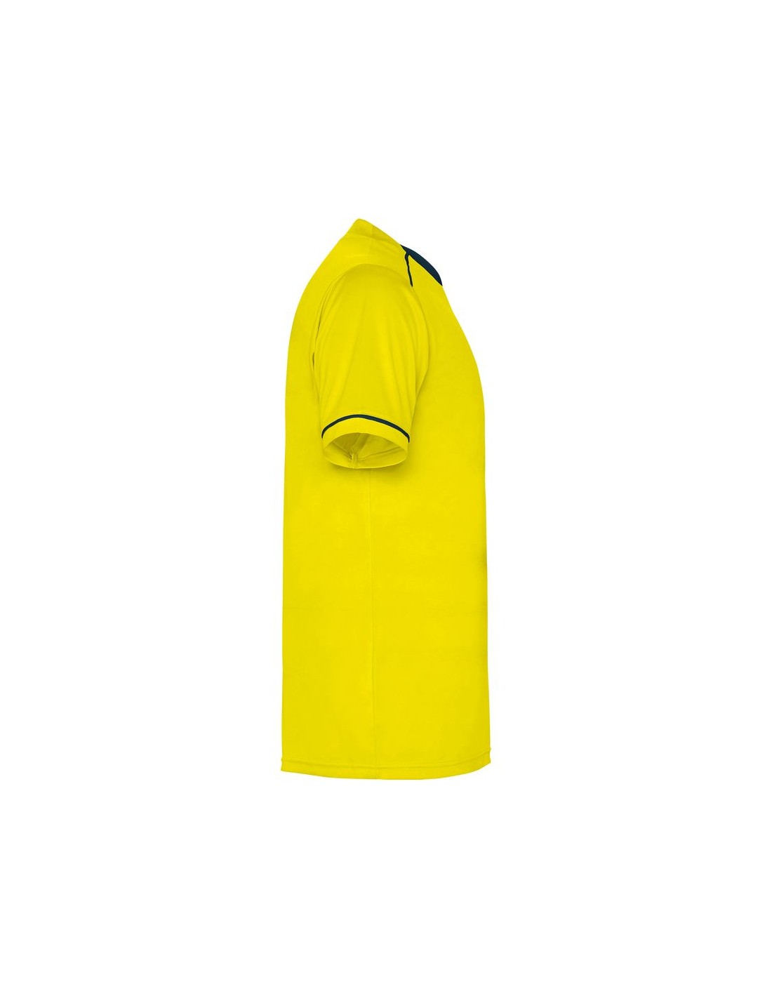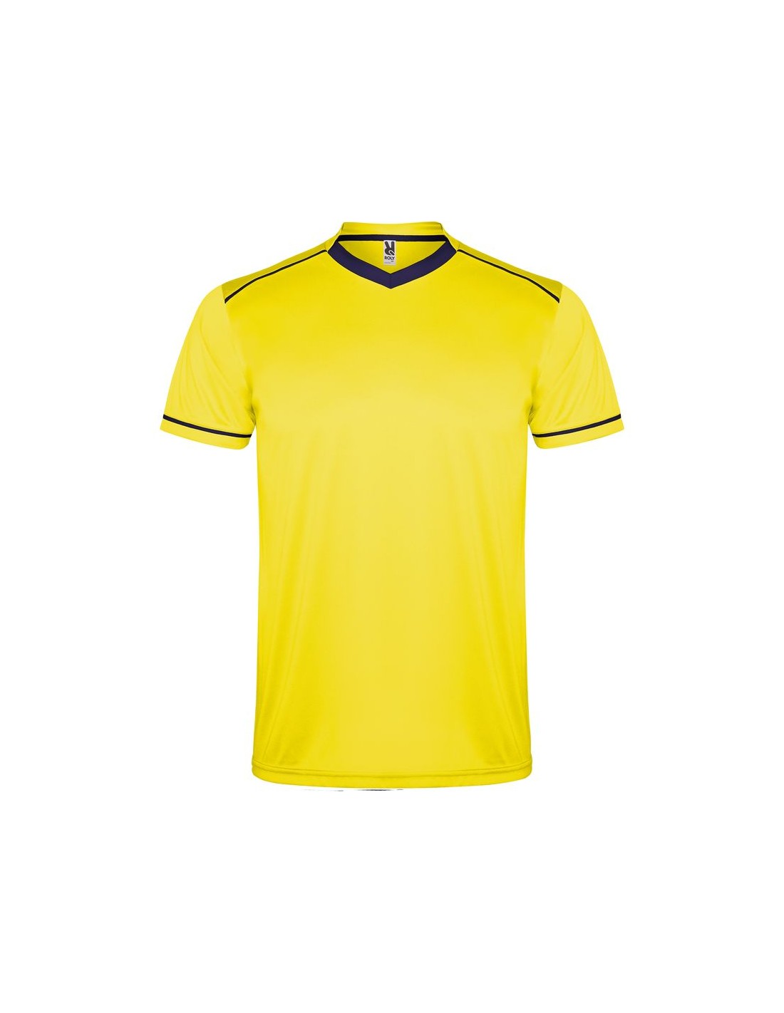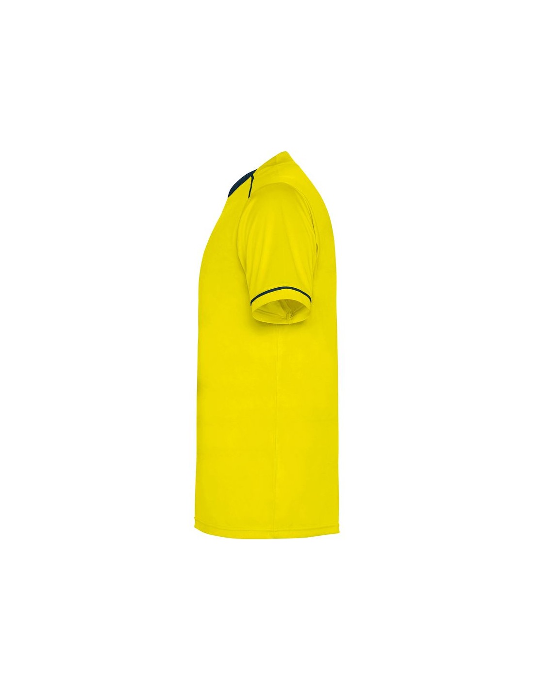 Completo sportivo composto da maglietta e pantaloncino, maglietta con doppio collo a V bicolore, copri cuciture di rinforzo all'interno, spalla con inserto in fettuccia e colore a contrasto, manica corta con apertura a vivo e orlo in colore a contrasto, pantalone corto con girovita elastica, cordoncino regolabile all'interno e impuntura di sicurezza.