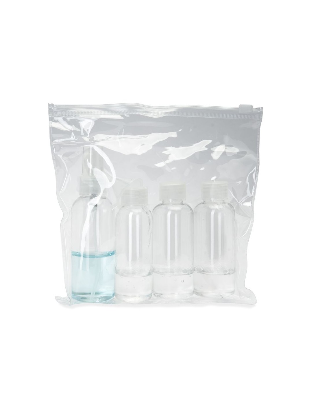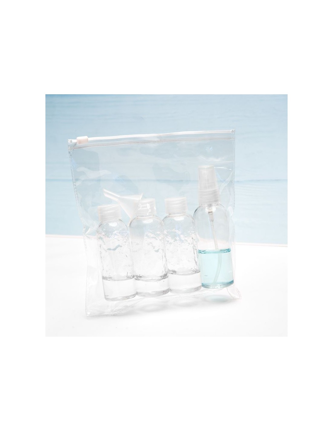 Necessaire da viaggio trasparente realizzato in PVC con chiusura ermetica, include un assortimento di pratici flaconi ideali per gel, shampoo e profumo.
