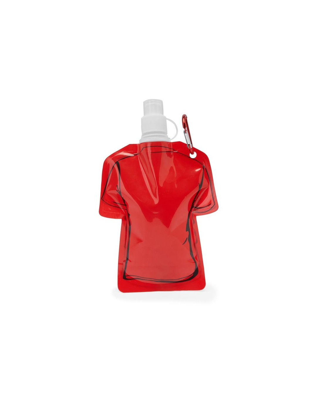 Bottiglia flessibile in PET a forma di T-shirt, tappo di sicurezza e moschettone per il trasporto ,capacità 470 ml.