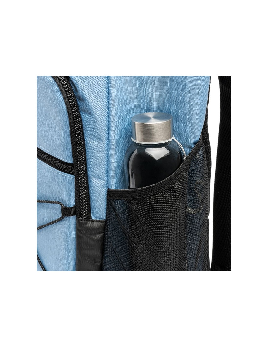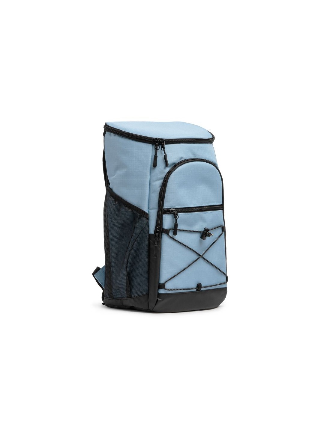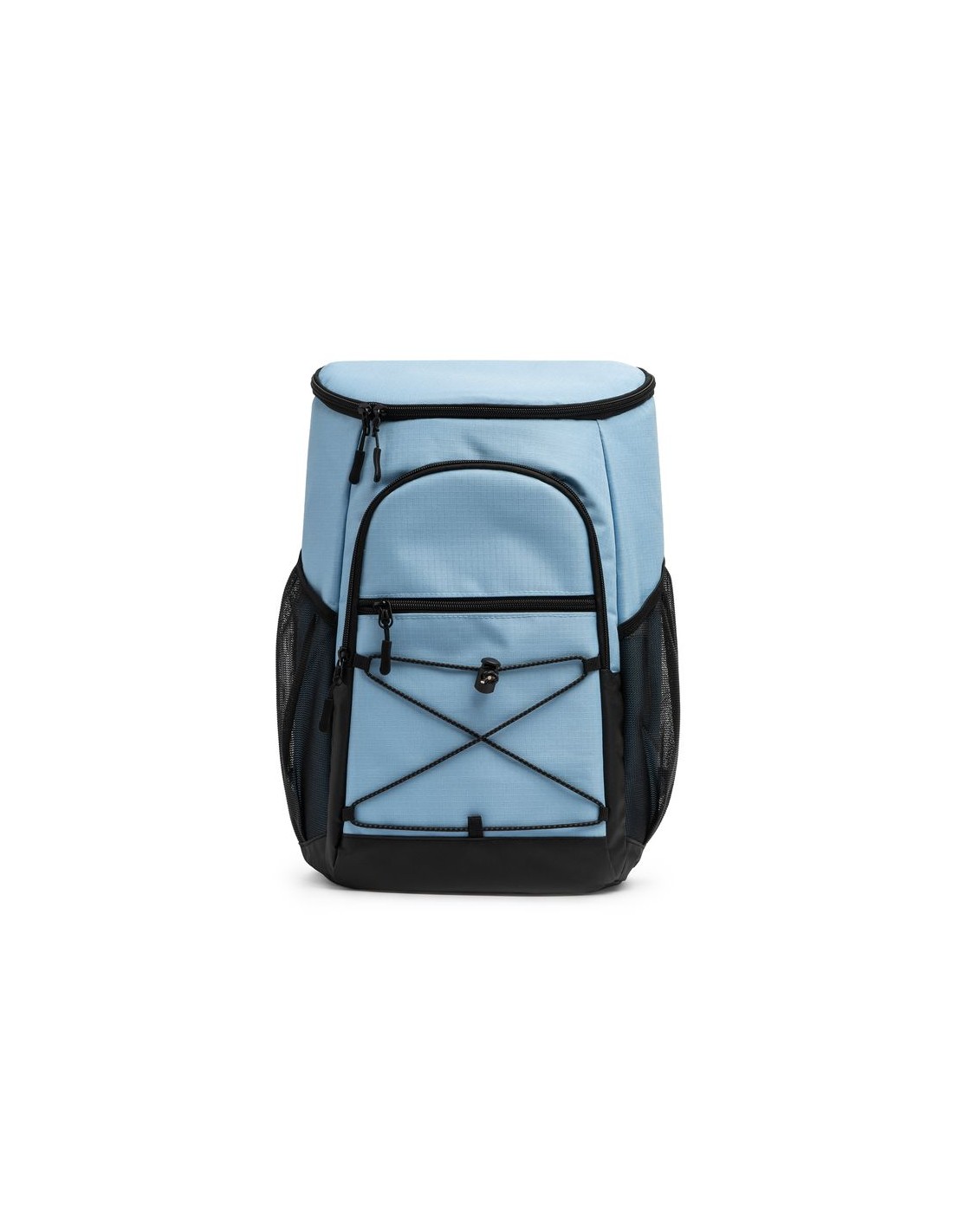 Zaino termico in poliestere ripstop 210D, fodera isotermica nelle tasche principali e in quelle anteriori, scomparto anteriore con cordino elastico e tasche laterali a rete, capacità 20 litri, schienale e spallacci imbottiti.