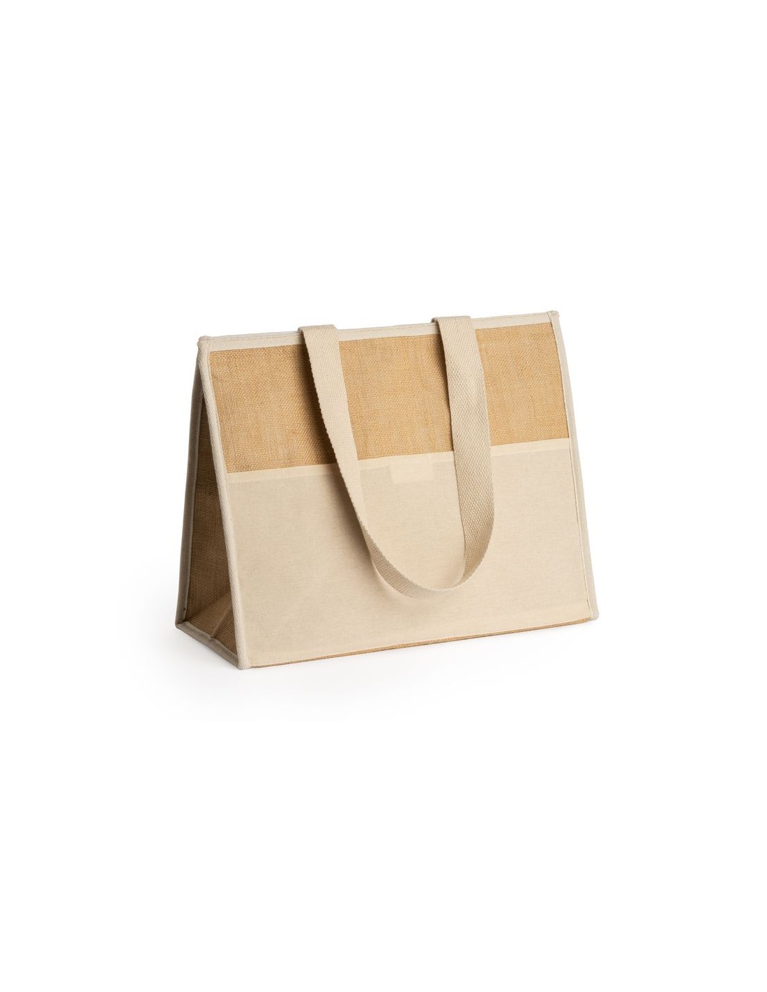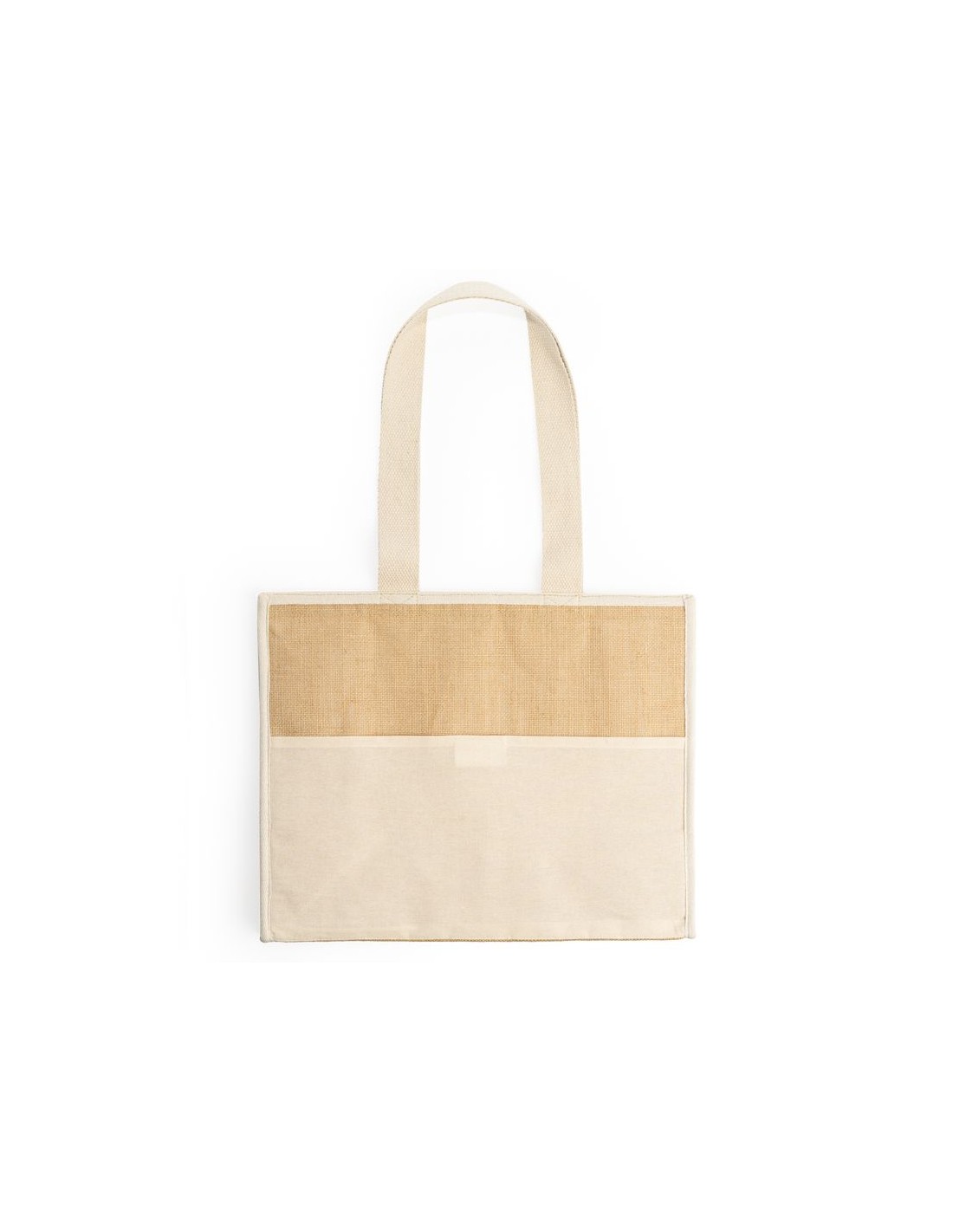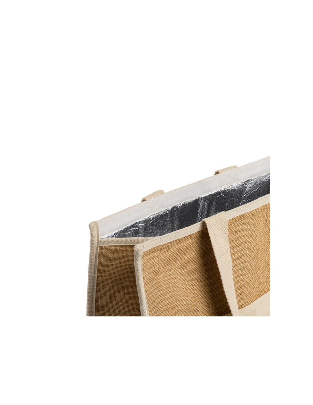 Borsa termica in juta laminata, interno in alluminio isotermico con chiusura in velcro, mantieni il tuo cibo e le tue bevande a una buona temperatura, tasca frontale e maniglie in cotone naturale.