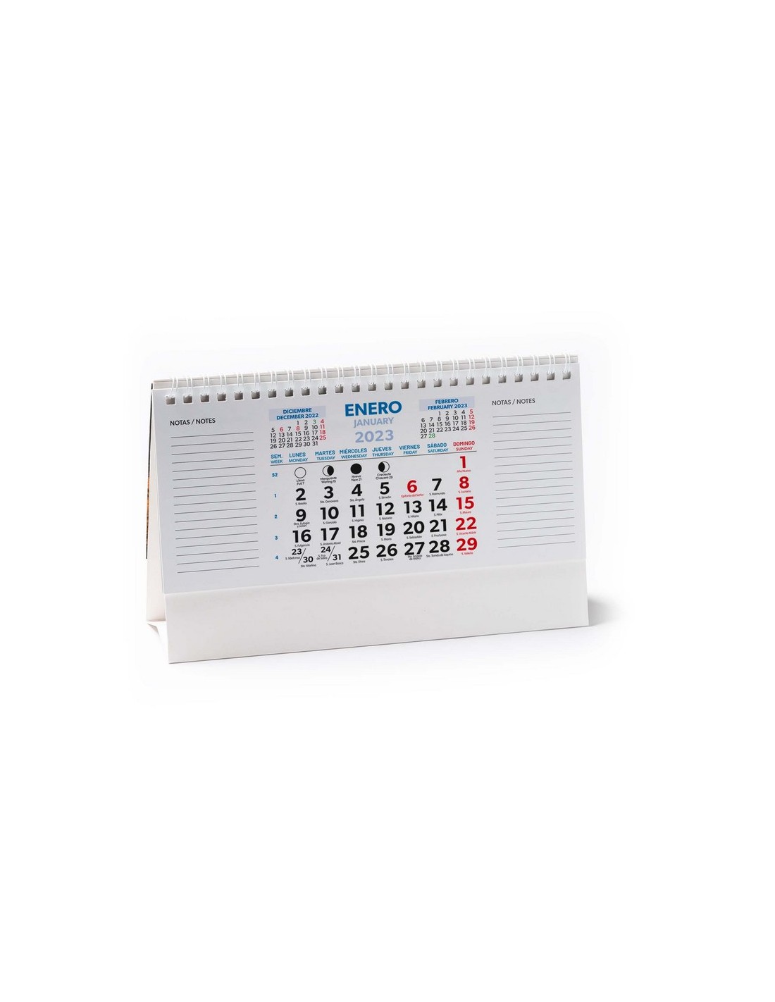 Calendario da tavolo orizzontale con anelli, grafica del mese corrente/mese precedente/mese successivo/Calendario annuale, include i santi, supporto in cartone ideale per la stampa.
