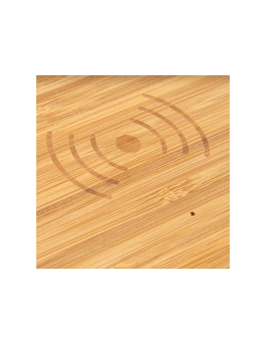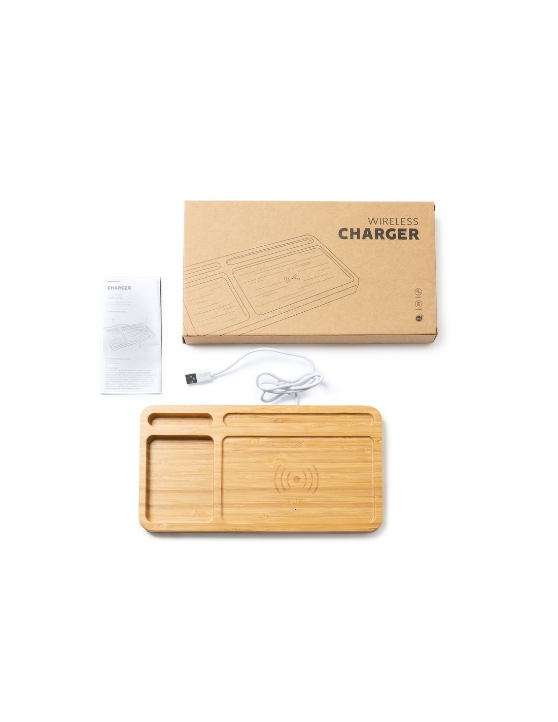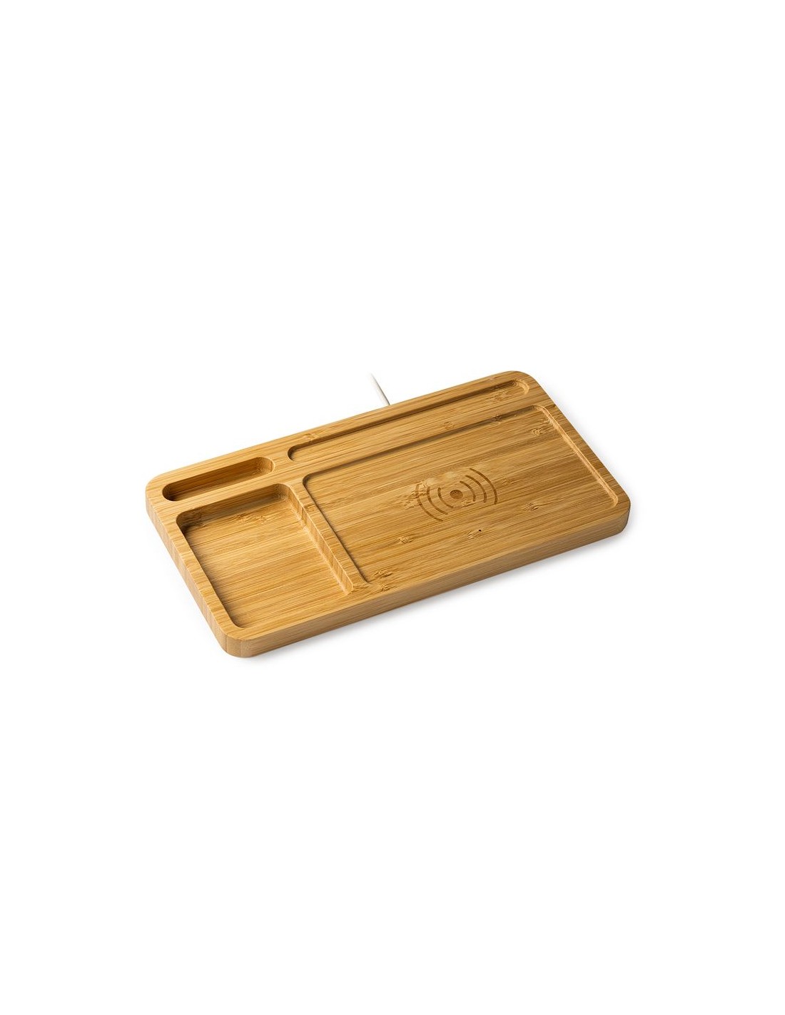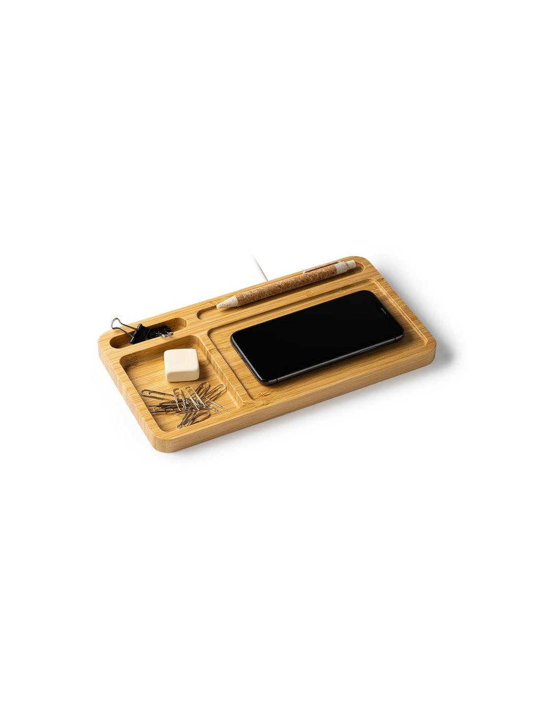 Caricatore wireless in bambù naturale integrato nel vassoio organizer, compatibile con i modelli con tecnologia di ricarica wireless, DC5V, cavo bianco incluso, confezione in scatola eco design.
