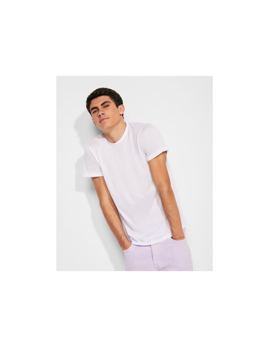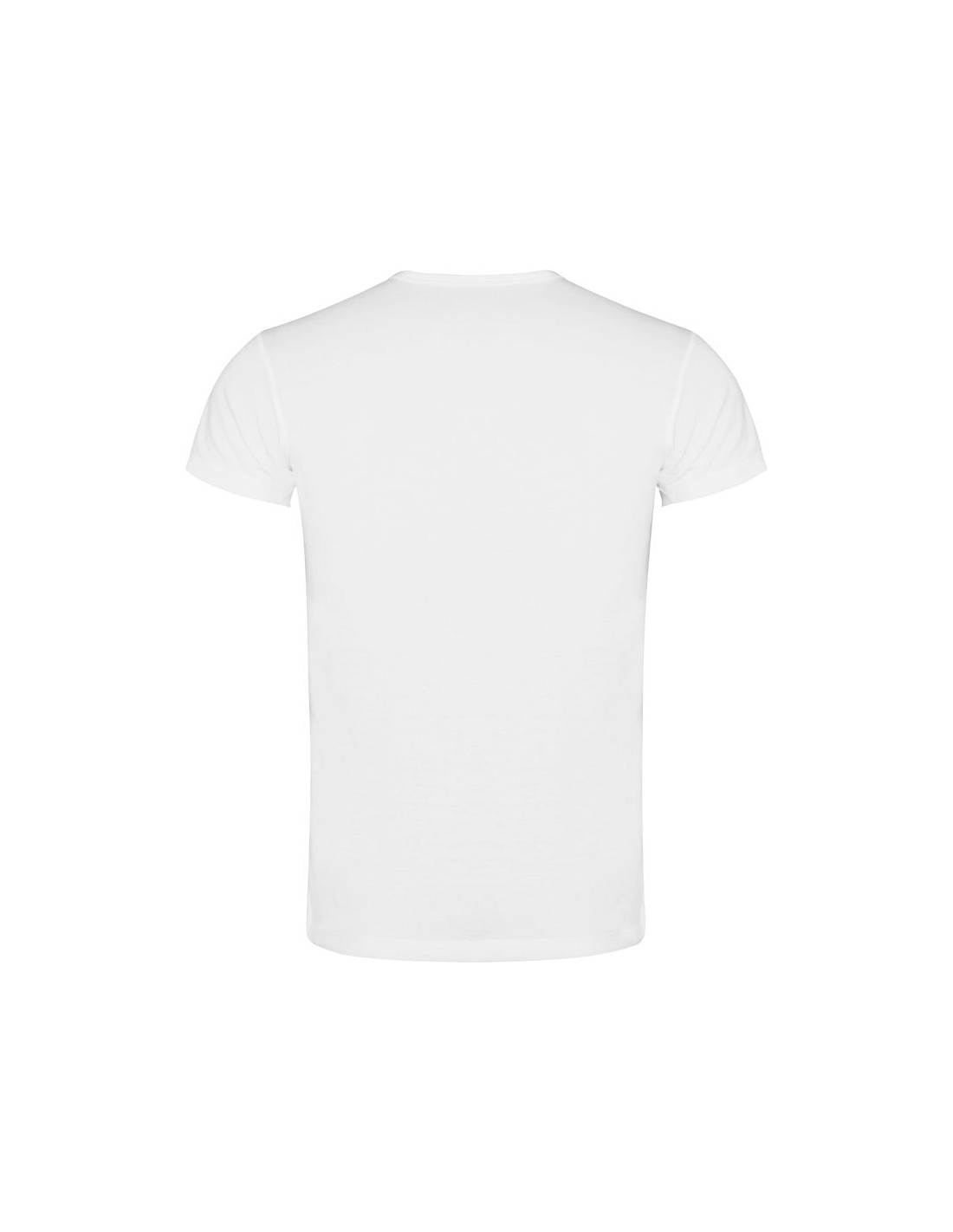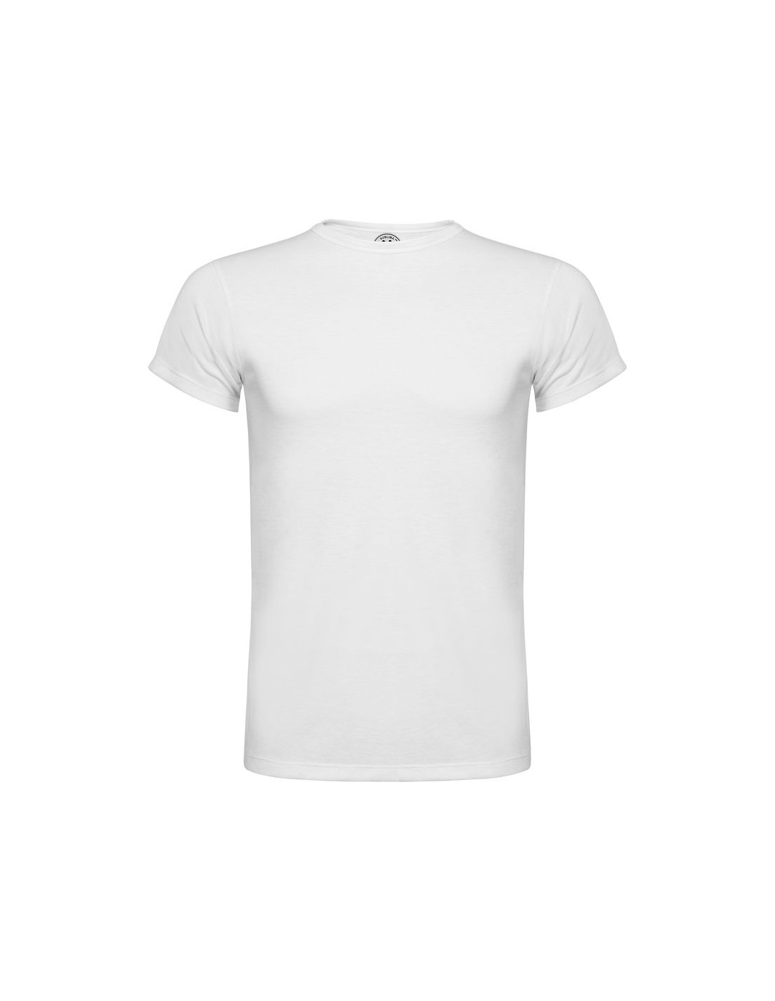 T-shirt manica corta, girocollo taglio vivo nello stesso stesso tessuto e cuciture laterali. Realizzata in tessuto di poliestere al tatto cotone.