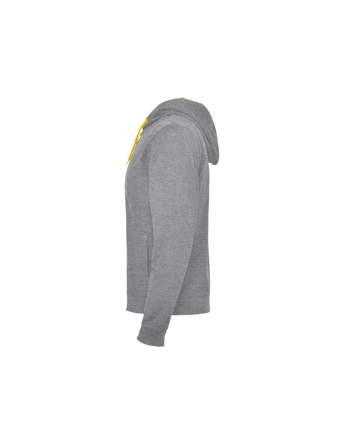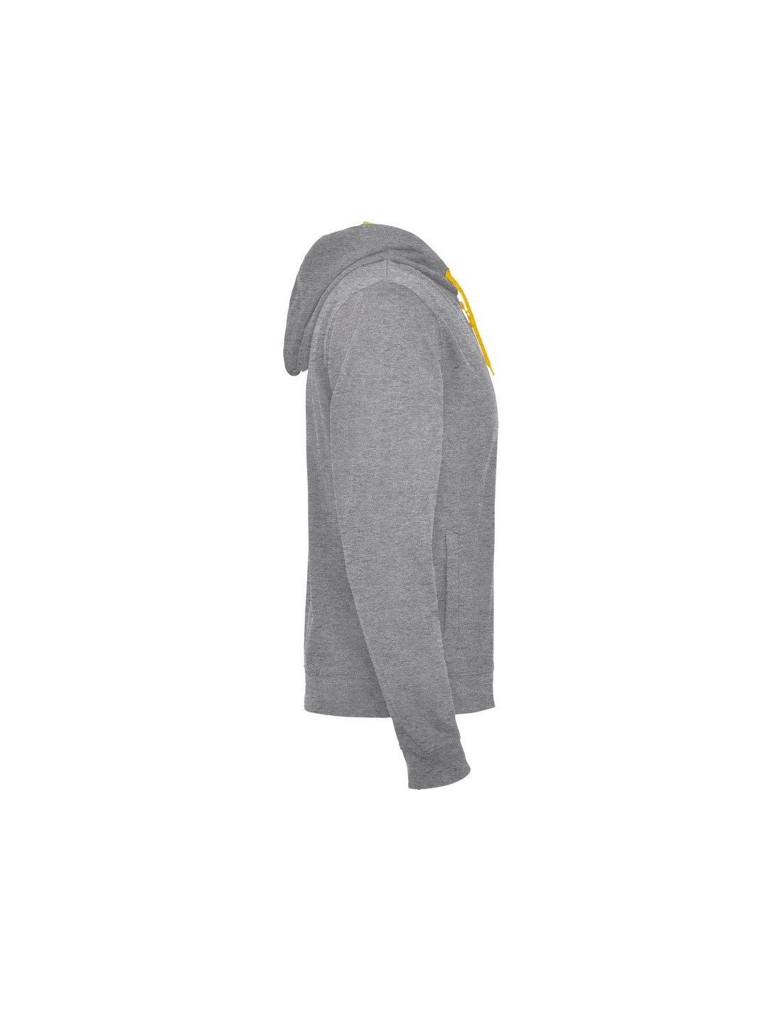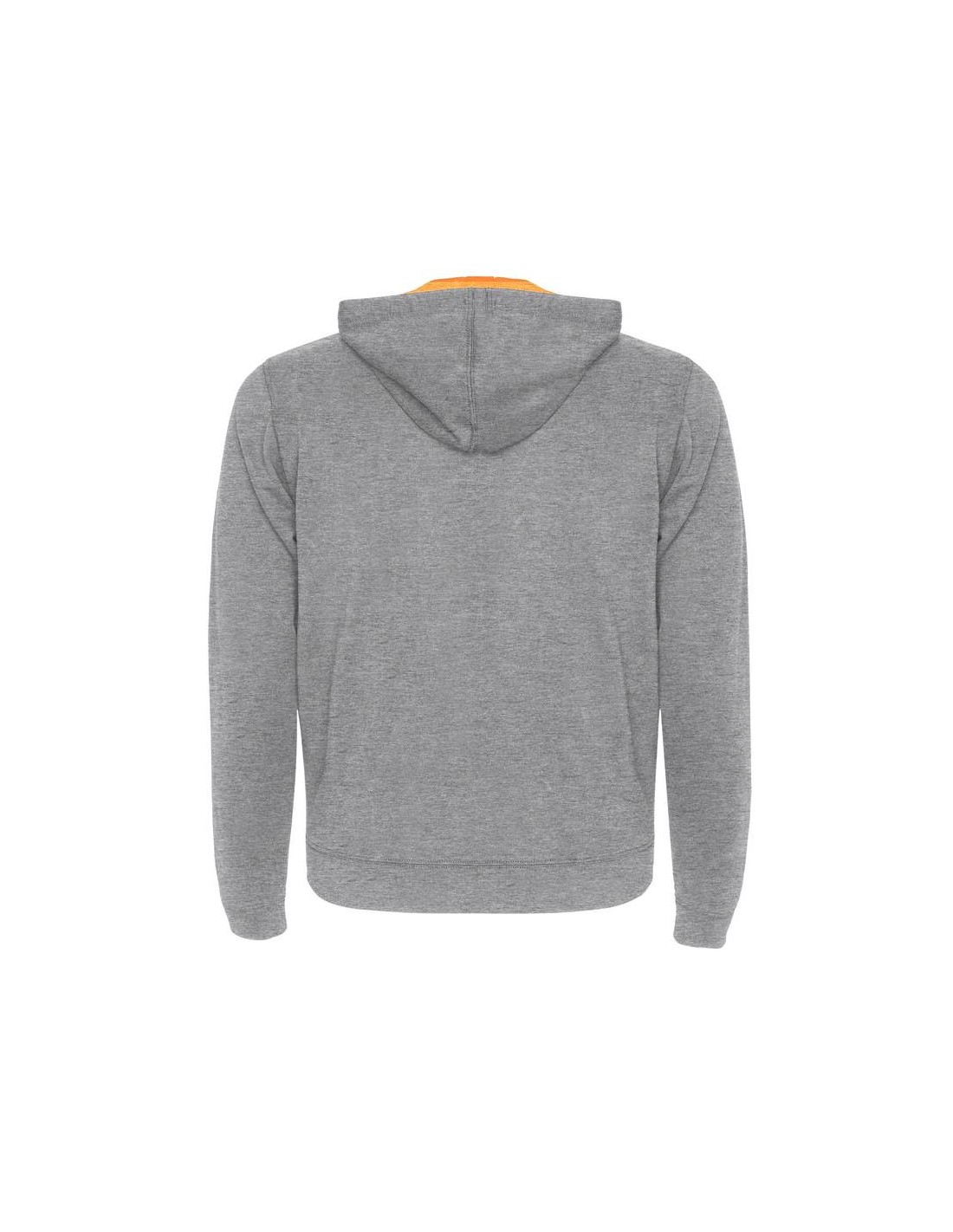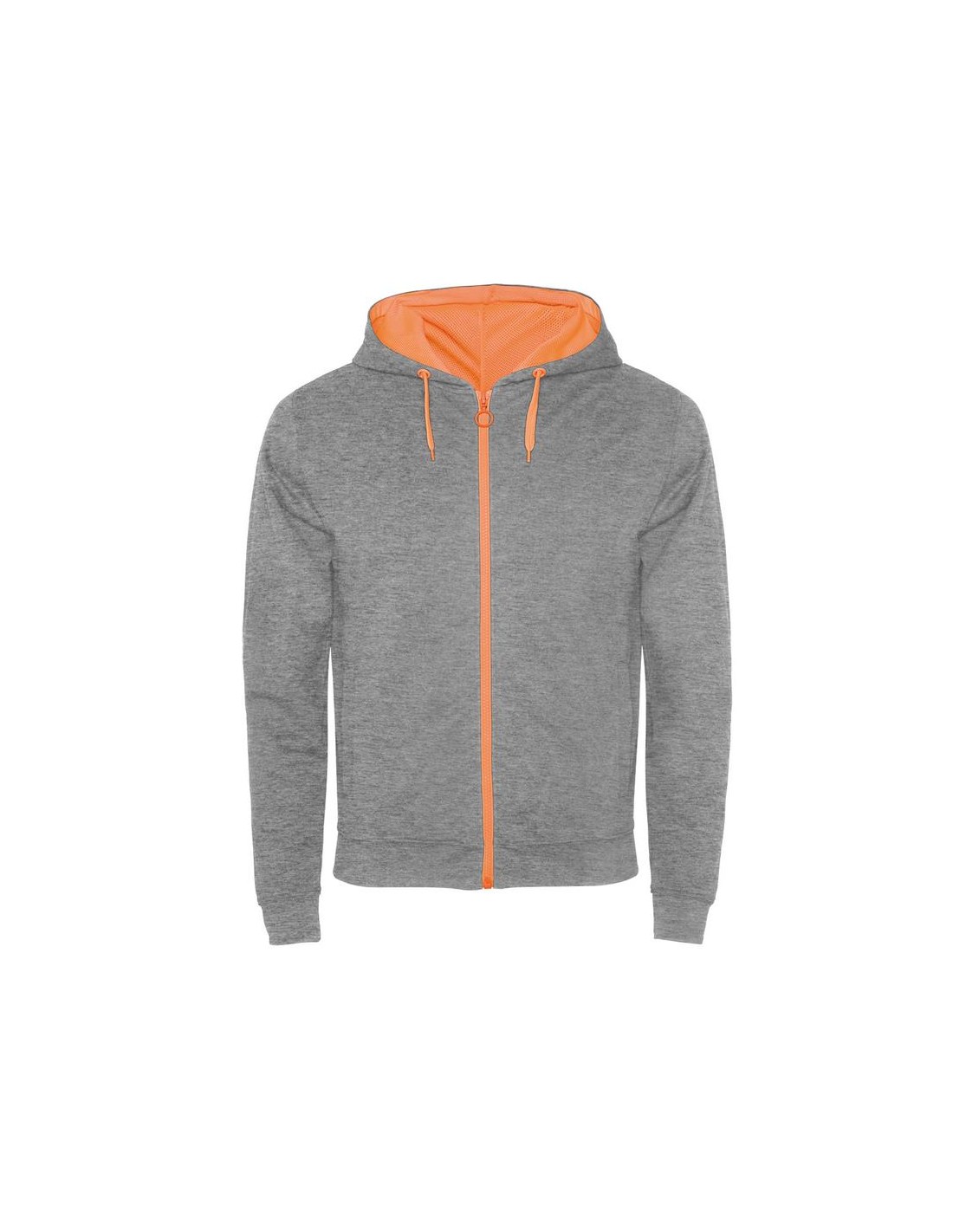 Giacca non felpata con particolari in colore fluorescente. Zip centrale con tiretto ad anello a contrasto in colore fluo. Cappuccio con fodera in tessuto poliestere microforato a contrasto colore fluo, coulisse e occhielli in metallo a contrasto colore fluo. Maniche lunghe con polsini e girovita in costina 1x1. Due tasche anteriori con ampie cuciture a vista. Copri cuciture rinforzate all'interno del collo.