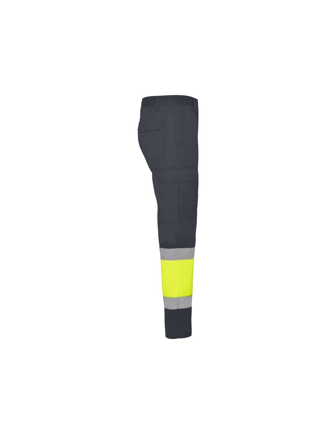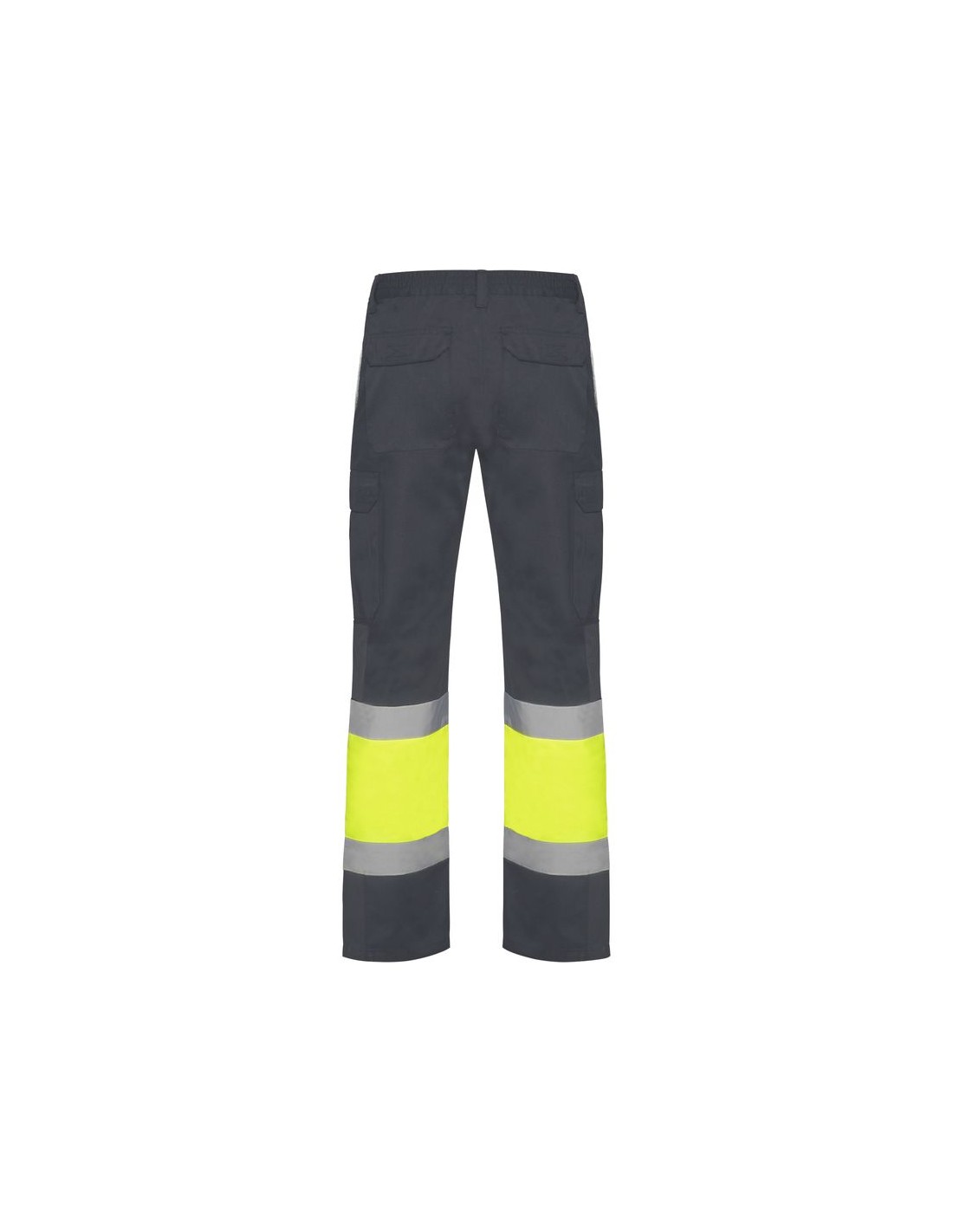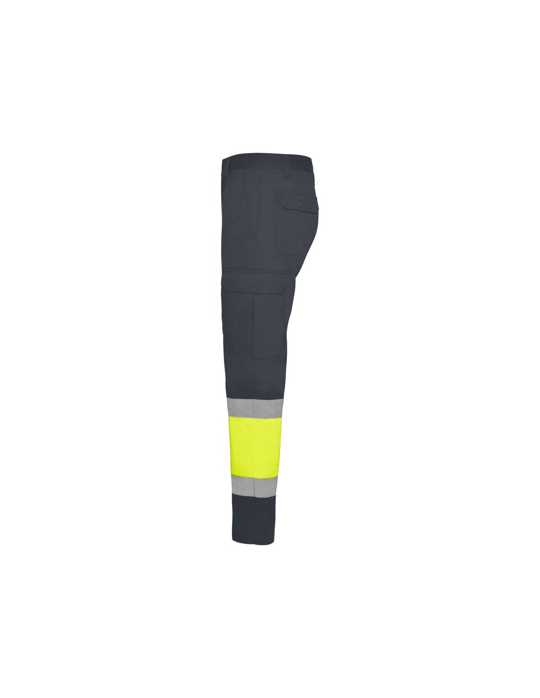 Pantaloni multitasca estivi alta visibilità, elastico in vita sul retro, due tasche con patta sul retro con chiusura in velcro, due tasche sul davanti e due tasche laterali con soffietto e patta con chiusura in velcro, bicolore con bande riflettente.