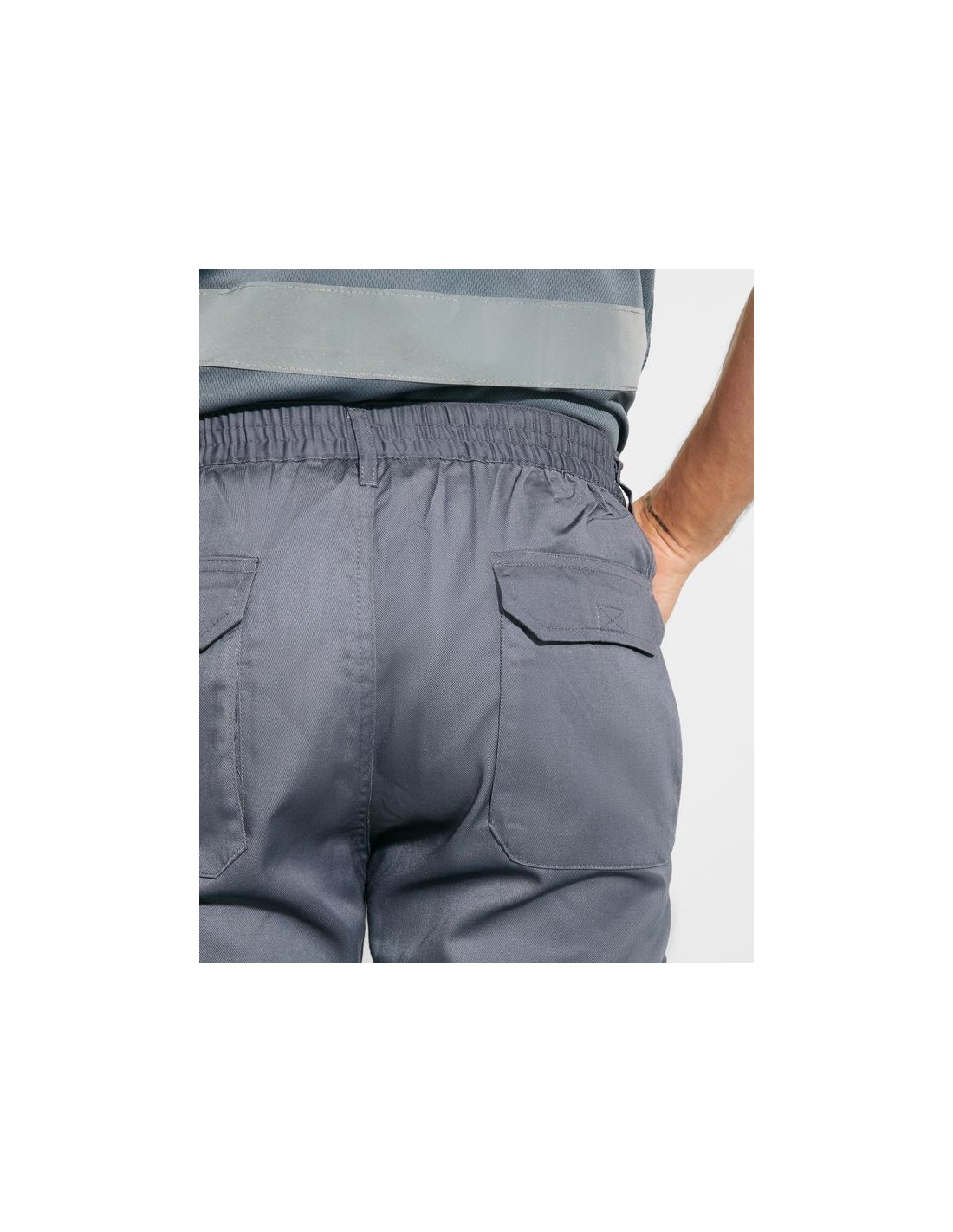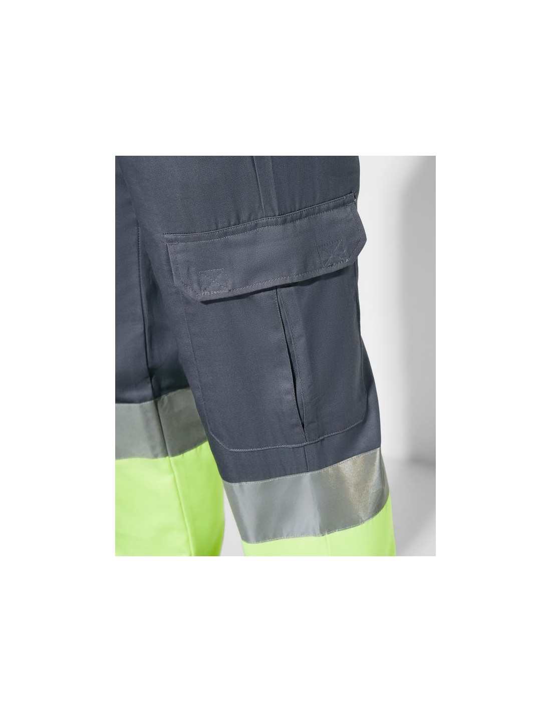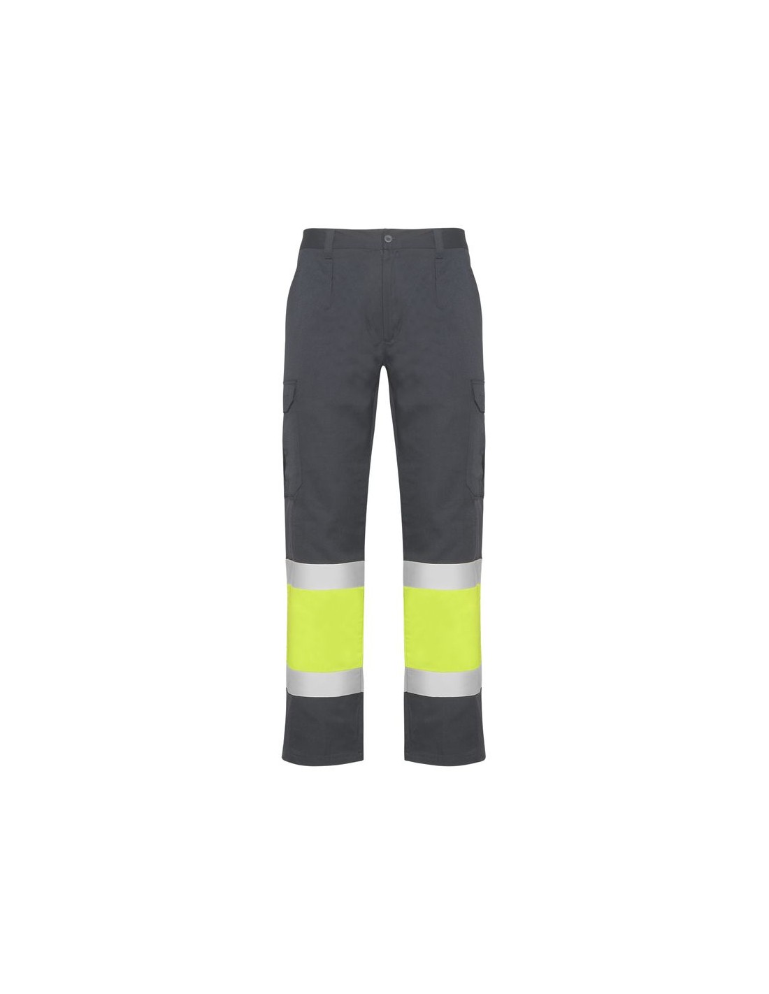 Pantaloni multitasca estivi alta visibilità, elastico in vita sul retro, due tasche con patta sul retro con chiusura in velcro, due tasche sul davanti e due tasche laterali con soffietto e patta con chiusura in velcro, bicolore con bande riflettente.