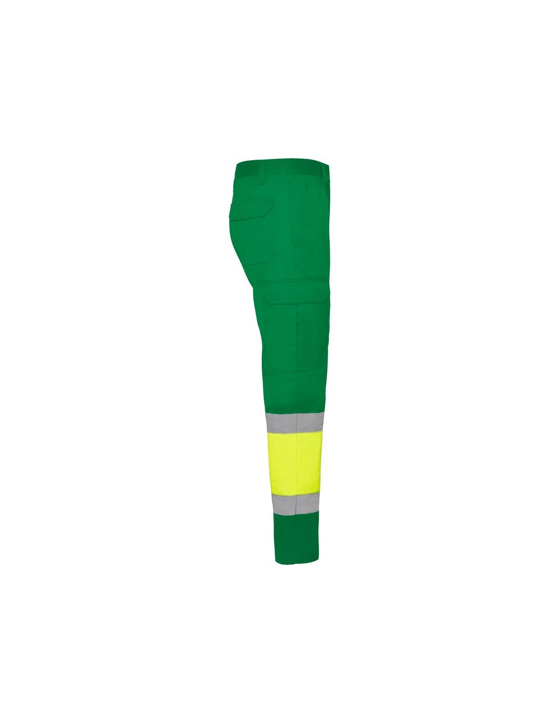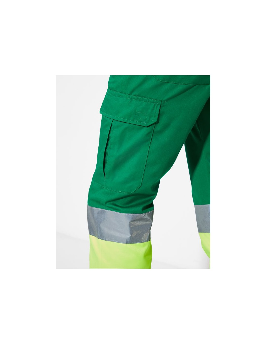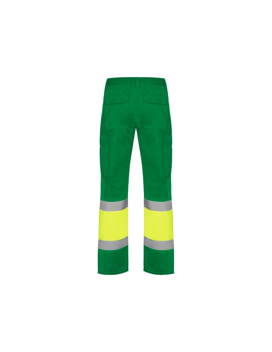 Pantaloni multitasche invernale alta visibilità, elastico in vita sul retro, due tasche con patta sul retro con chiusura in velcro, due tasche sul davanti e due tasche laterali con soffietto e patta con chiusura in velcro, bicolore con bande riflettenti.