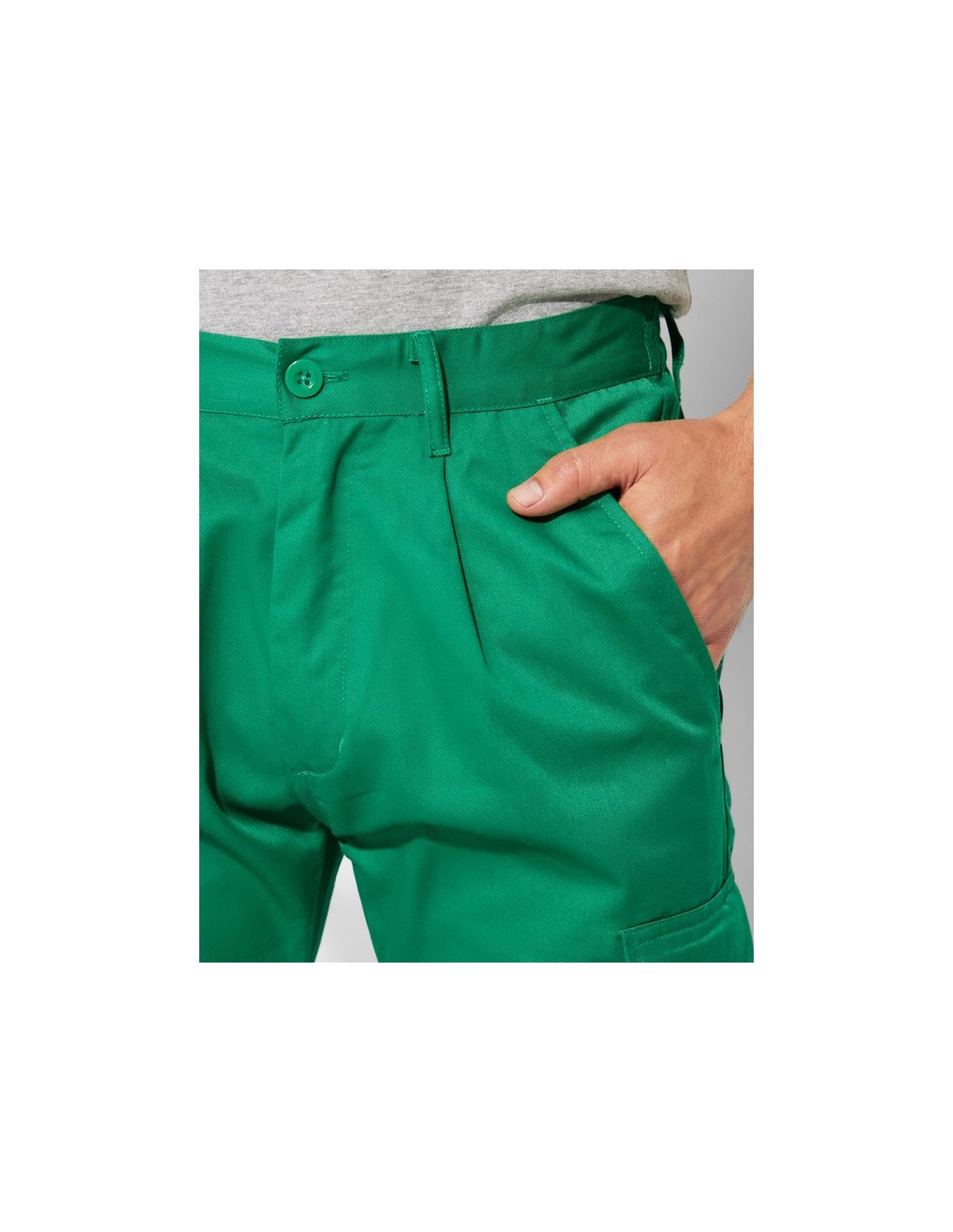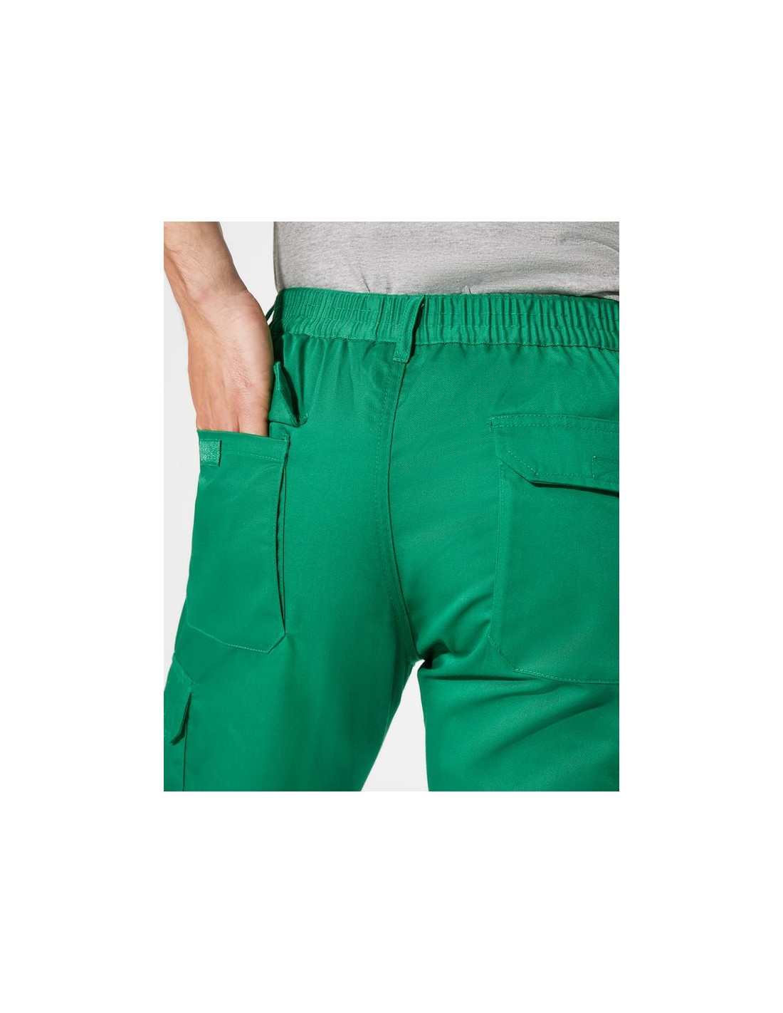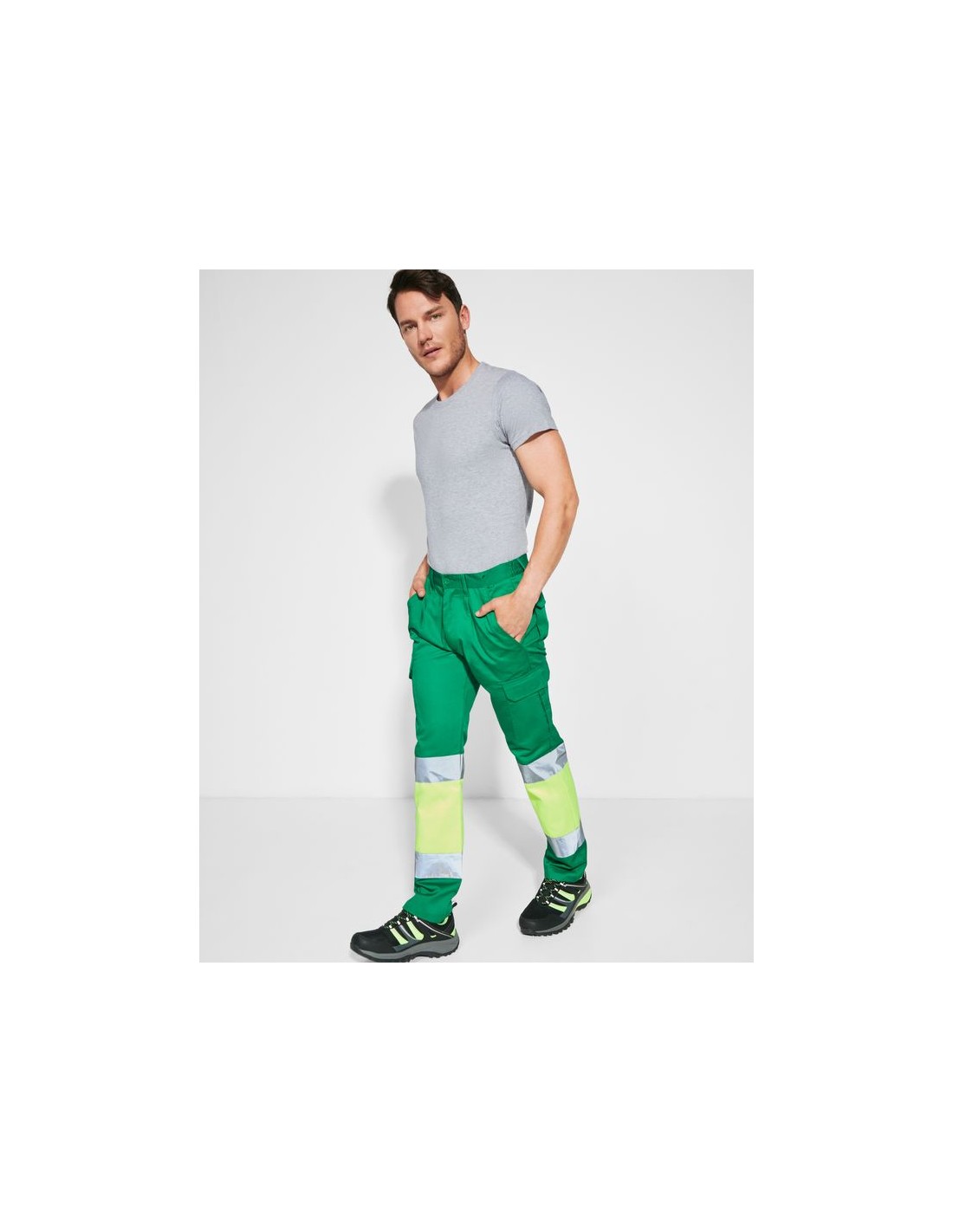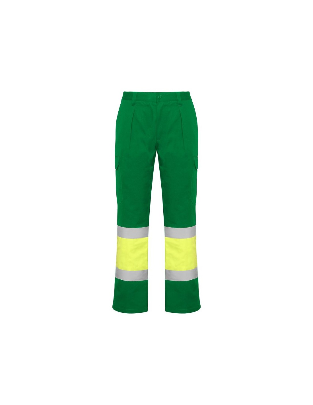 Pantaloni multitasche invernale alta visibilità, elastico in vita sul retro, due tasche con patta sul retro con chiusura in velcro, due tasche sul davanti e due tasche laterali con soffietto e patta con chiusura in velcro, bicolore con bande riflettenti.
