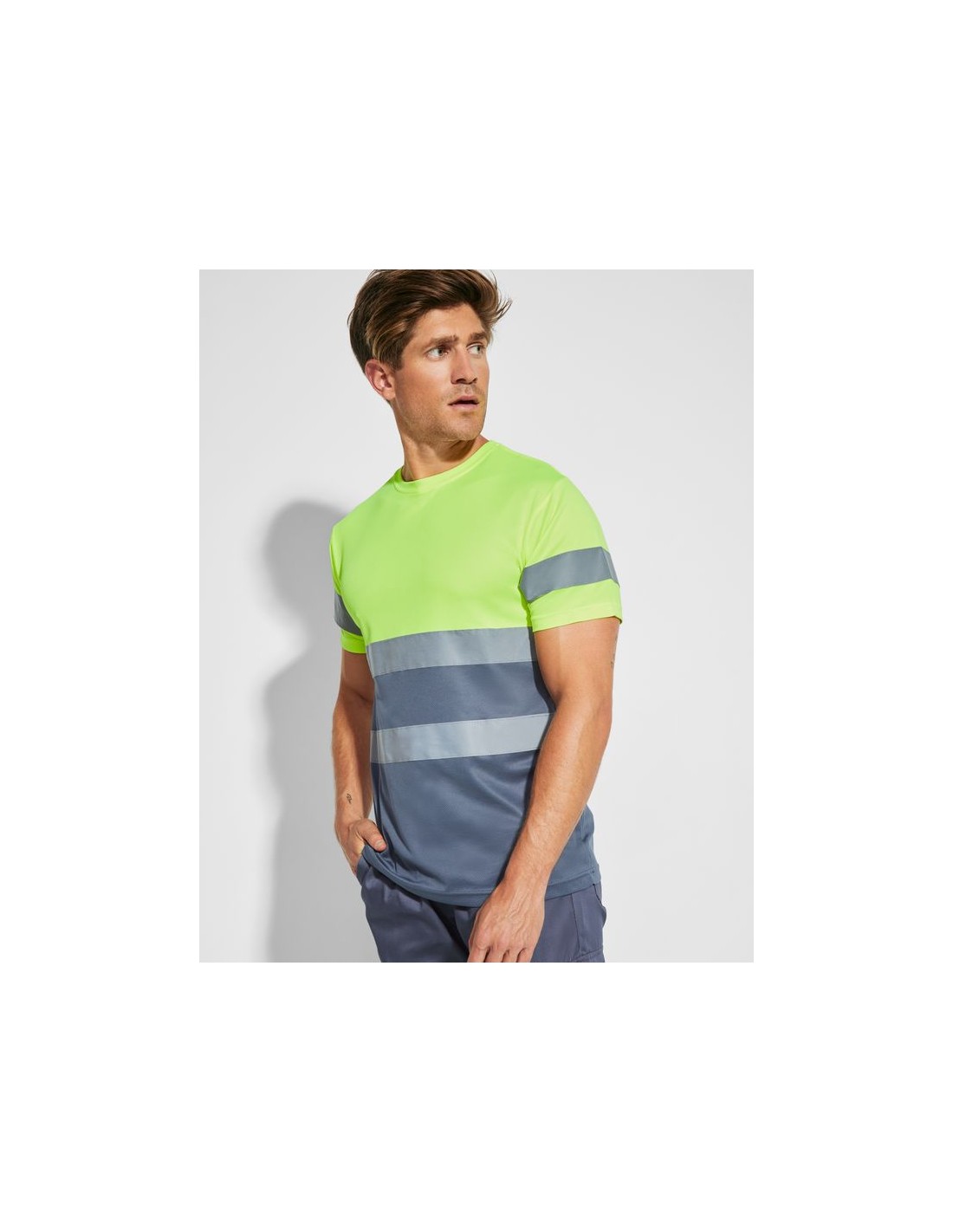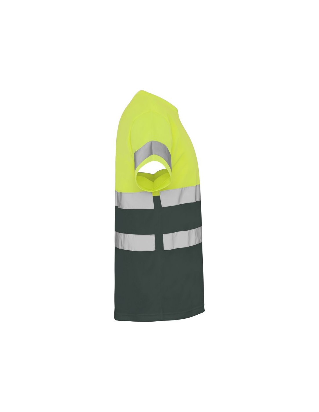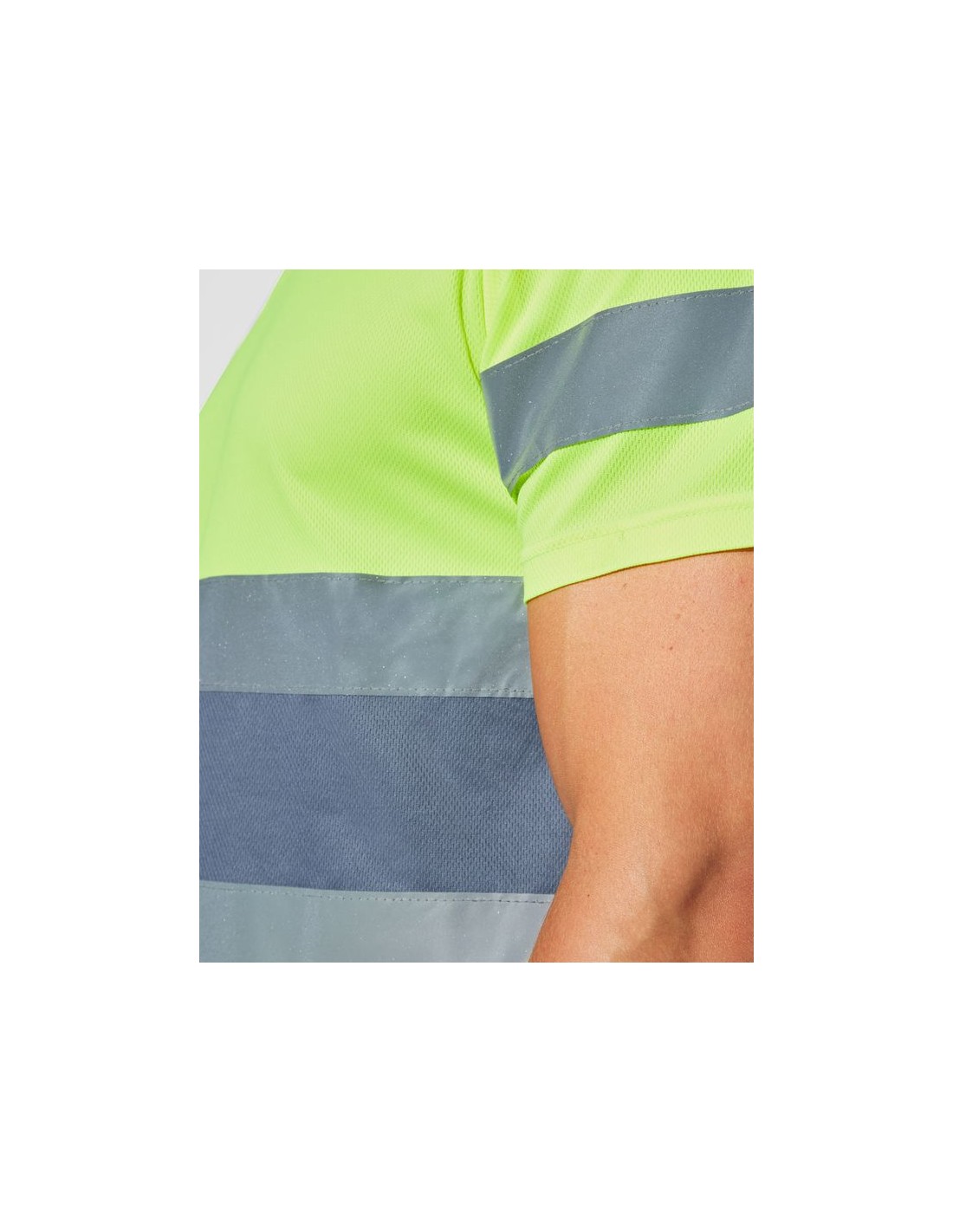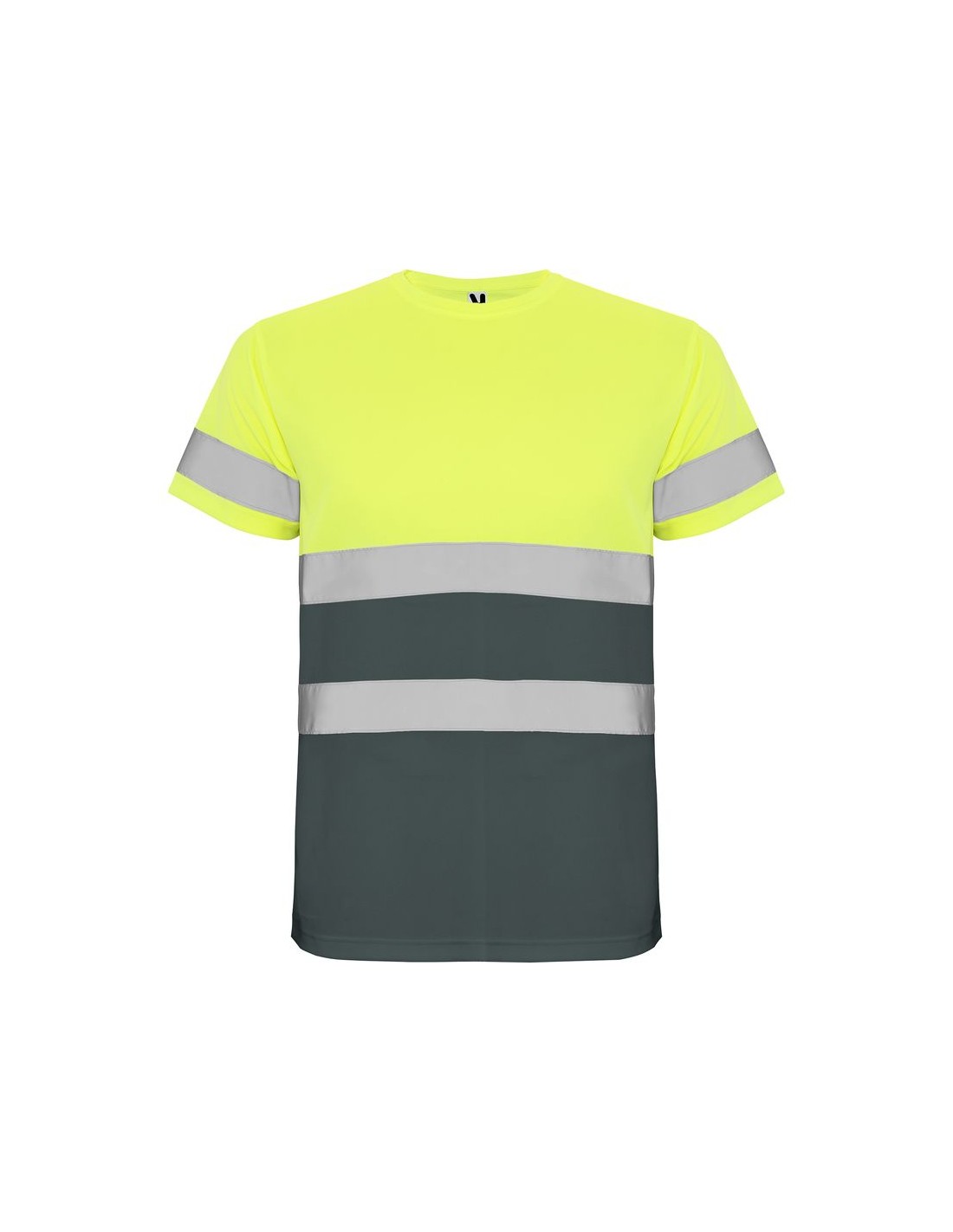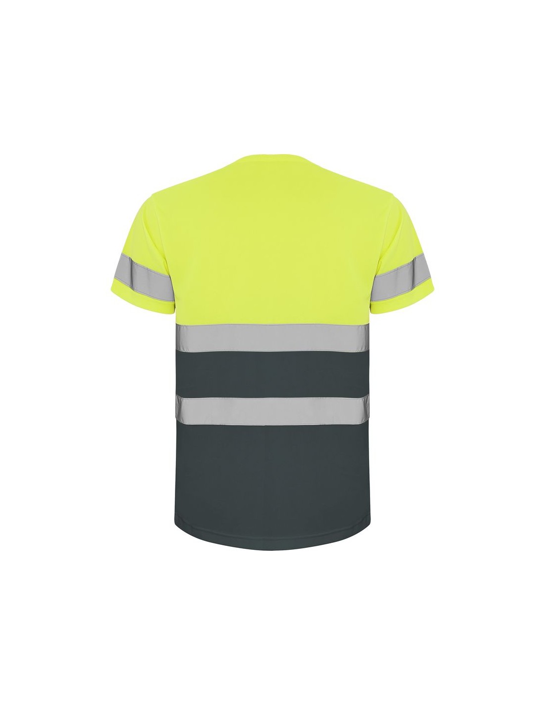 Maglietta tecnica maniche corte ad alta visibilità, girocollo nello stesso tessuto, con cuciture rinforzate nella parte interna del collo, due strisce riflettenti orizzontali sul torso ed una sulle maniche.
