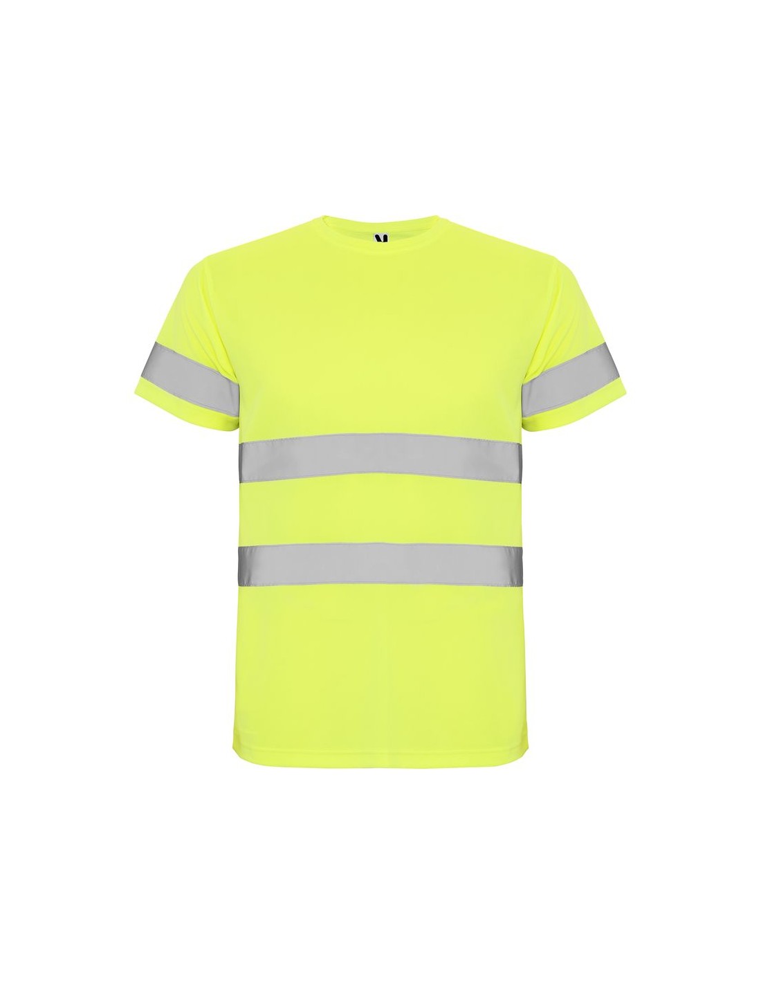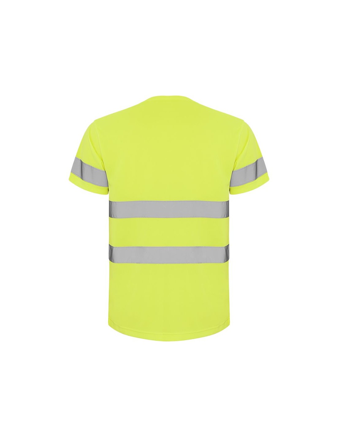 Maglietta tecnica maniche corte ad alta visibilità, girocollo nello stesso tessuto, con cuciture rinforzate nella parte interna del collo, due strisce riflettenti orizzontali sul torso ed una sulle maniche.