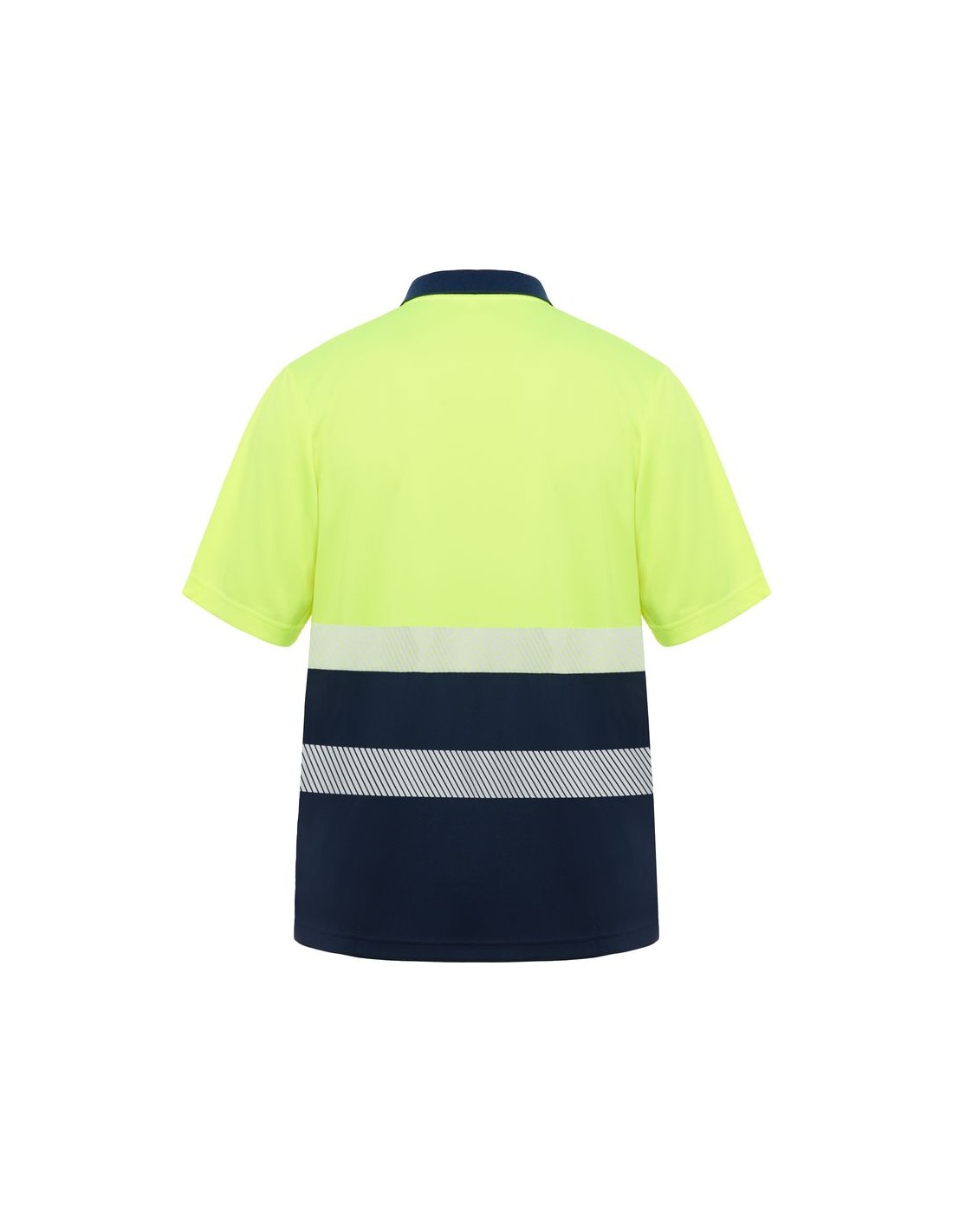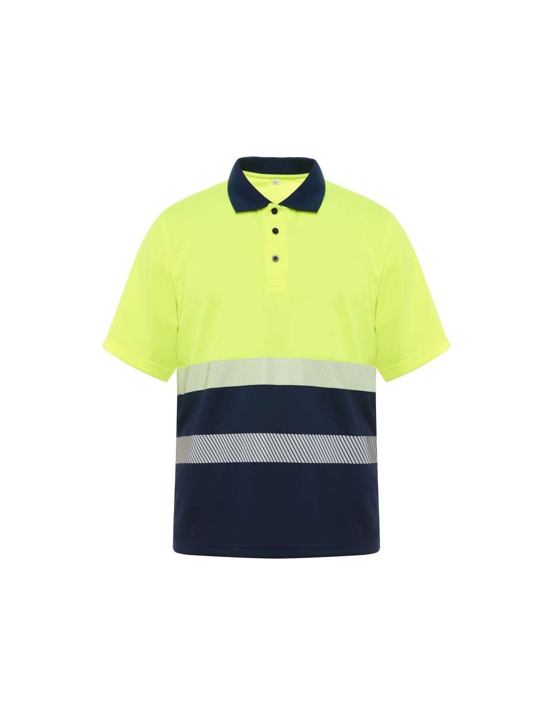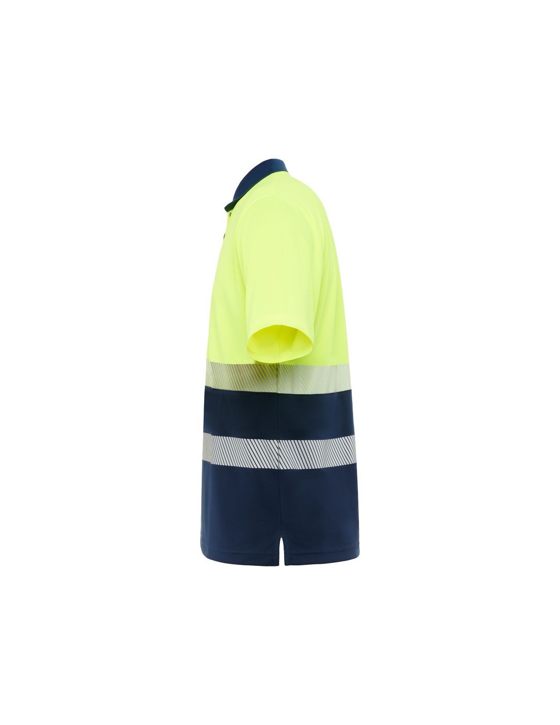 Polo tecnica ad alta visibilità a maniche corte, due bande riflettenti segmentate sul petto e sulla schiena, pattina con 3 bottoni a contrasto, colletto in maglia a coste 1x1, tessuto antistrappo e di facile asciugatura, tasca opzionale.