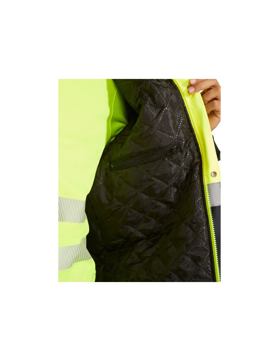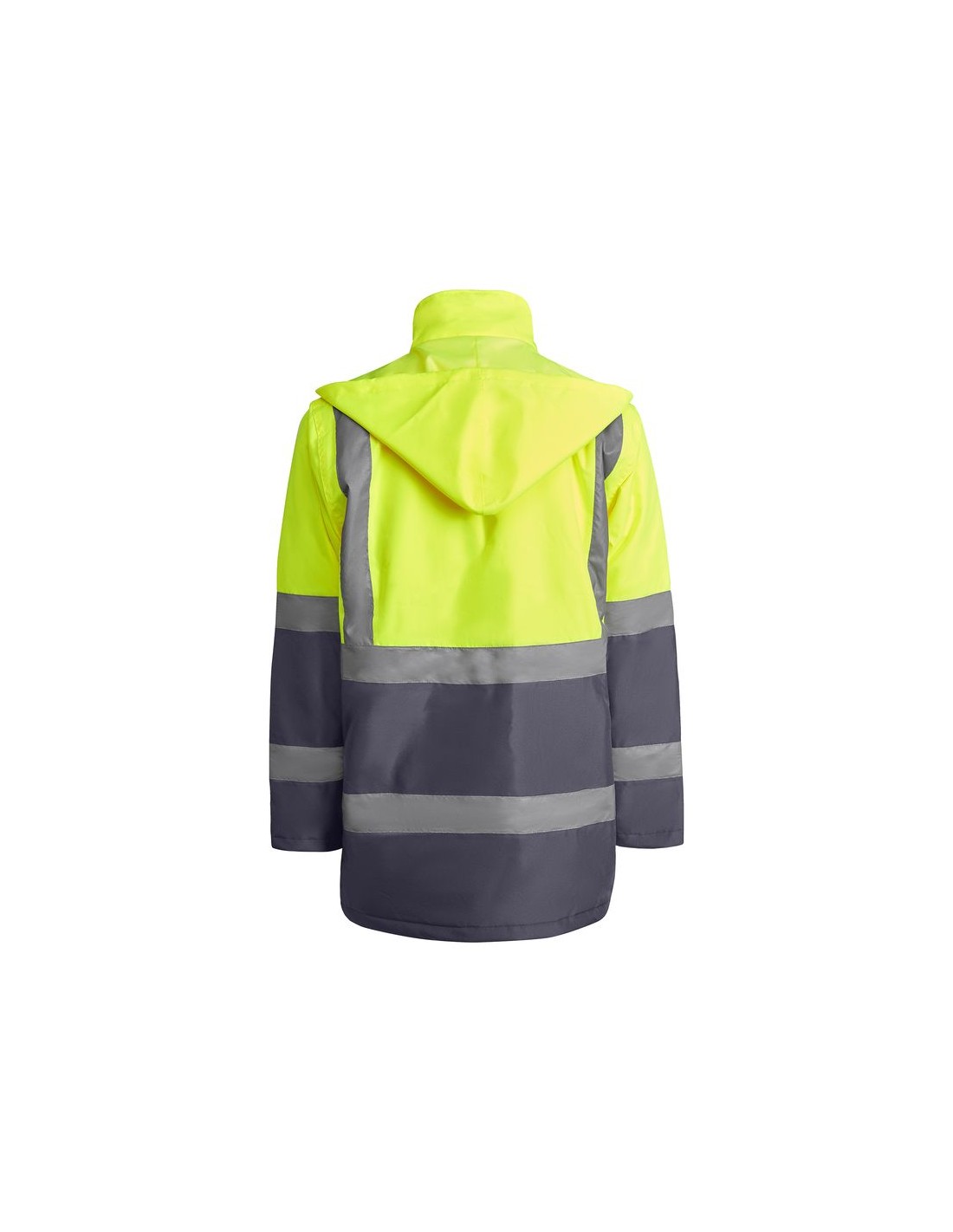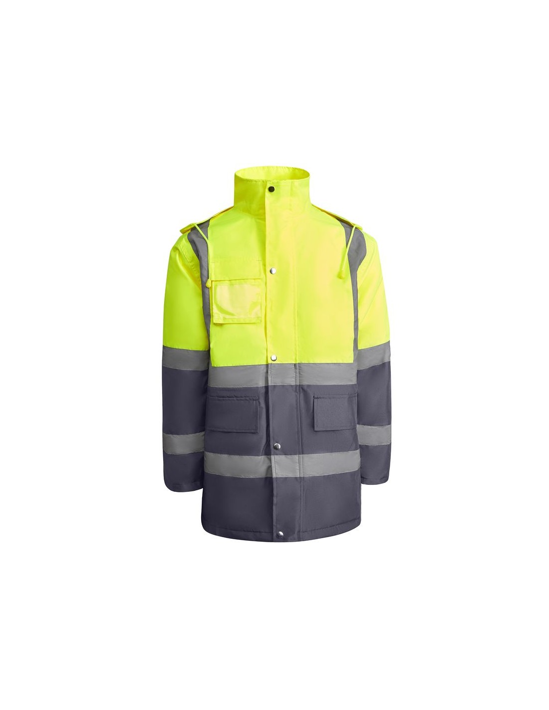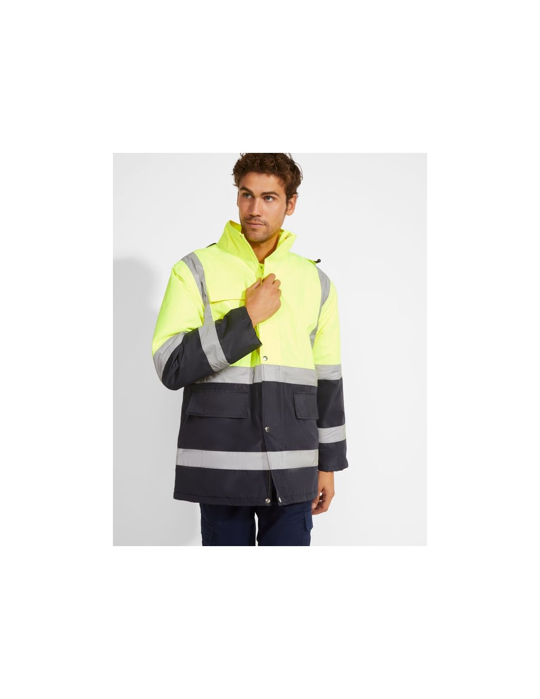 Non dimenticare di salvare la tua personalizzazione per poter riempire il carrelloParka trapuntato combinato ad alta visibilità, cappuccio arrotolabile con coulisse regolabile, due strisce orizzontali riflettenti su busto e maniche e strisce verticali riflettenti sulle spalle, tasca sul petto con patta e chiusura a velcro e porta carte d'identità, due tasche anteriori con patta, tasca interna con cerniera, polsini nascosti sulle maniche in maglia a coste 1X1, abbottonatura centrale con bottoni in metallo per la chiusura e zip centrale a doppio cursore, accesso interno per la stampa serigrafica.