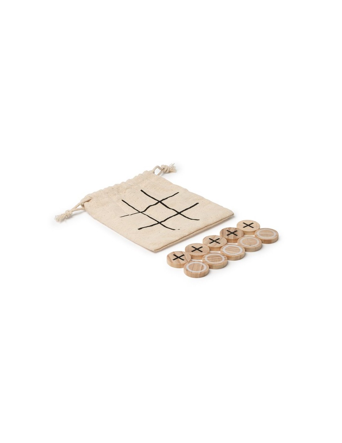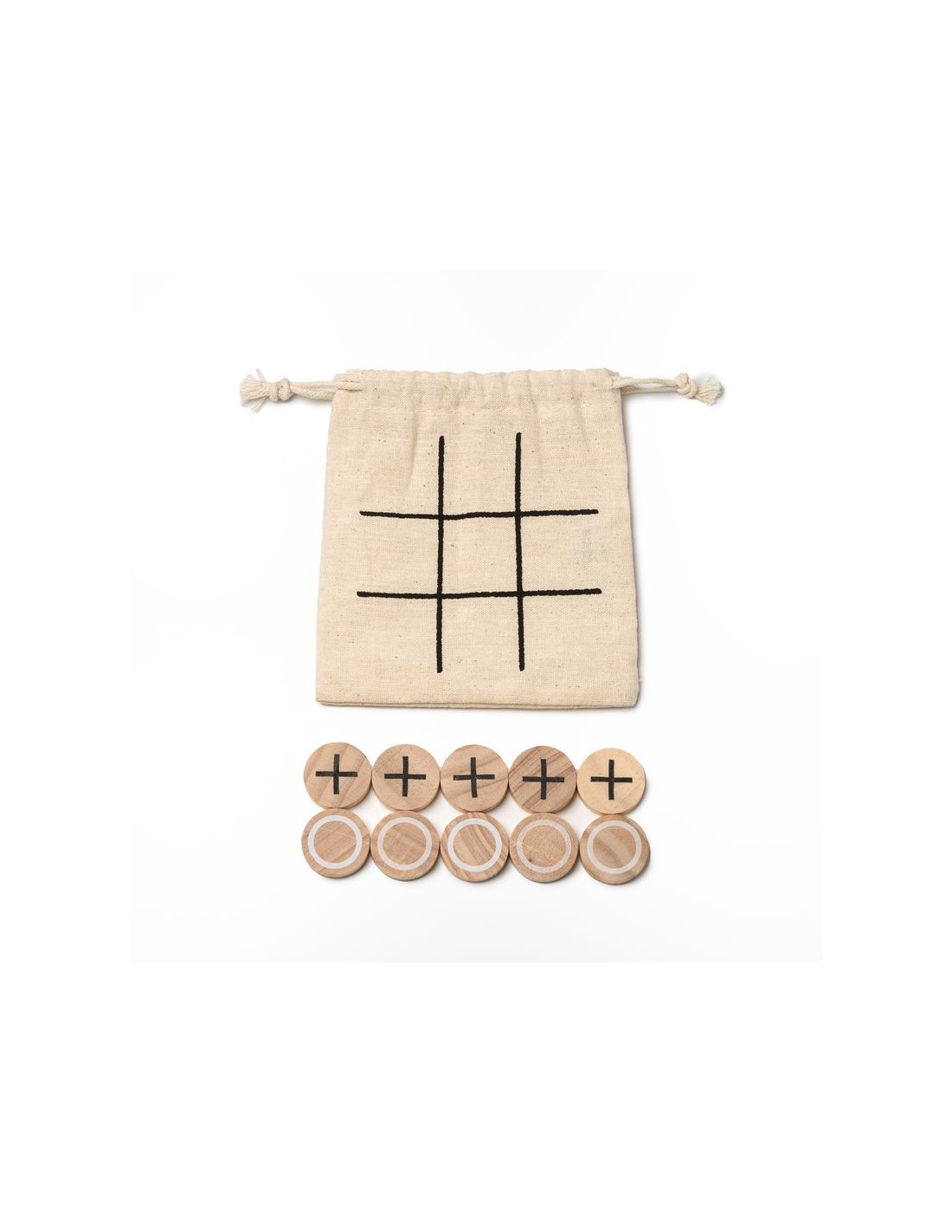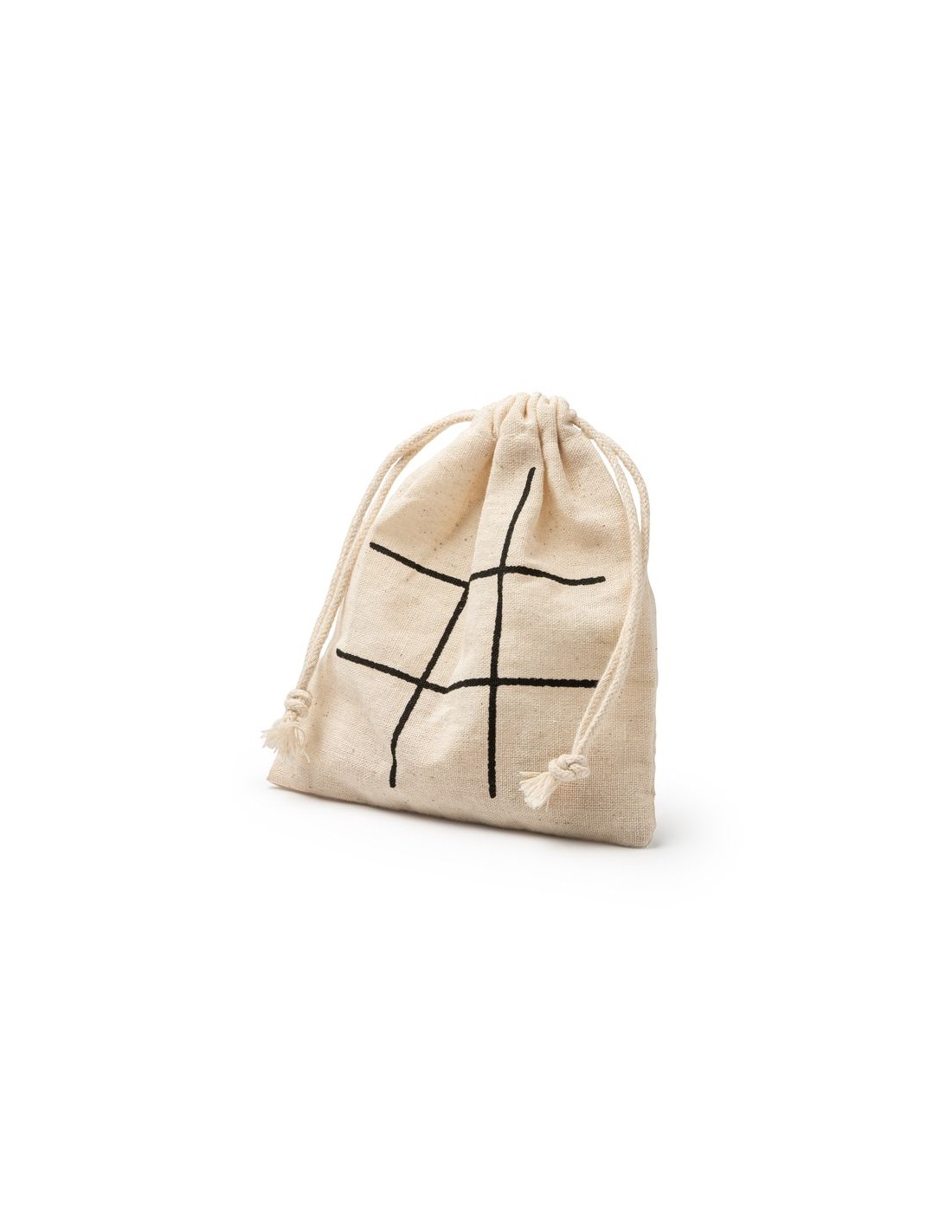 Gioco di tris in legno, include 10 pezzi contenuti in un sacchetto di cotone naturale.