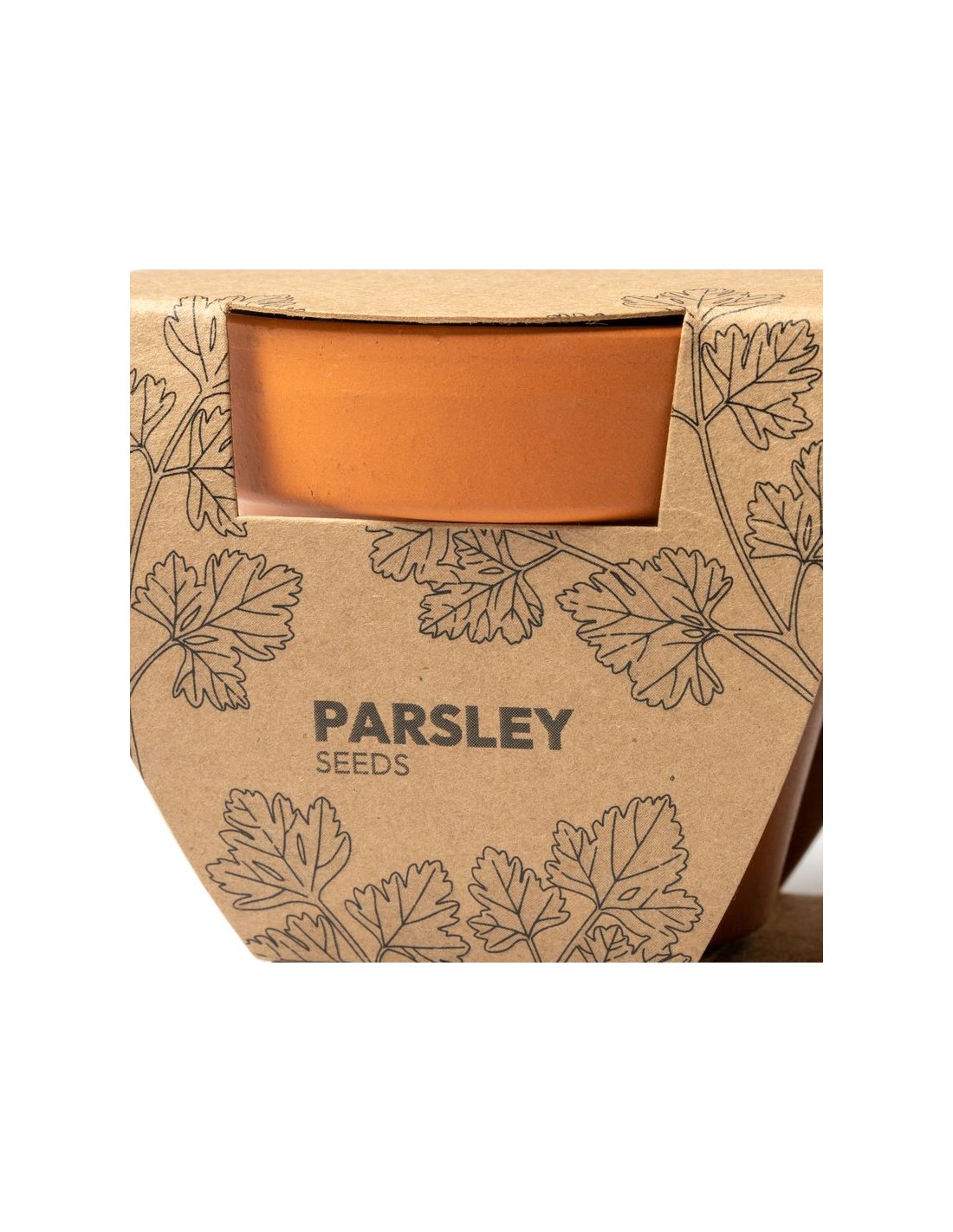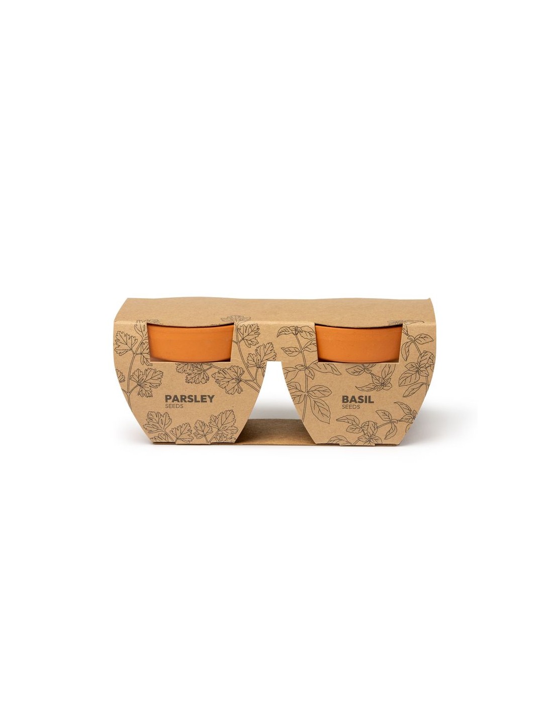 Set di due vasi da fiori con semi di prezzemolo e basilico, fondo incluso, prodotto nell'UE.