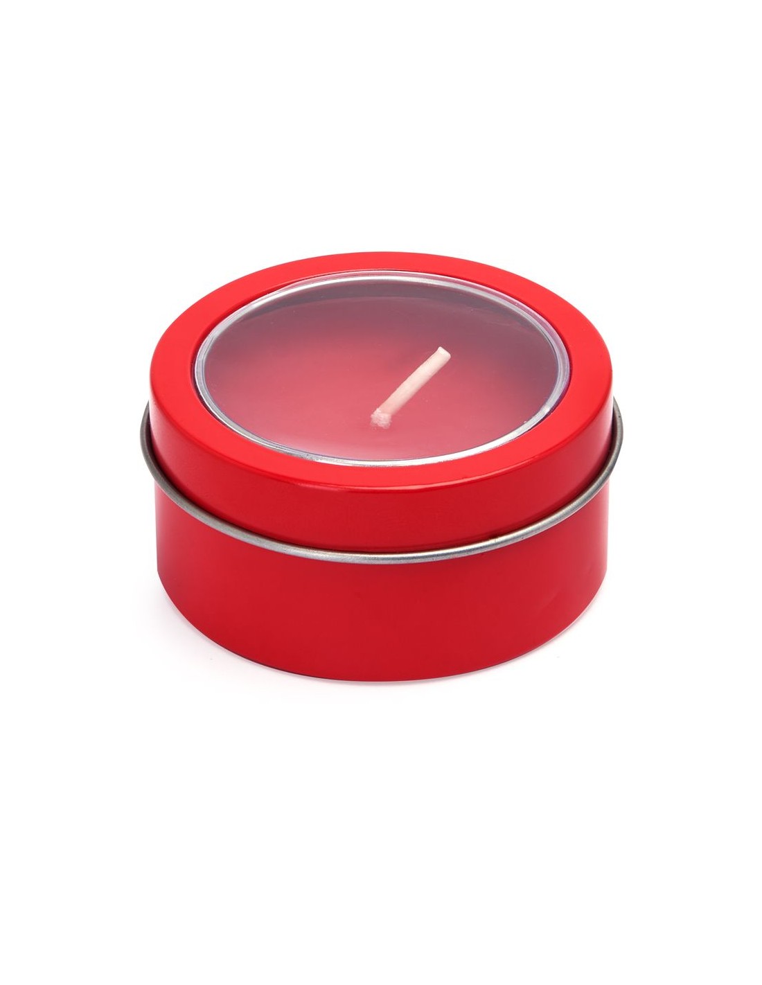 Candela profumata in contenitore metallico rotondo, con coperchio trasparente, colore della candela in tinta con il contenitore, stoppino bianco.