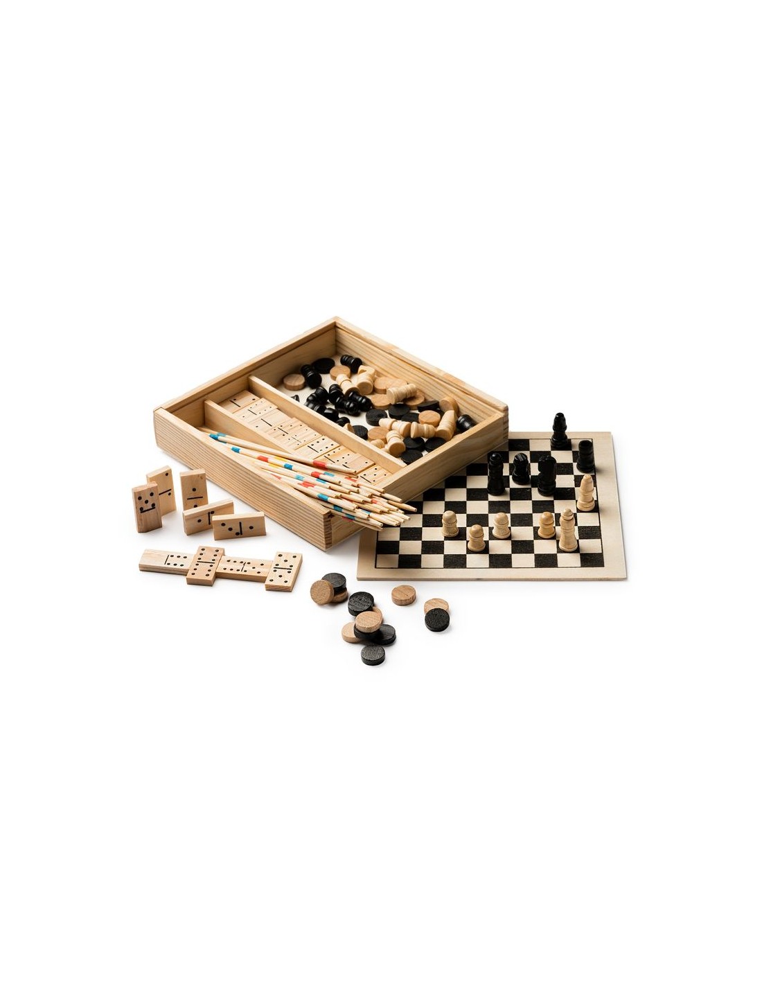 Set di 4 giochi di abilità: mikado, scacchi, dama e domino, presentato in una scatola con coperchio scorrevole con all'interno scacchiera da tavolo.