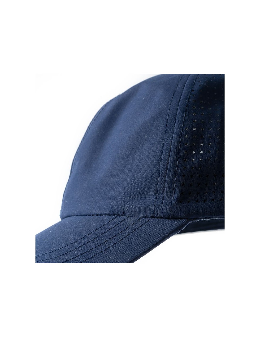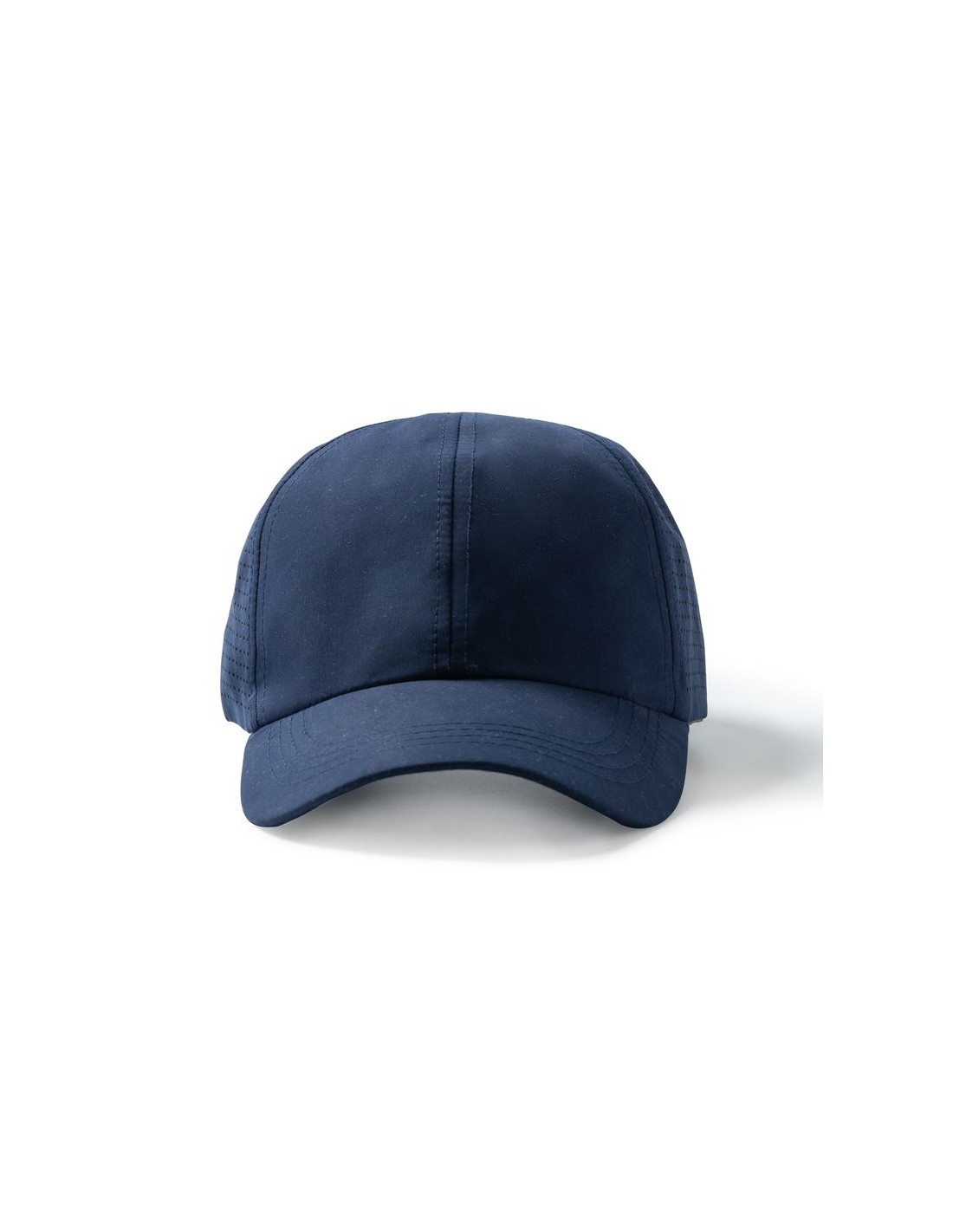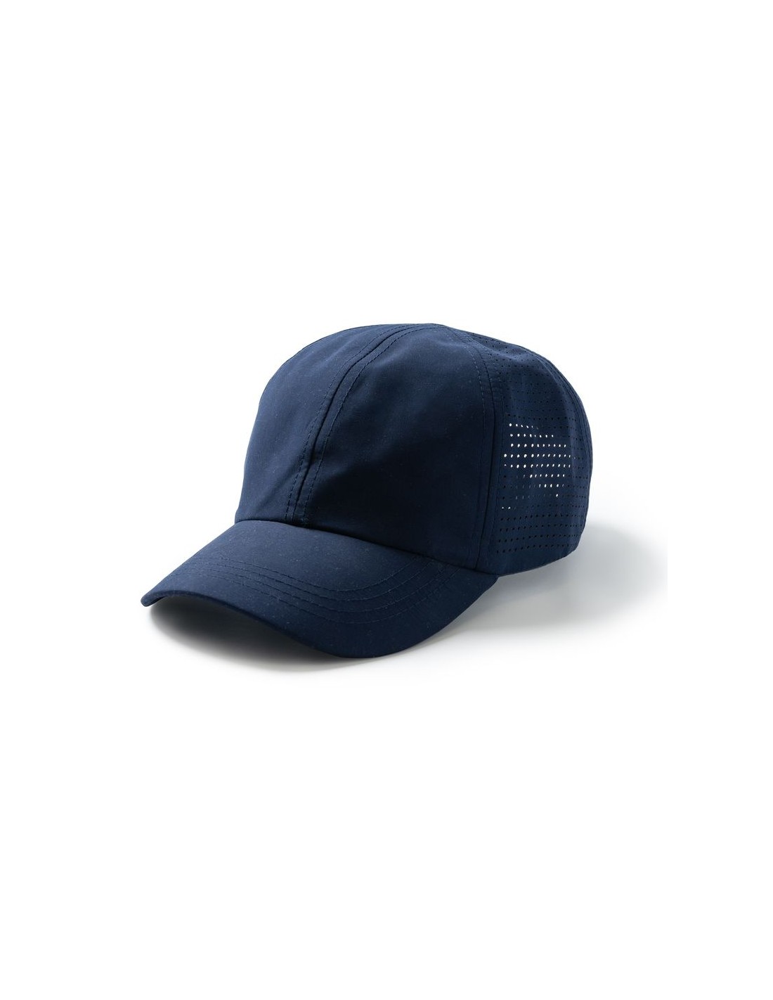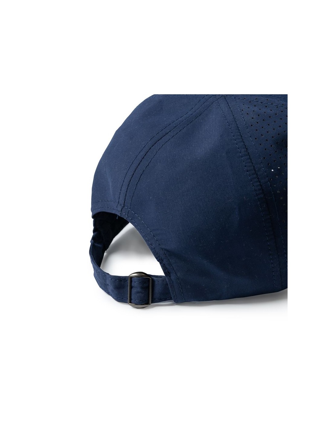 Berretto sportivo traspirante in 100% microfibra, con 6 sezioni, chiusura con fibbia regolabile e asole di ventilazione, etichetta rimovibile.