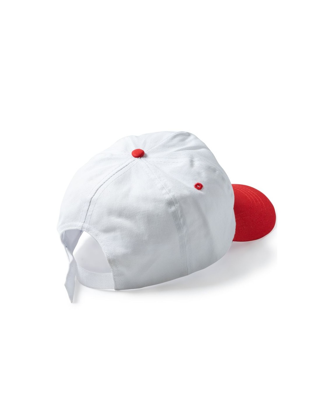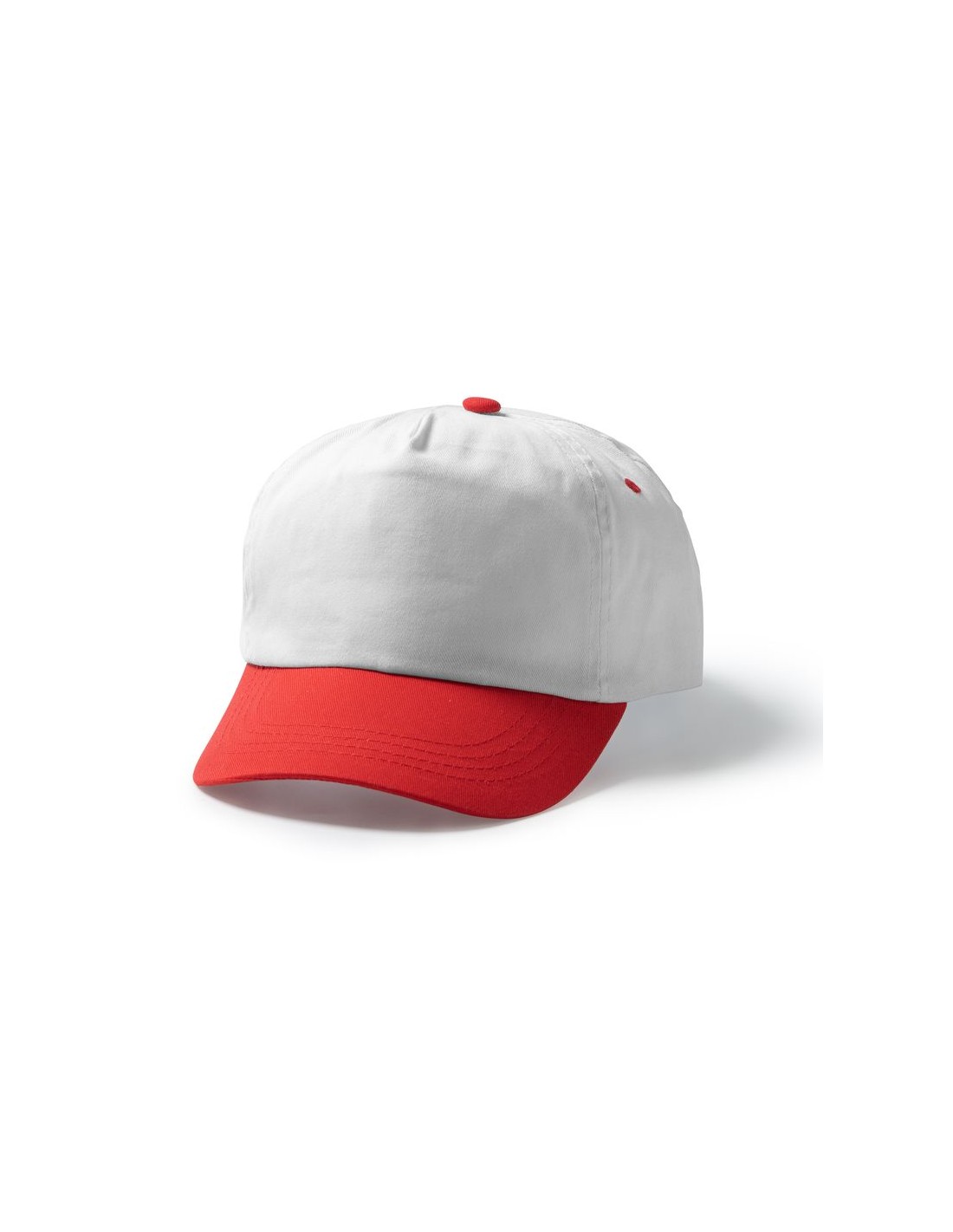 Berretto a 5 sezioni in 100% cotone, chiusura regolabile in velcro e asole di ventilazione, etichetta rimovibile.