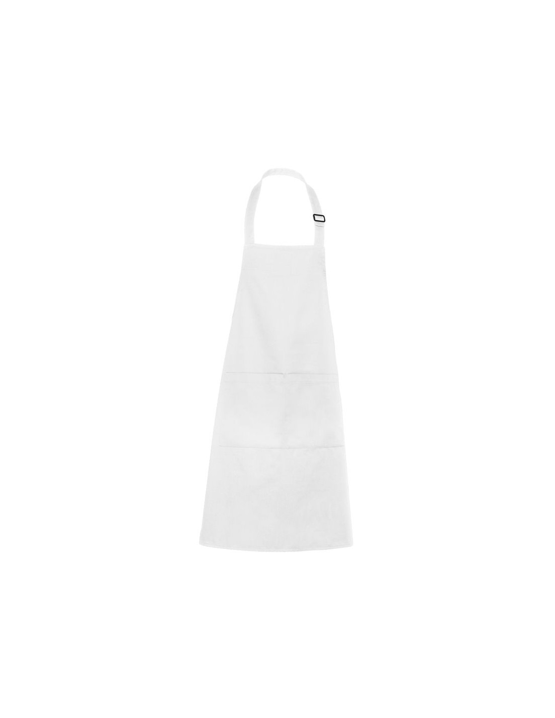 Grembiule lungo, tracolla con chiusura in plastica, cordoni laterali per allacciare, tasca frontale.