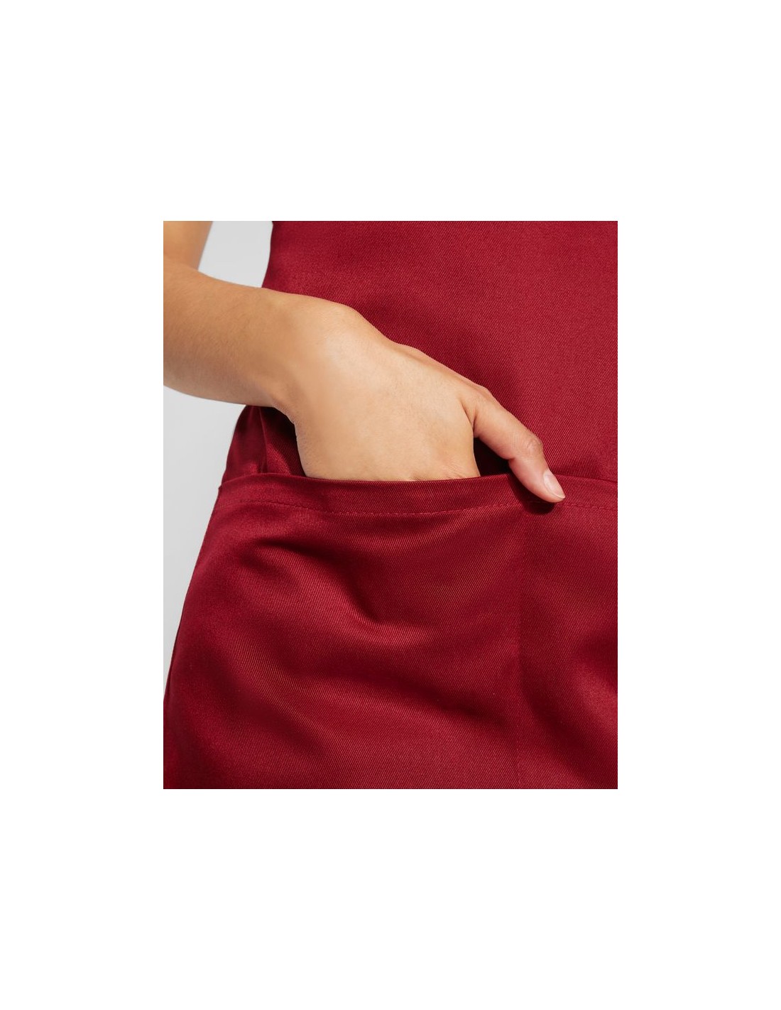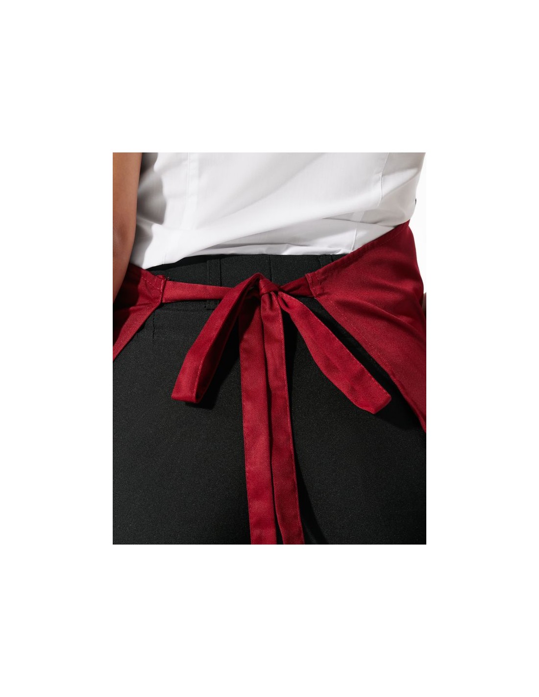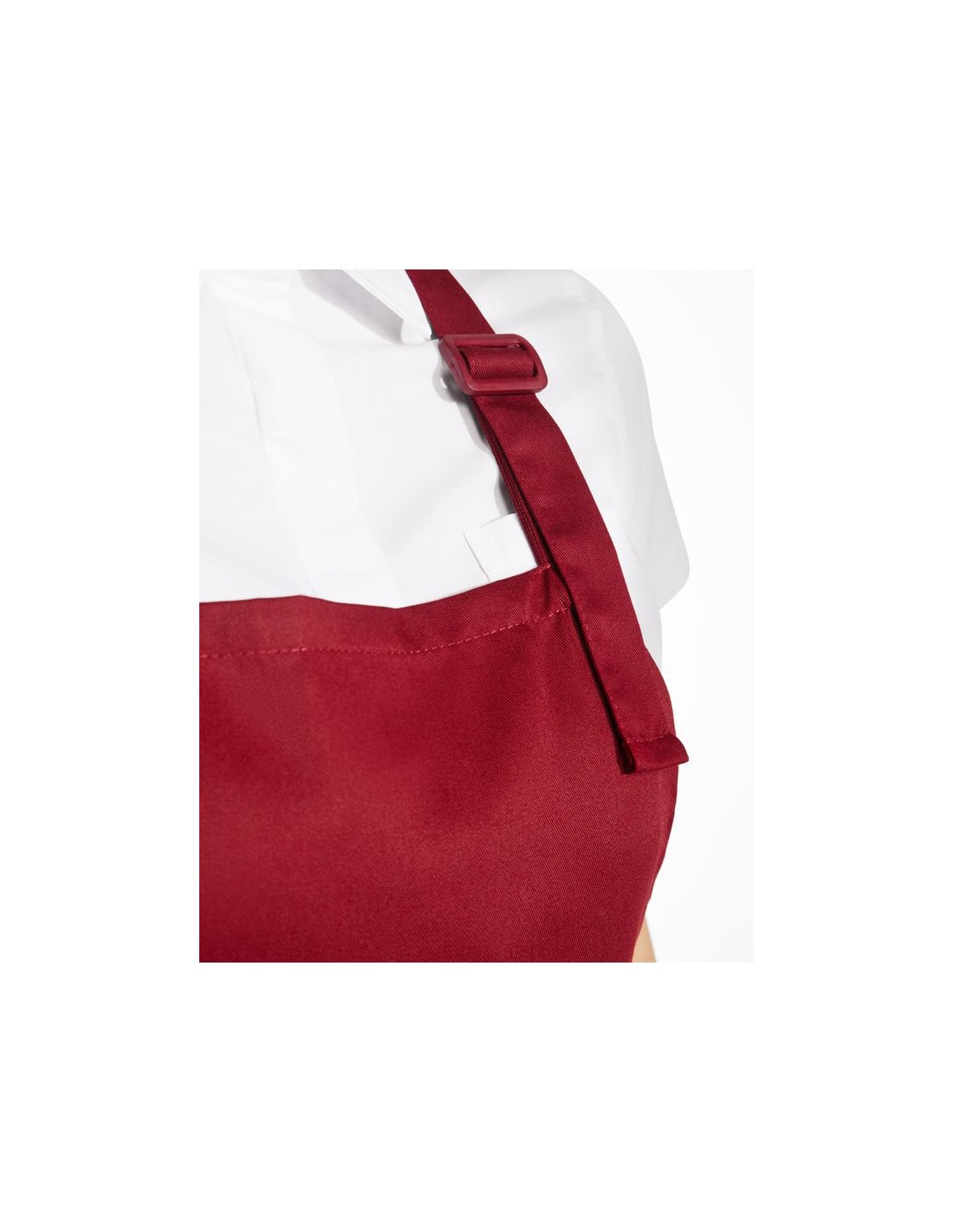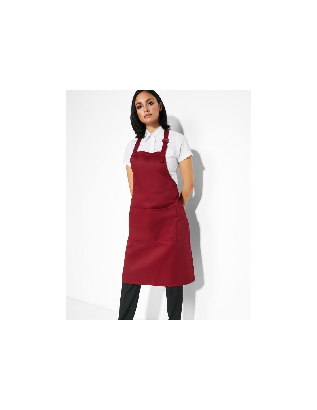 Grembiule lungo, tracolla con chiusura in plastica, cordoni laterali per allacciare, tasca frontale.