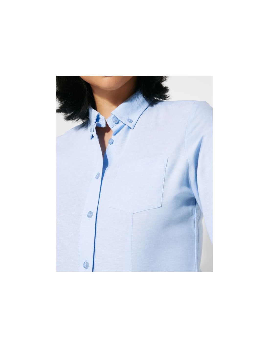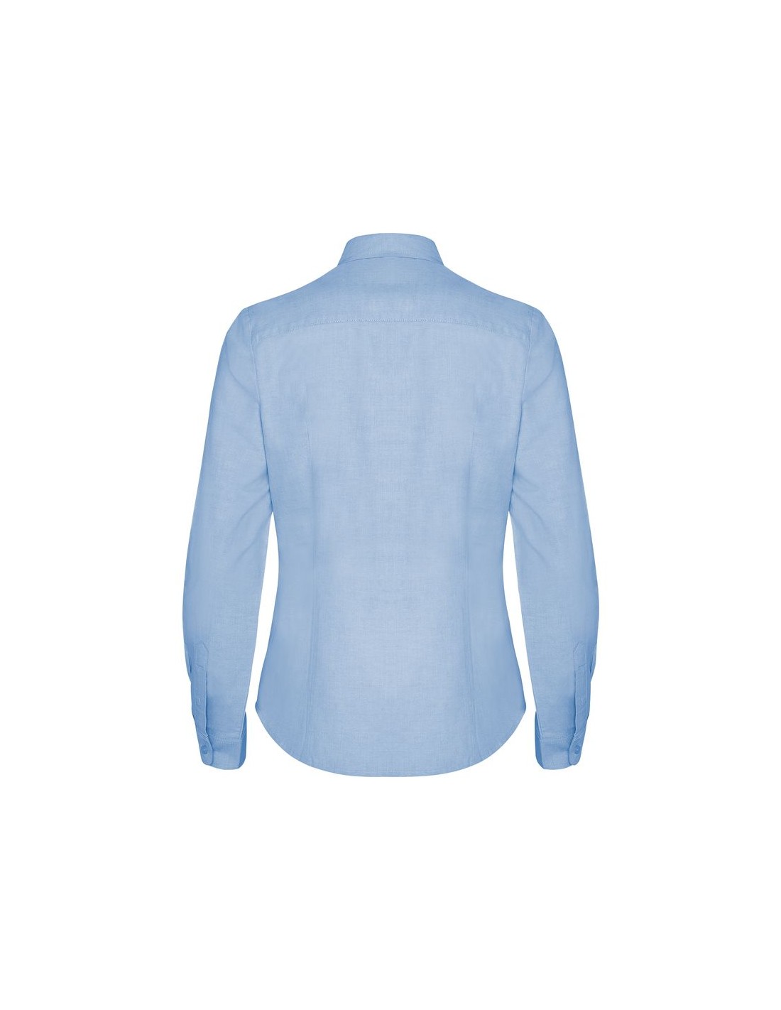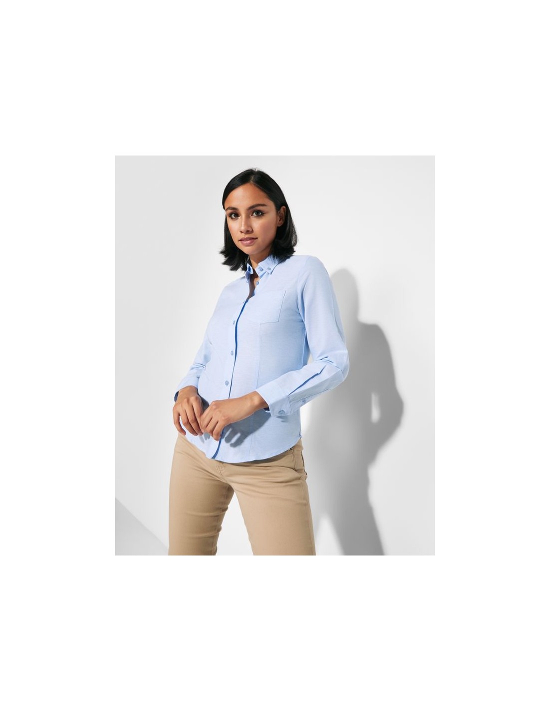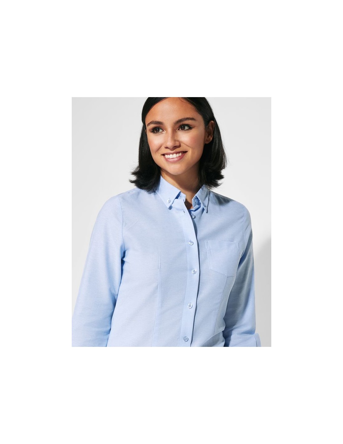 Camicia donna con tasca sul petto a sinistra, pattina con bottoni, colletto con bottoni, polsini con due fascette, piega sulla schiena, cuciture sul petto e forma sfiancata.