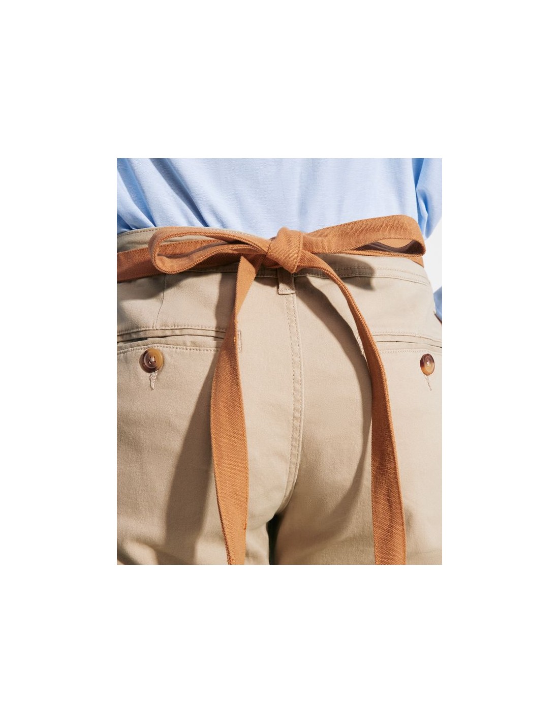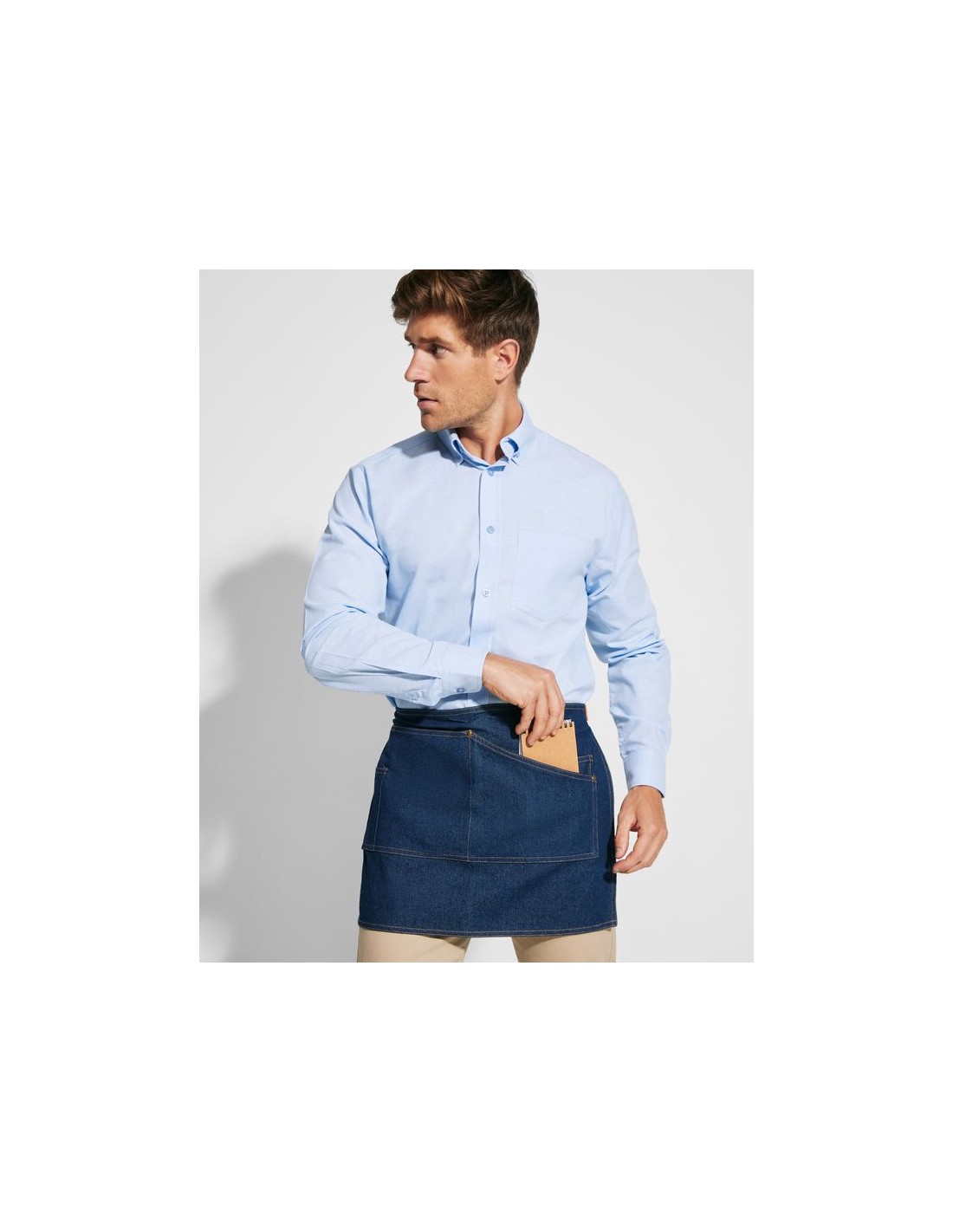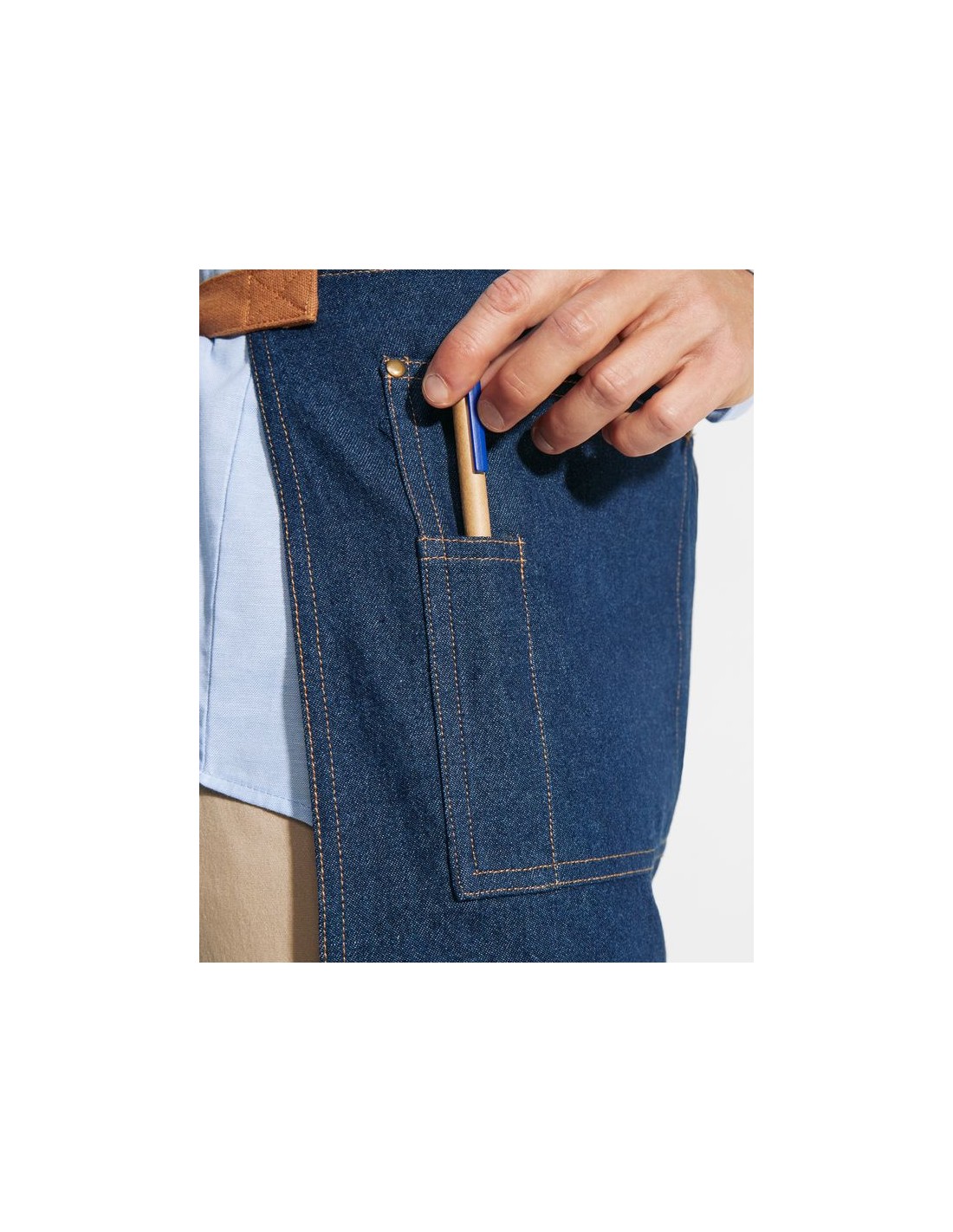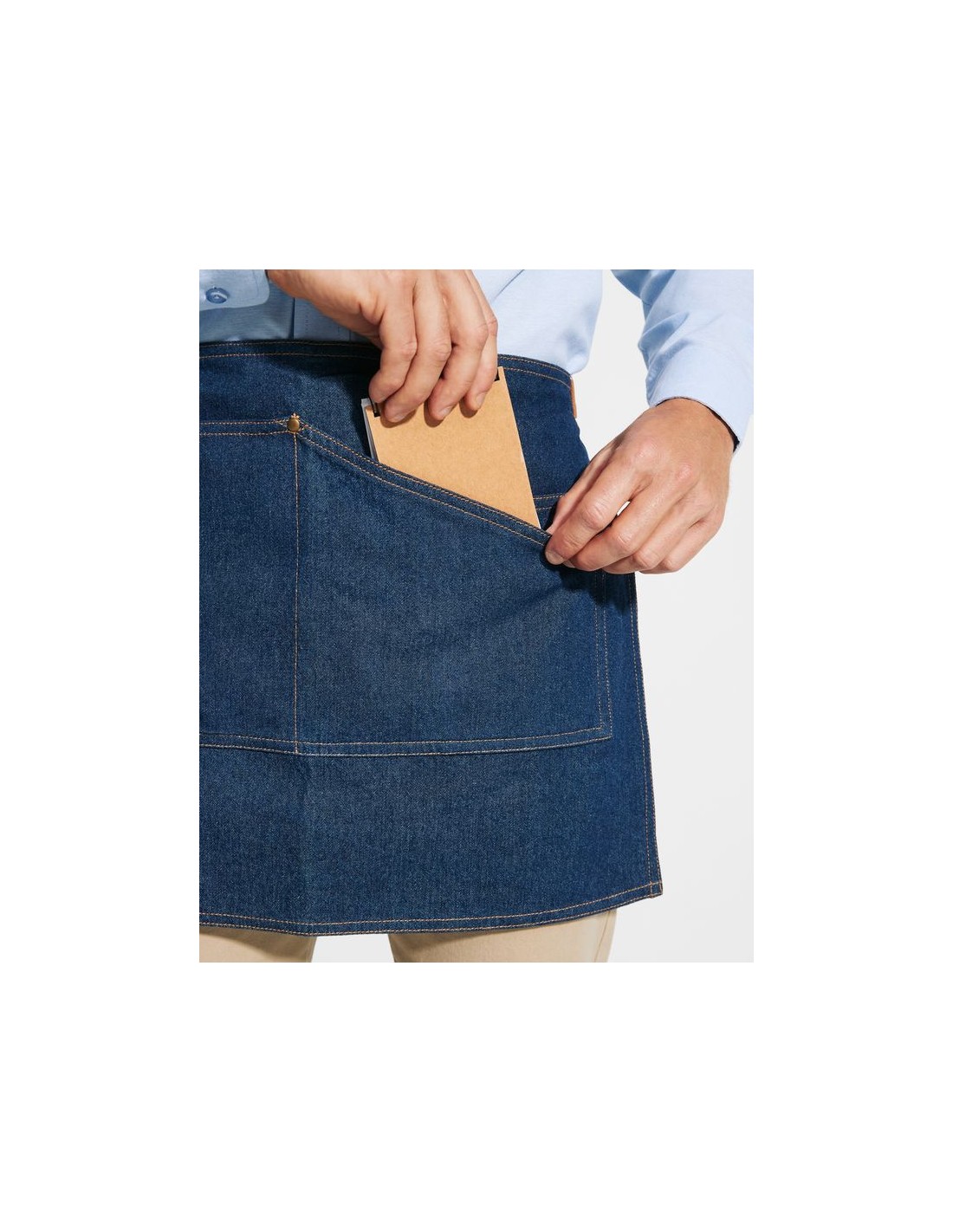 Grembiule corto in tessuto jeansato: , quattro tasche frontali con rivetti, uno dei quali specifico per le penne, nastri laterali in contrasto per l'allacciatura.