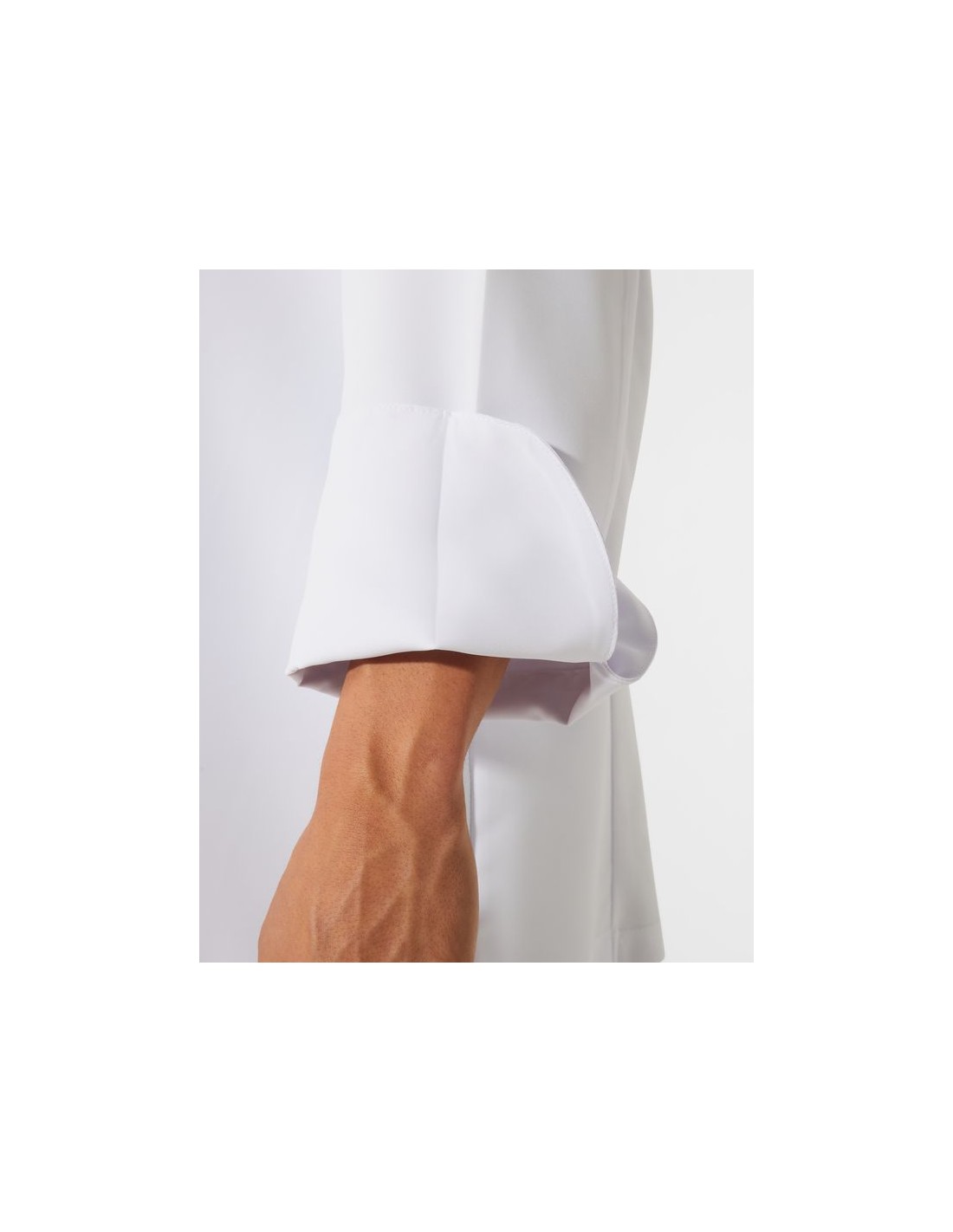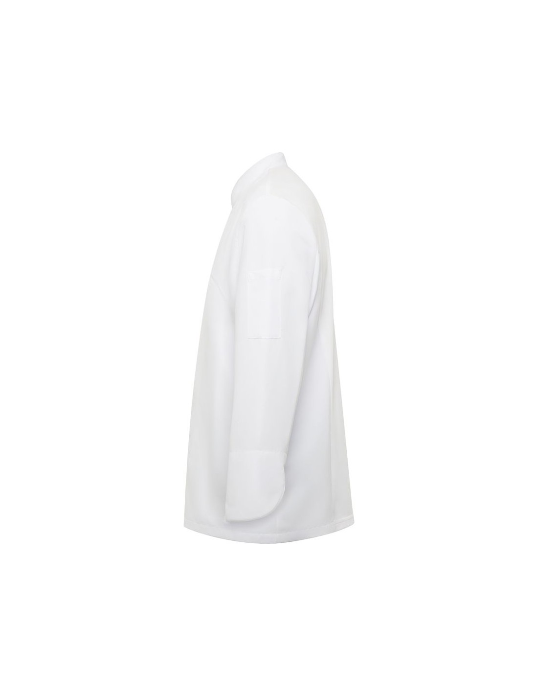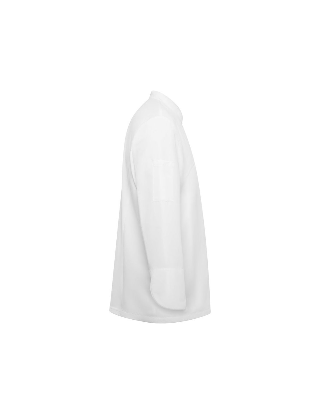 Giacca da cucina con maniche lunghe, chiusura centrale incrociata con bottoni a pressione nascosti, colletto rialzato e maniche su misura con polsini orlati, retro in tessuto traspirante, una tasca applicata sulla manica sinistra.