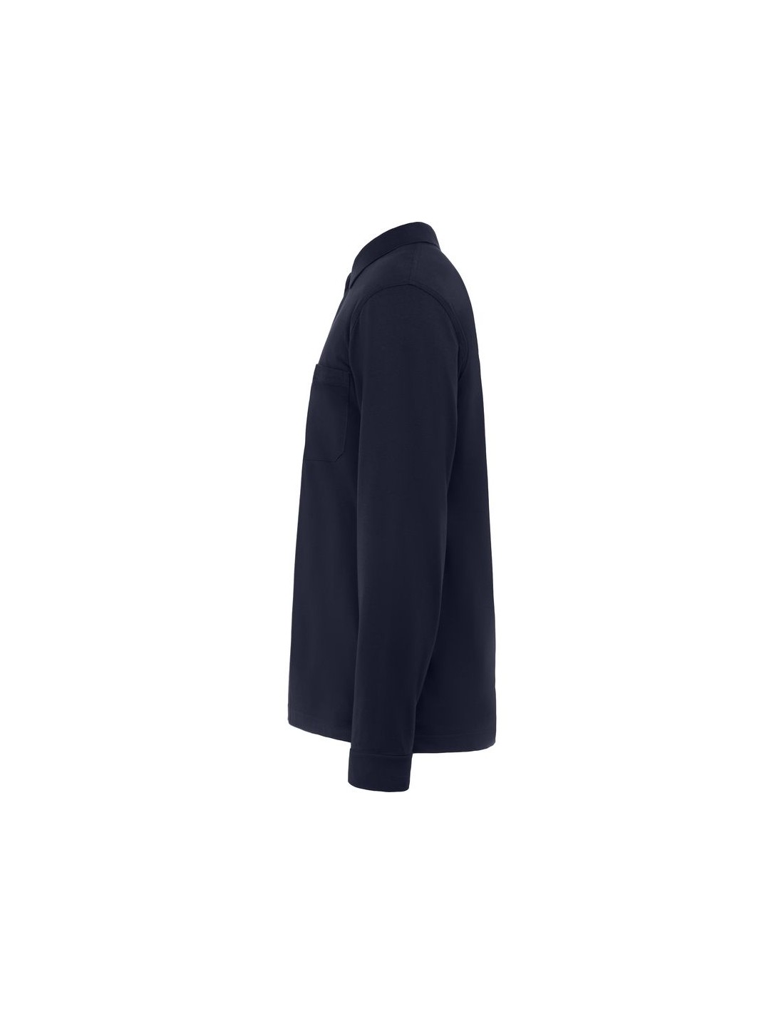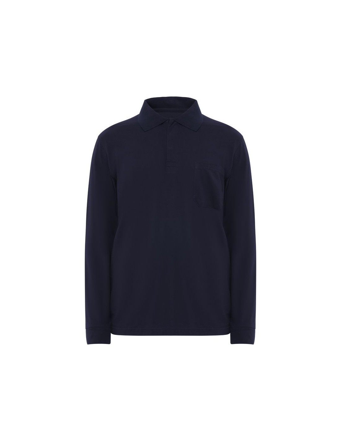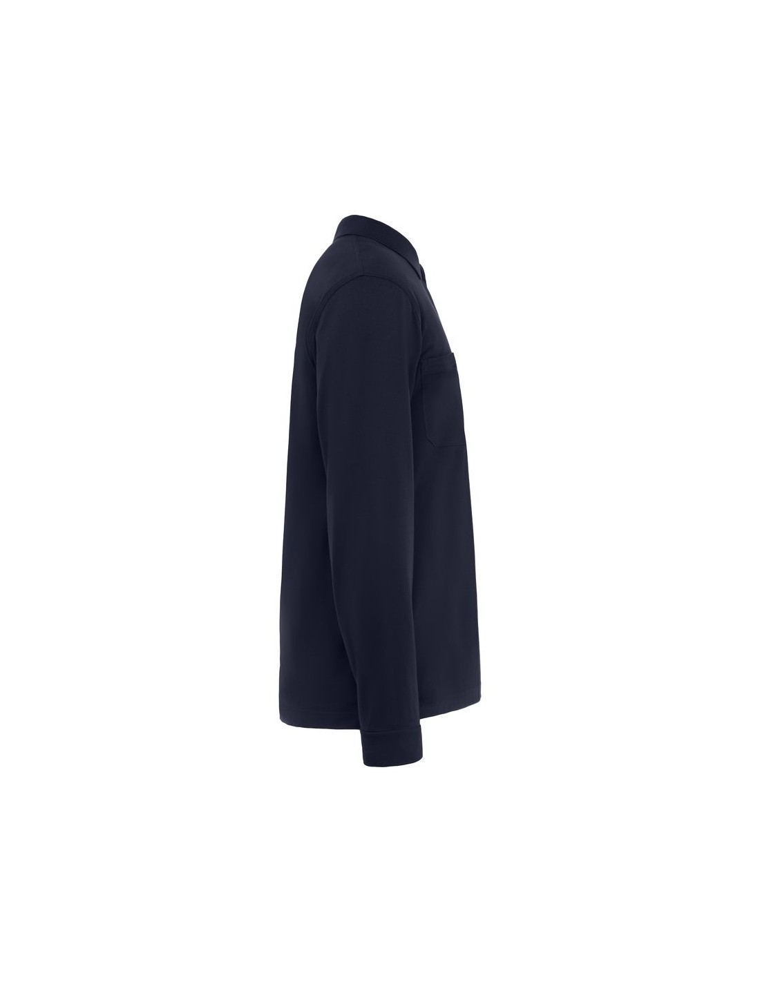 Polo a maniche lunghe in tessuto ignifugo, collo e polsini a costine 1x1, 3 bottoni nascosti, cuciture rinforzate e coperte nel collo, spacchetti laterali al fondo.