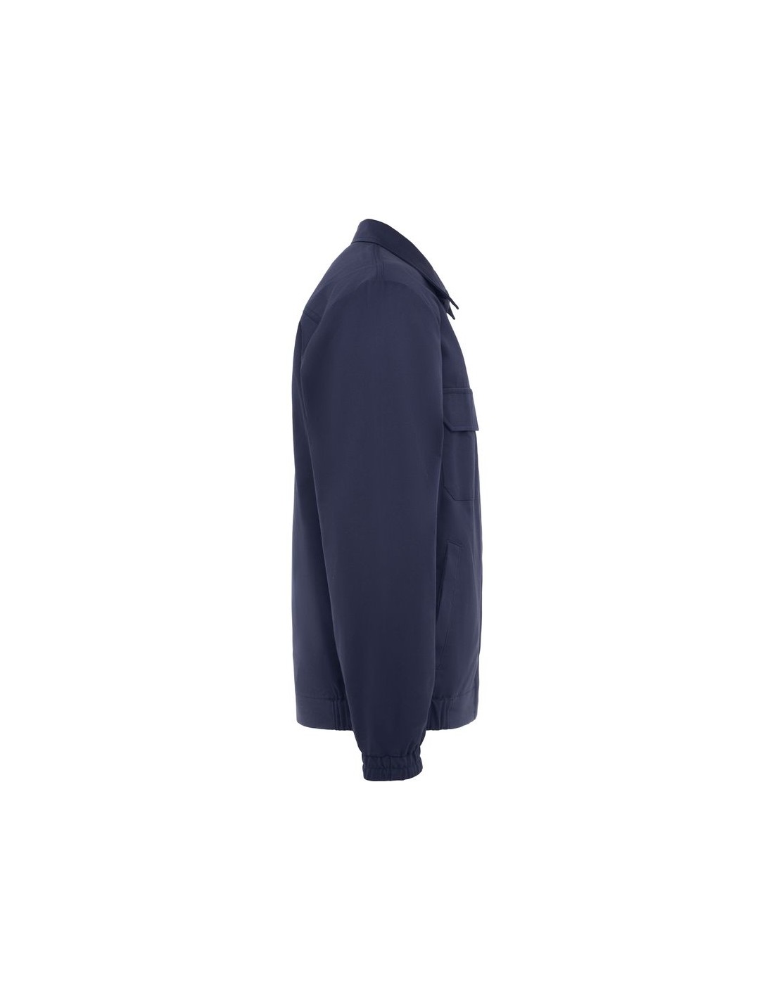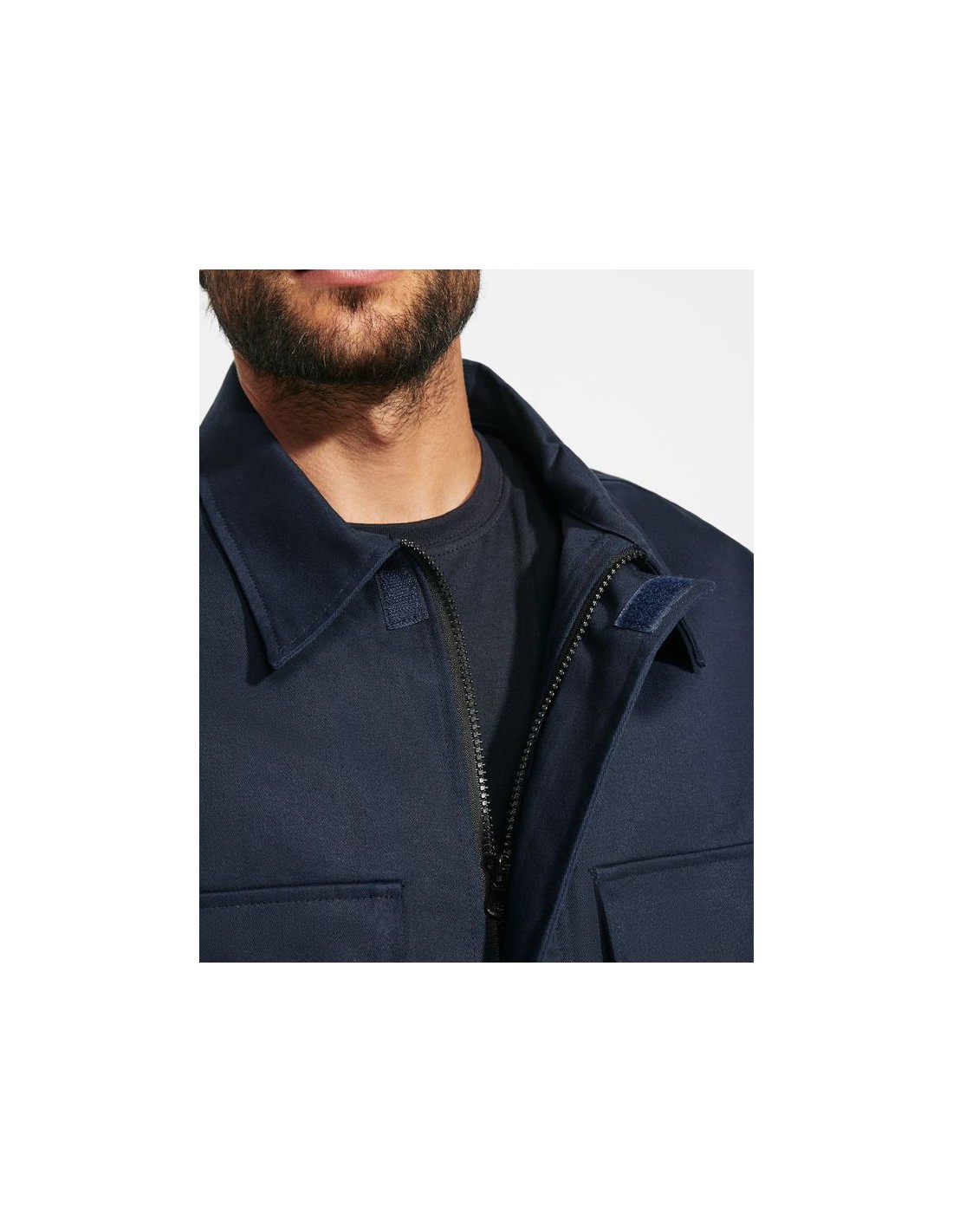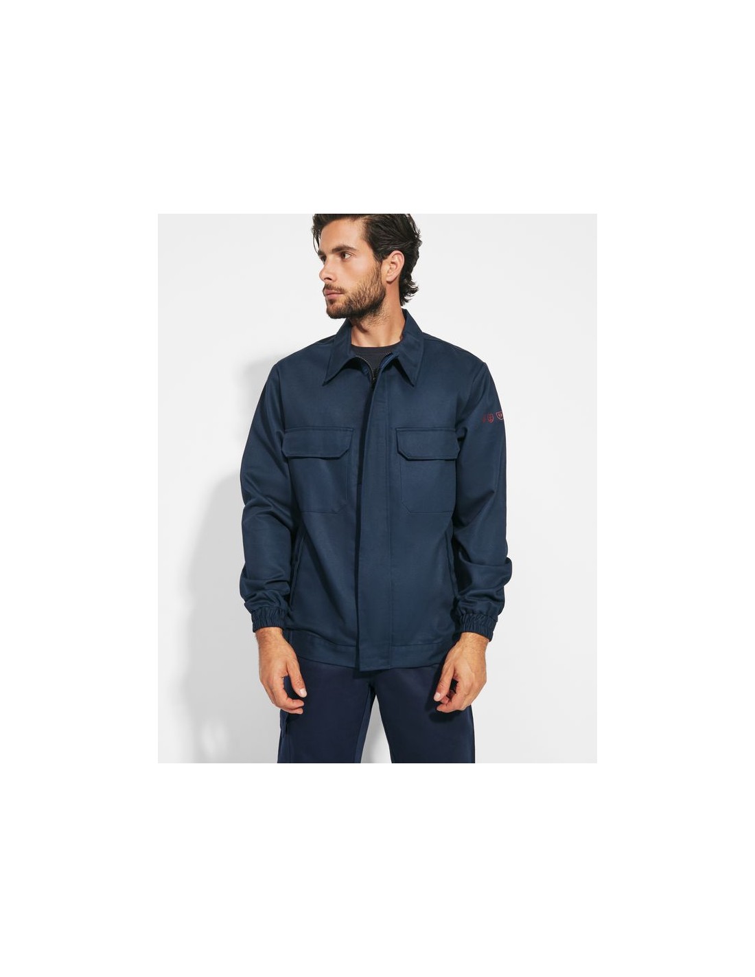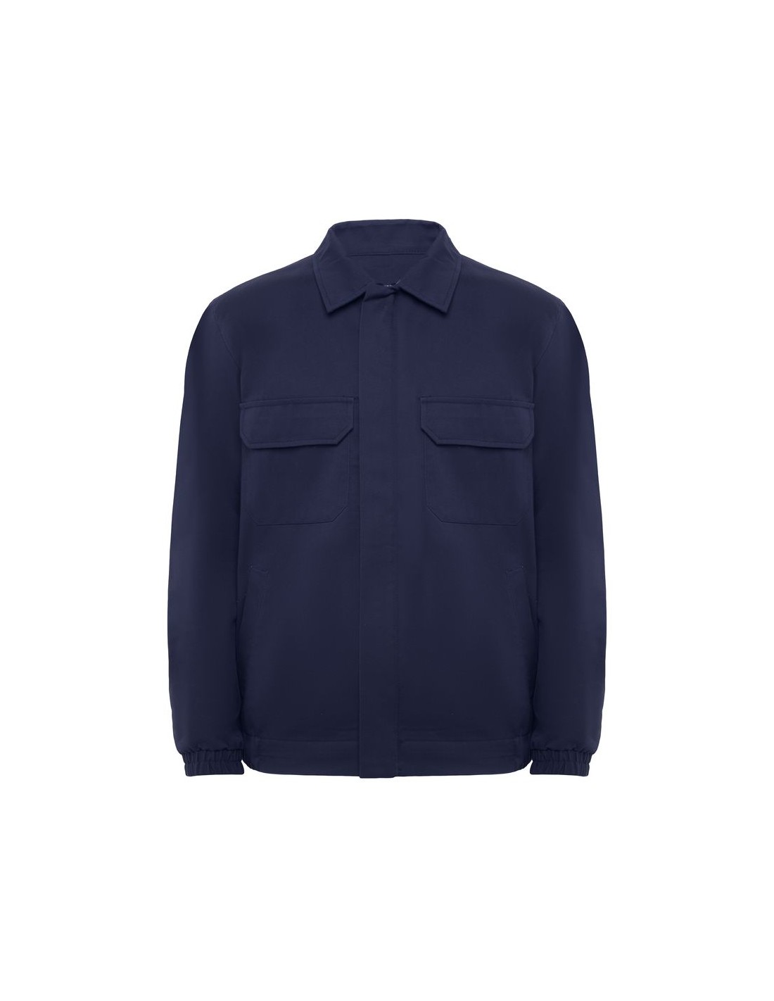 Giacca in tessuto ignifugo, abbottonatura centrale con chiusura a zip e velcro, due tasche anteriori sul petto con patella e chiusura in velcro, due tasche laterali con patta e bottone, elastico in vita sui lati, polsini elastici.