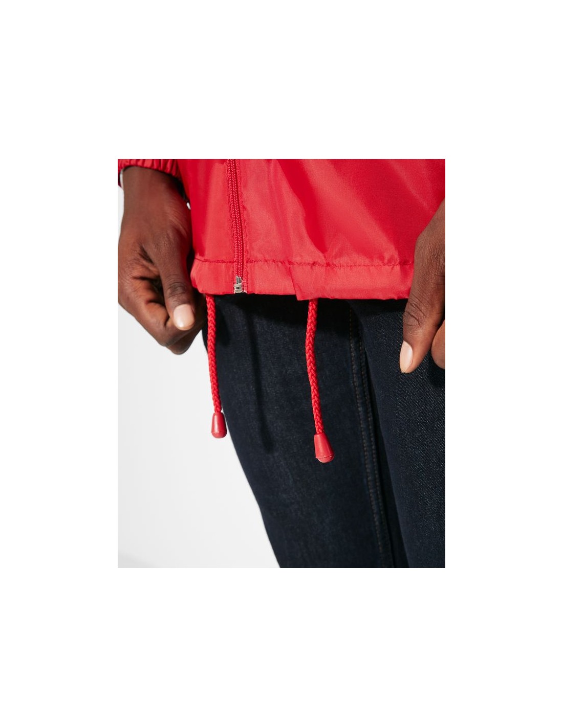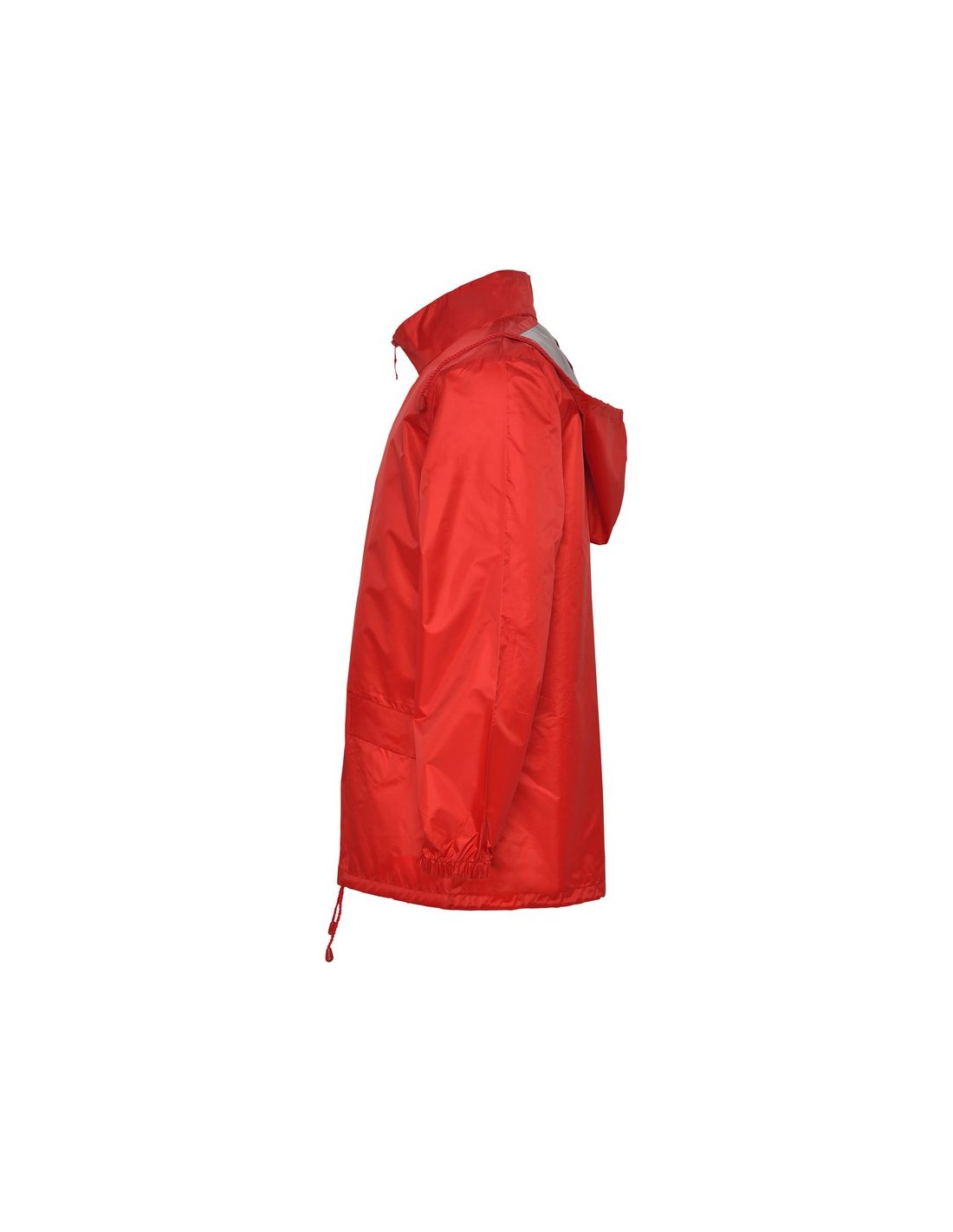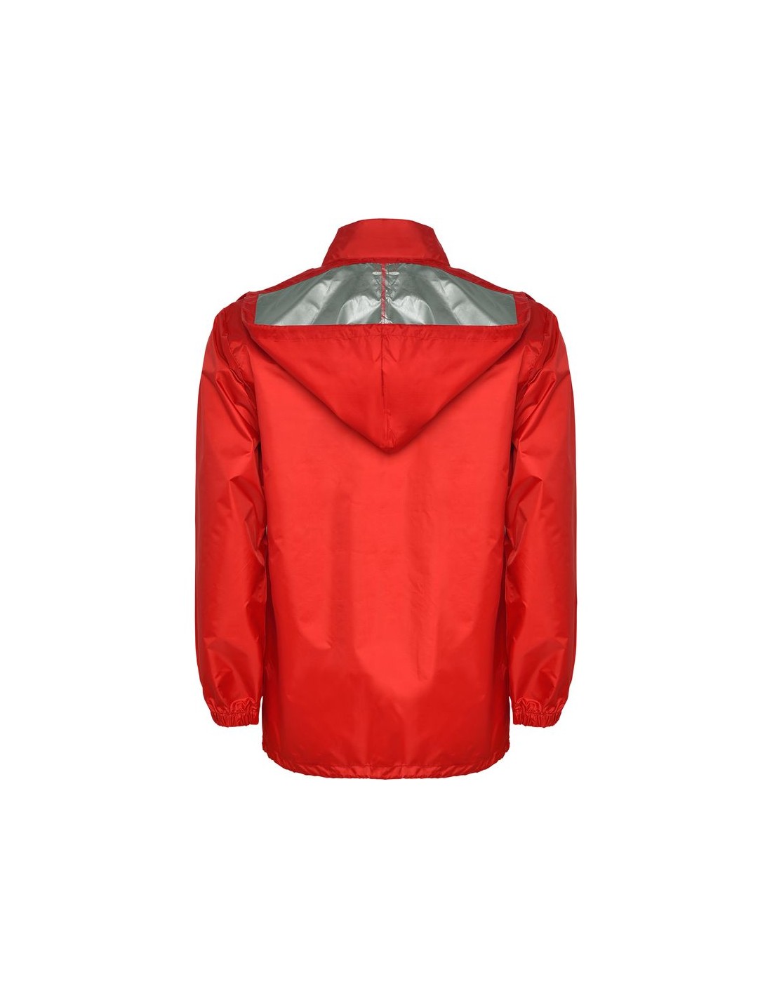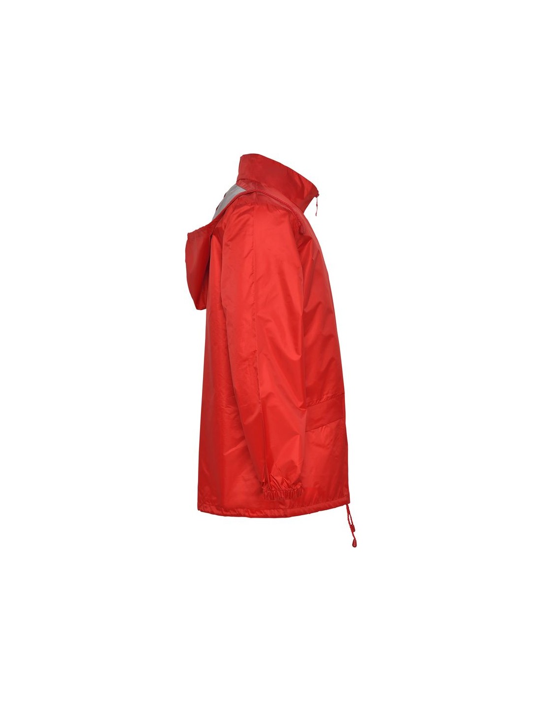 Giacca cera collo alto con cerniera lunga, cerniera, bordo inferiore con coulisse regolabile, cappuccio ripiegabile a scomparsa nel colletto con cordoncini, due tasche con copritasca e chiusura in velcro, polsini elastici, elastico all'interno della tasca per poterlo ripiegare e conservare.