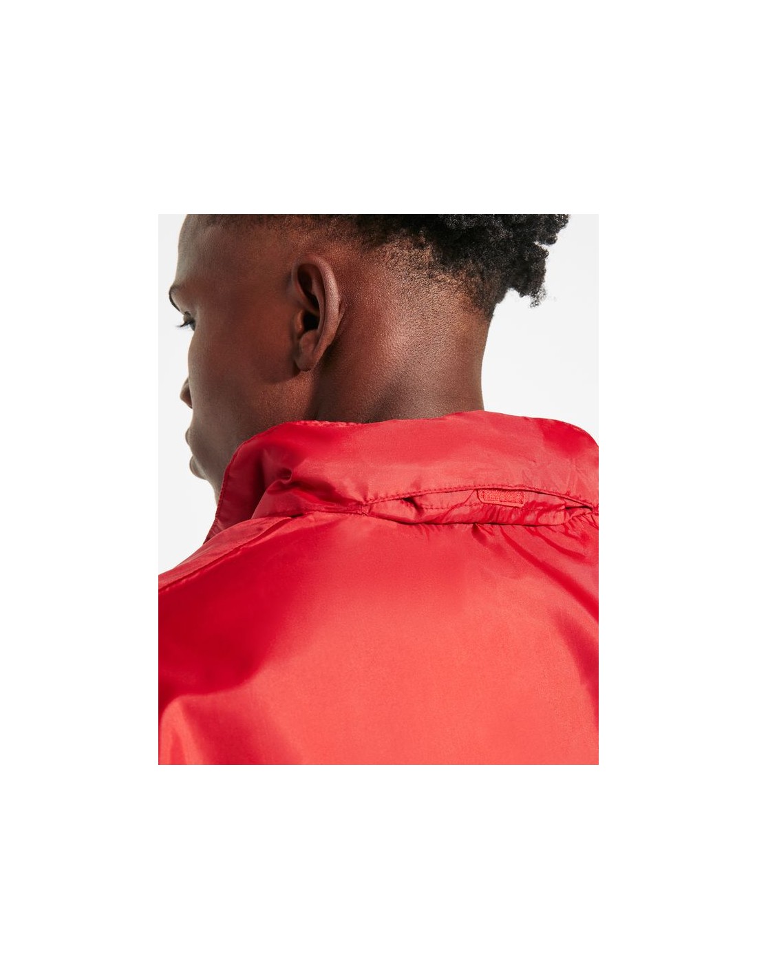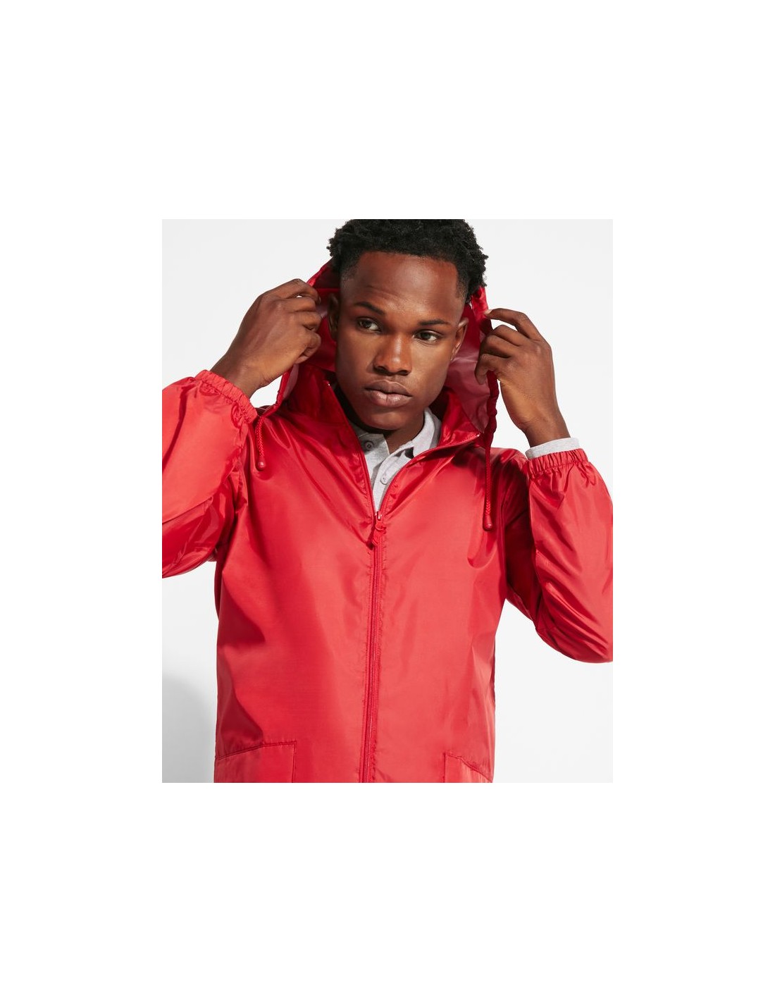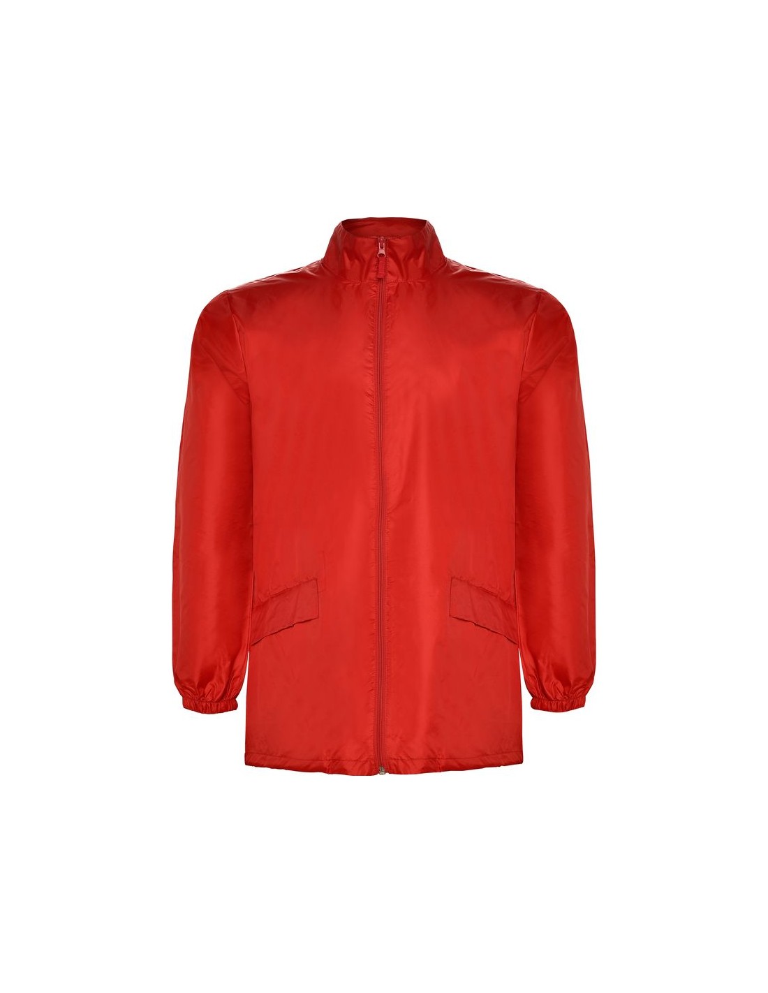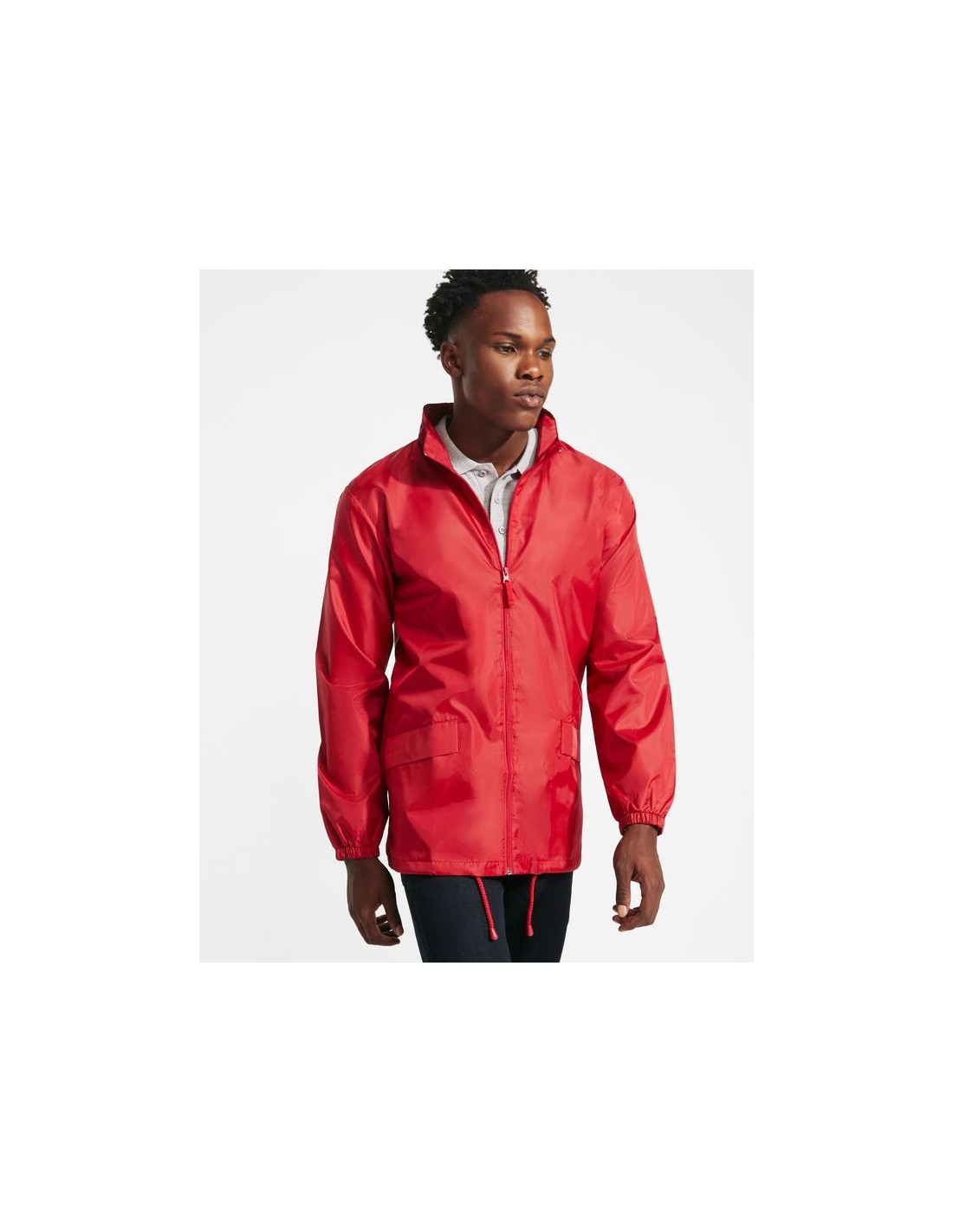 Giacca cera collo alto con cerniera lunga, cerniera, bordo inferiore con coulisse regolabile, cappuccio ripiegabile a scomparsa nel colletto con cordoncini, due tasche con copritasca e chiusura in velcro, polsini elastici, elastico all'interno della tasca per poterlo ripiegare e conservare.