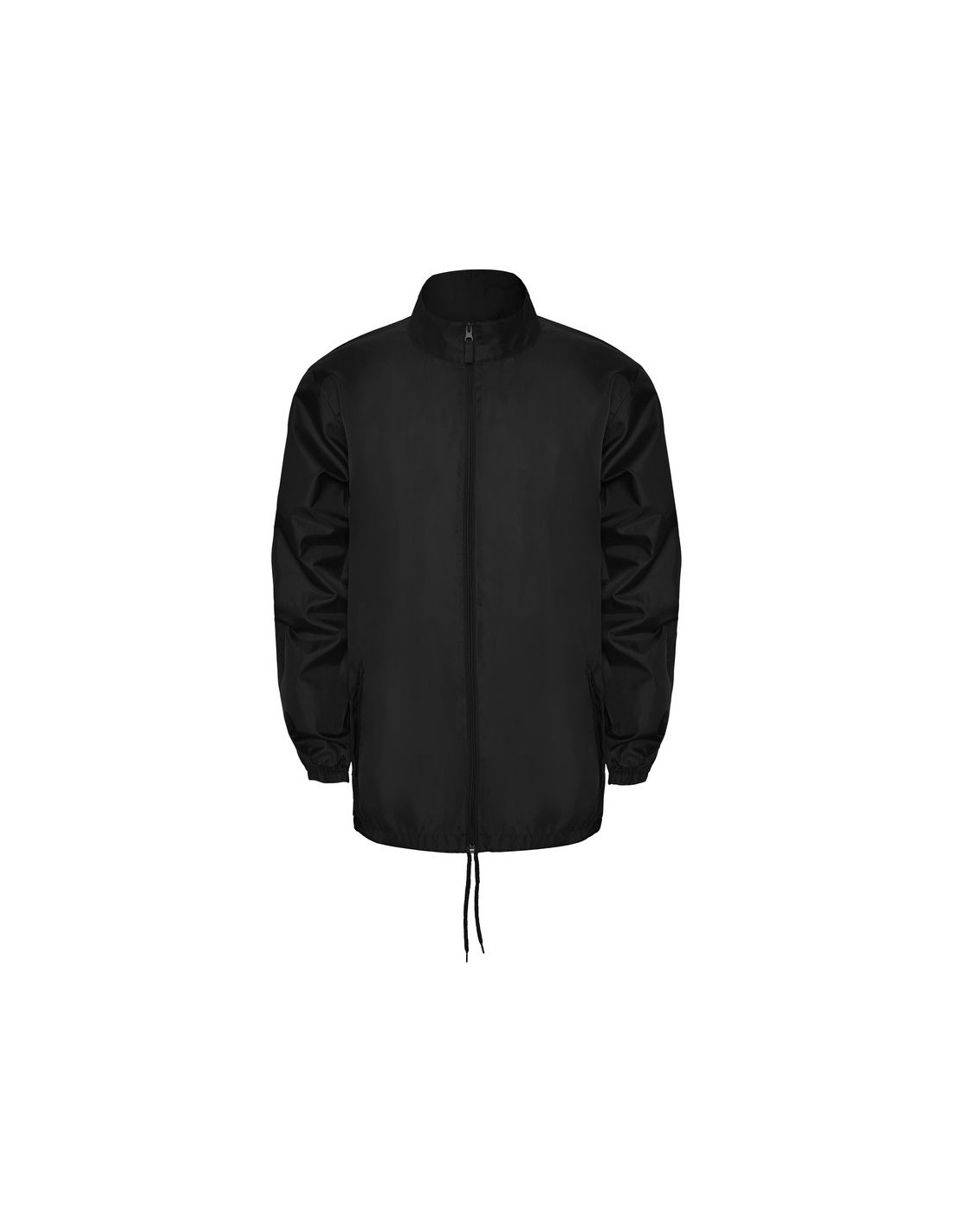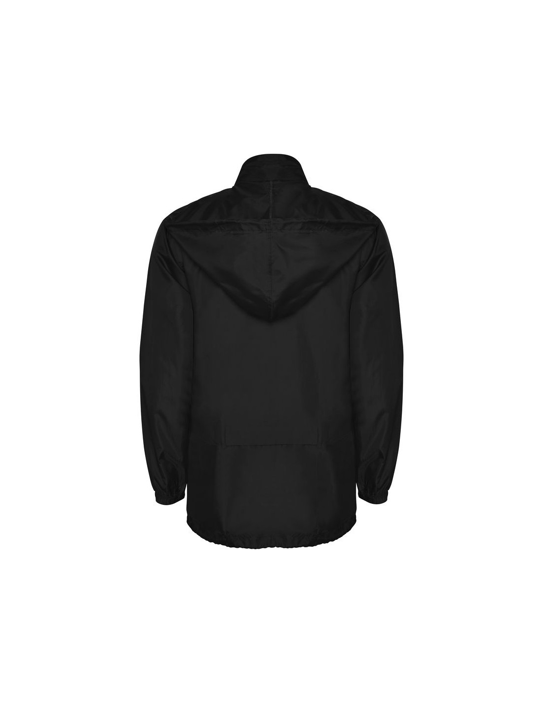 Impermeabile collo alto con cerniera lunga, cappuccio ripiegabile a scomparsa nel colletto con cordoncini, due tasche con copritasca e cerniera, polsini elastici, girovita con cordoncini regolabili e stopper, elastico all'interno della tasca per poterlo ripiegare e conservare.