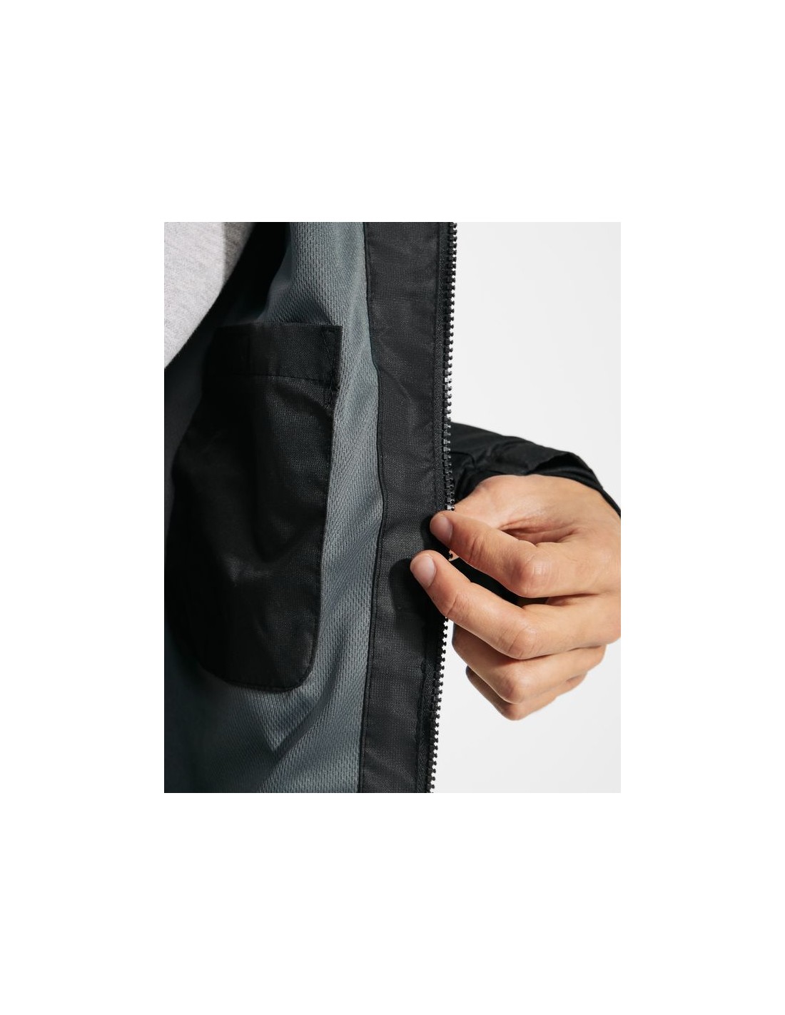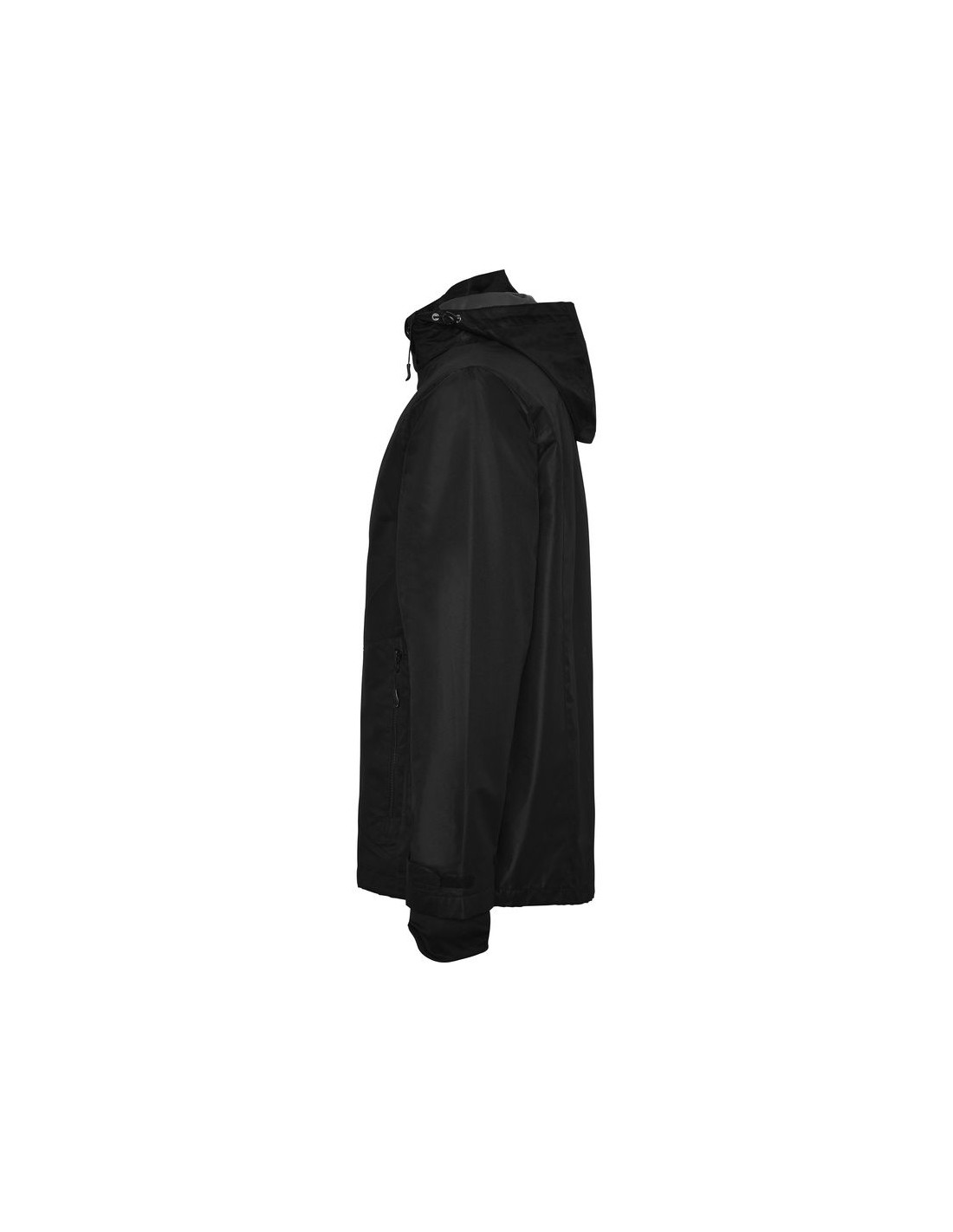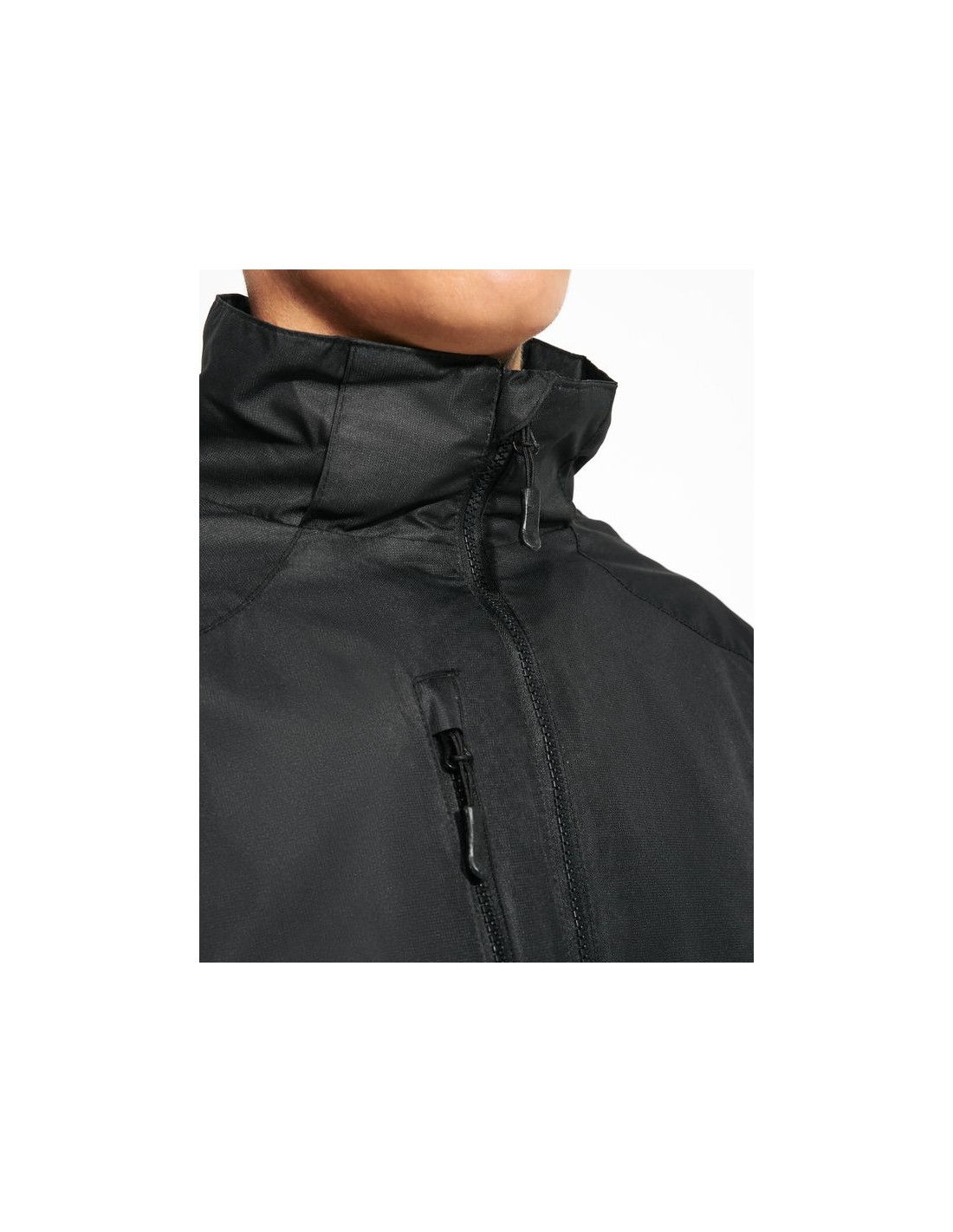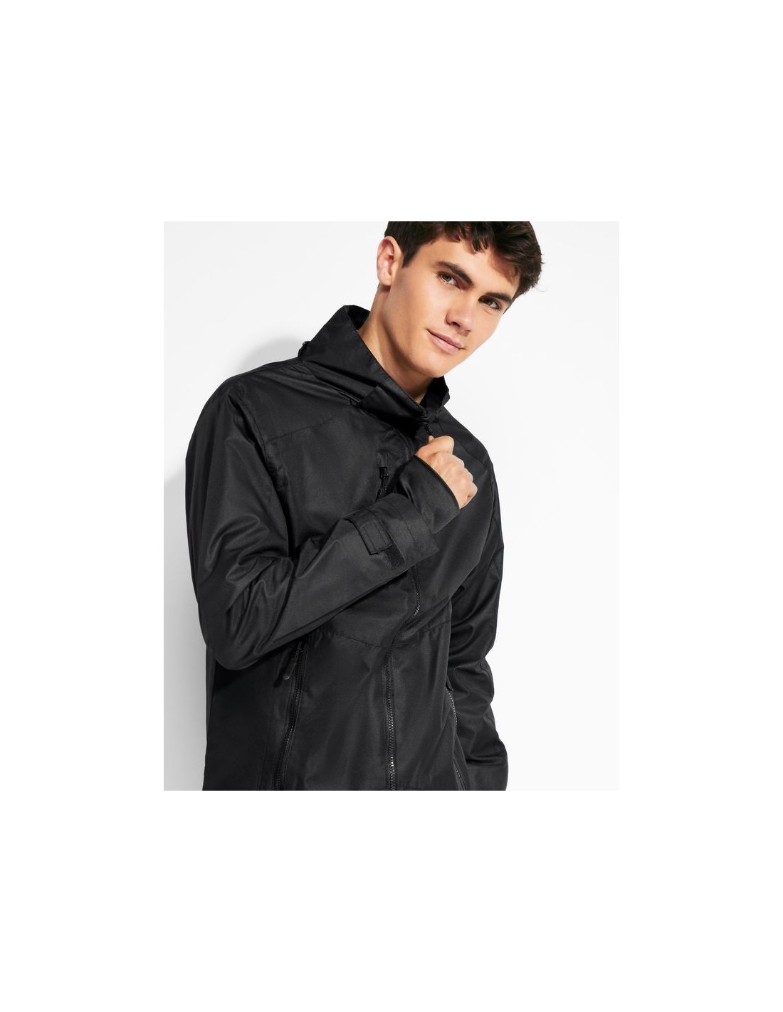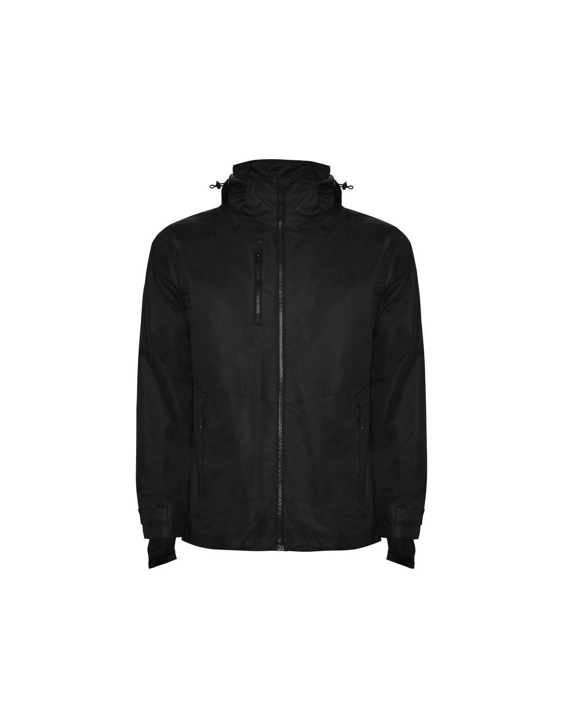 Giacca impermeabile in tessuto quadrillé molto resistente, cerniera anteriore e protezione del cursore, cappuccio estraibile, polsini interni con dettagli thmbslit, regolatori nel cappuccio e nel girovita, tre tasche frontali con cerniera, una sul petto lato destro e due nei laterali, due tasche interne con velcro, polsini regolabili.