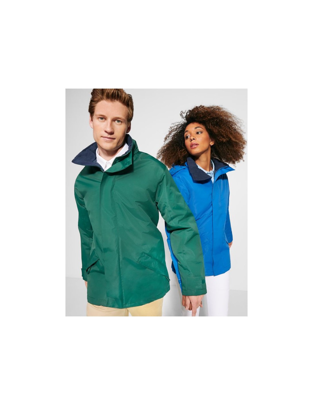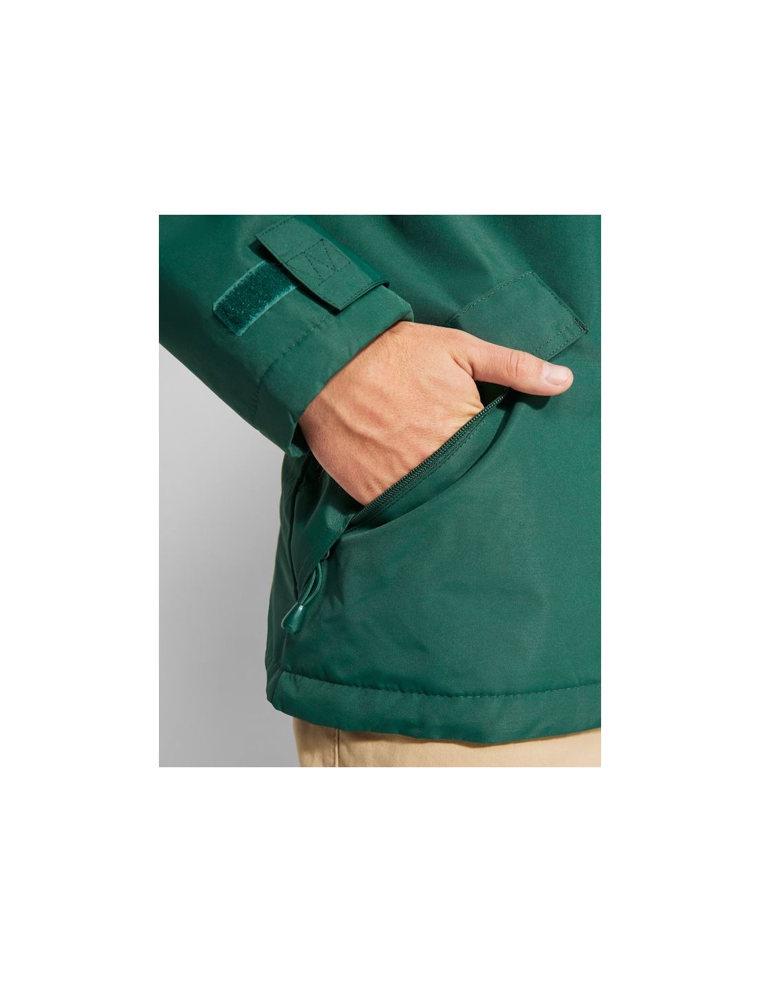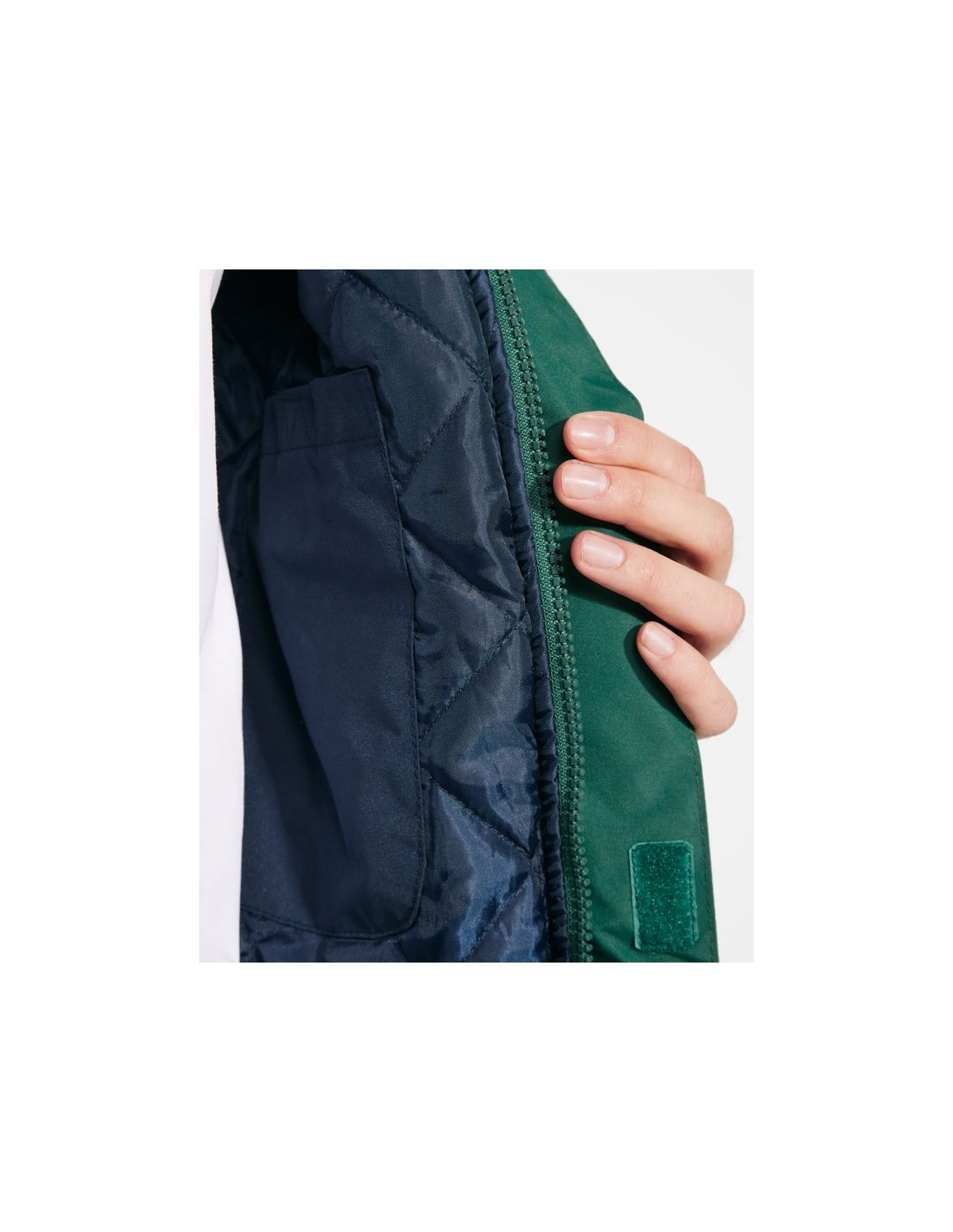 Parka collo alto con cerniera iniettata in tinta, cappuccio estraibile piegato nel collo con chiusura in velcro, tasche esterne con cerniera, copri cerniera e tiretto, doppio taschino interno con velcro, polsini regolabili in velcro