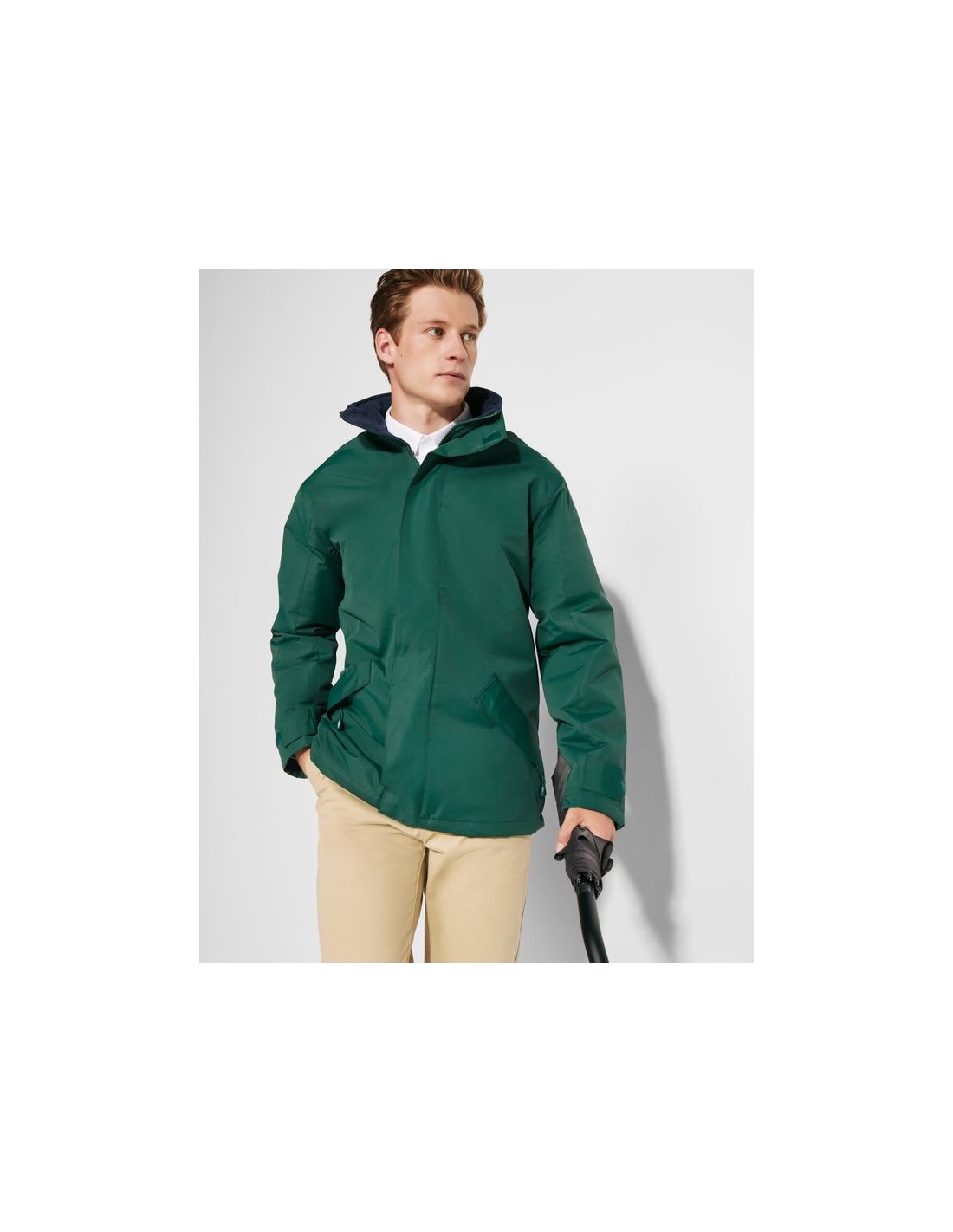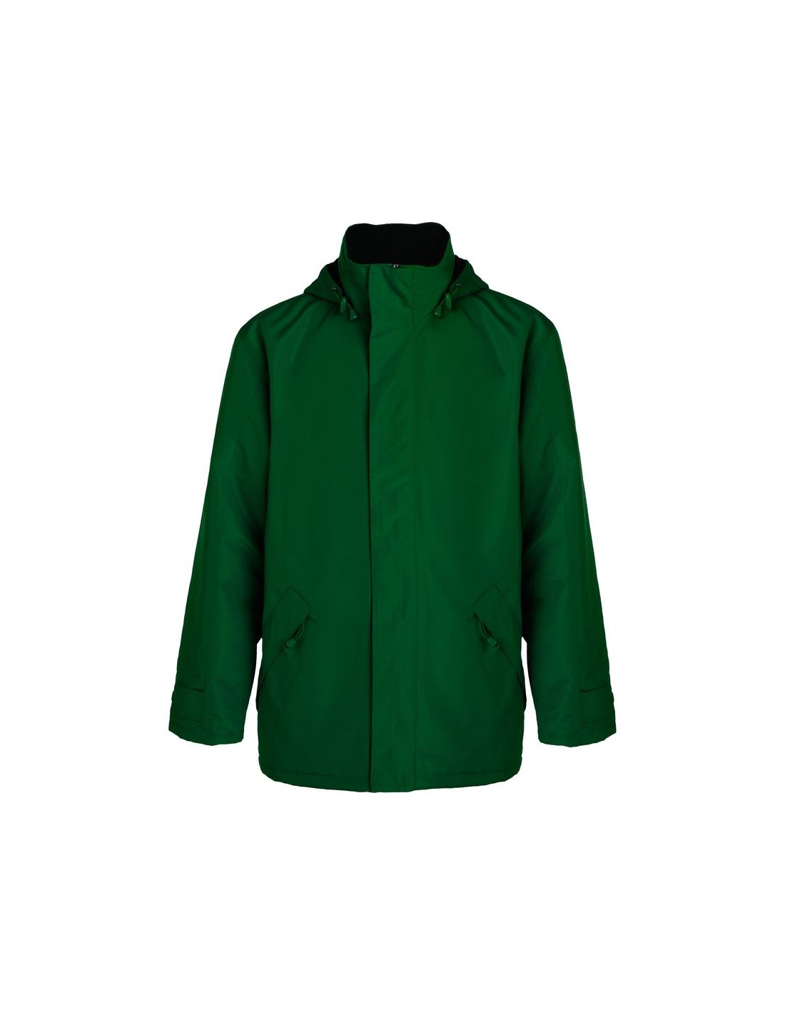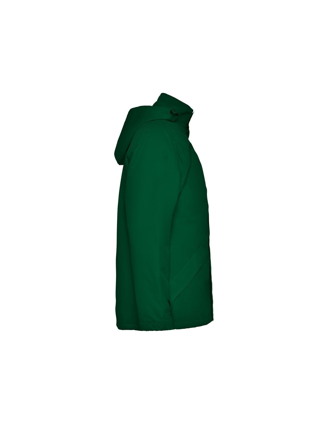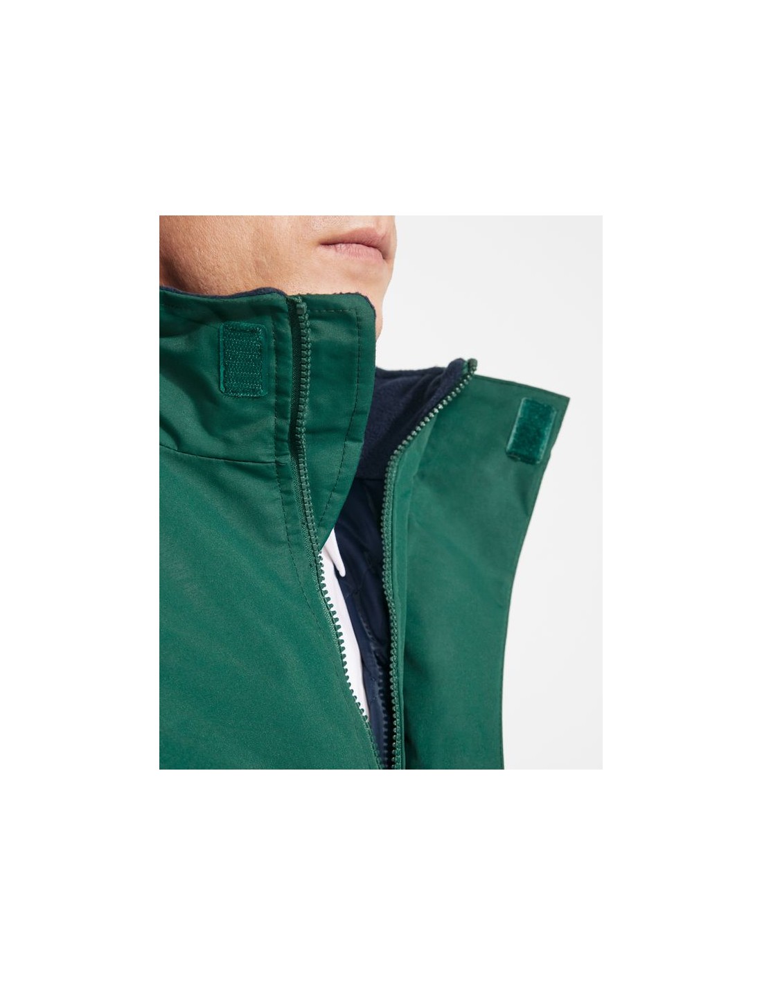 Parka collo alto con cerniera iniettata in tinta, cappuccio estraibile piegato nel collo con chiusura in velcro, tasche esterne con cerniera, copri cerniera e tiretto, doppio taschino interno con velcro, polsini regolabili in velcro