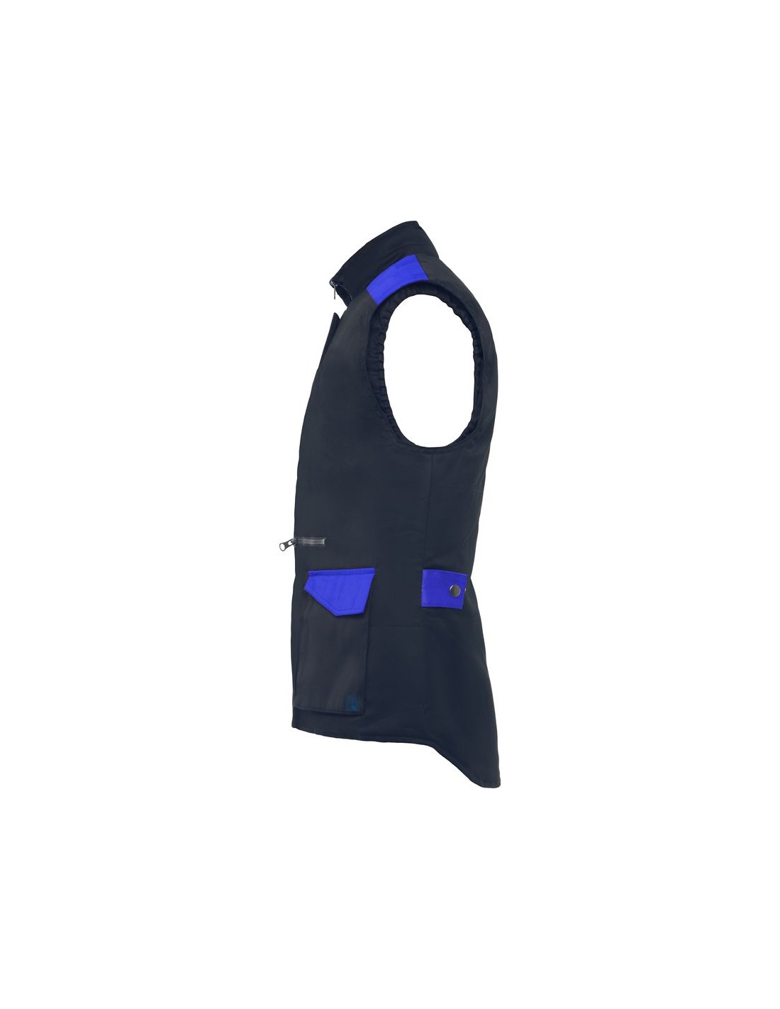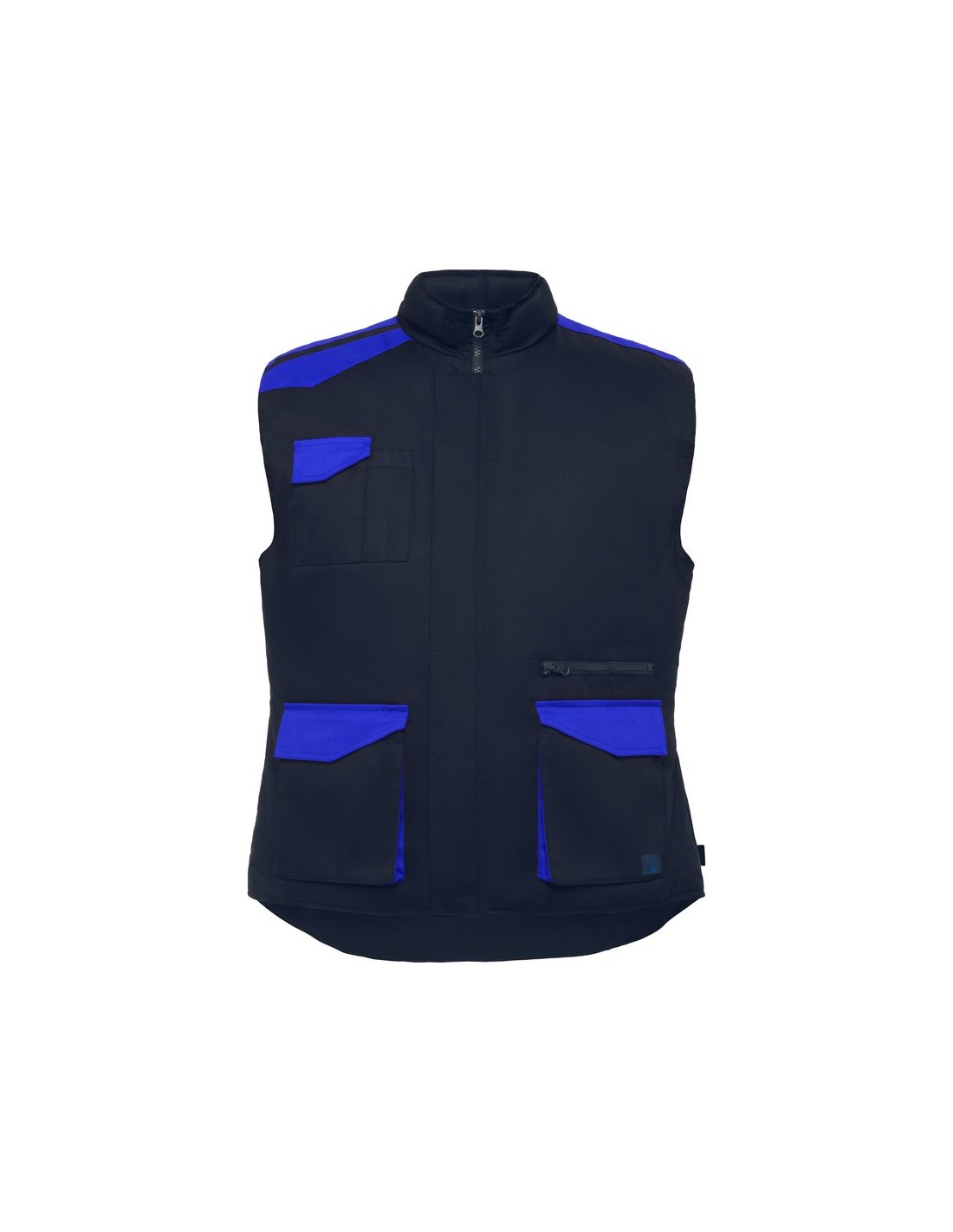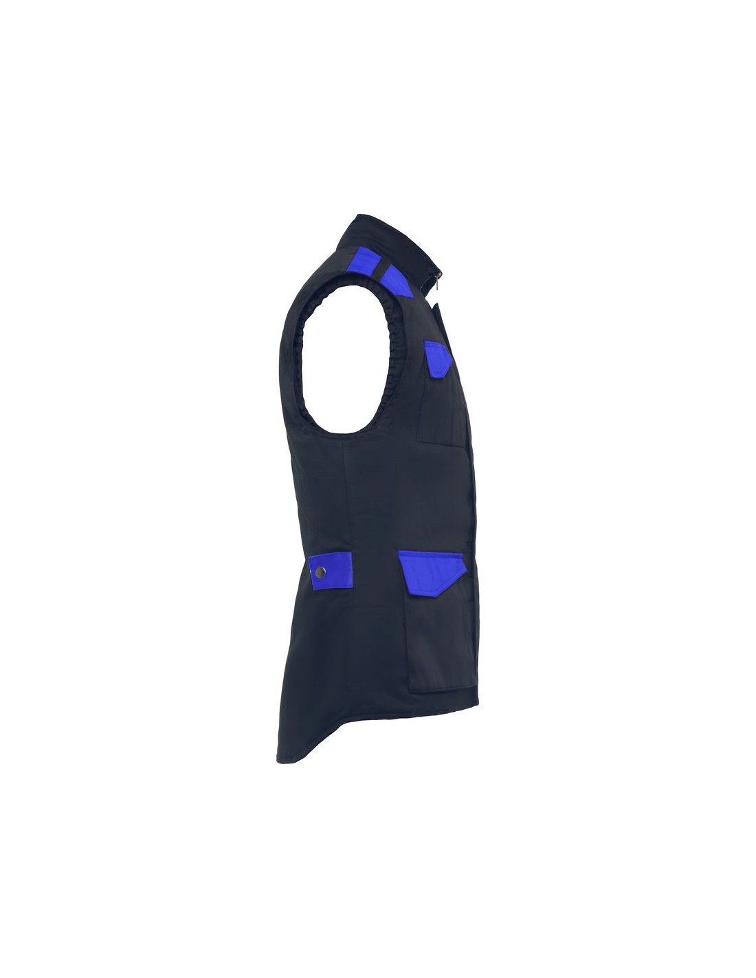 Gilet da lavoro multitasche con collo alto in colori combinati, cerniera centrale con zip e velcro, giacca a vento sulle maniche, una tasca esterna per cellulare sul lato destro, con patta e velcro, due tasche frontali con soffietto, patta e velcro, due portapenne, una tasca interna con velcro, tasca con zip, orlo posteriore con gonna, regolatore autobloccante, pannelli e dettagli sulle spalle a contrasto.