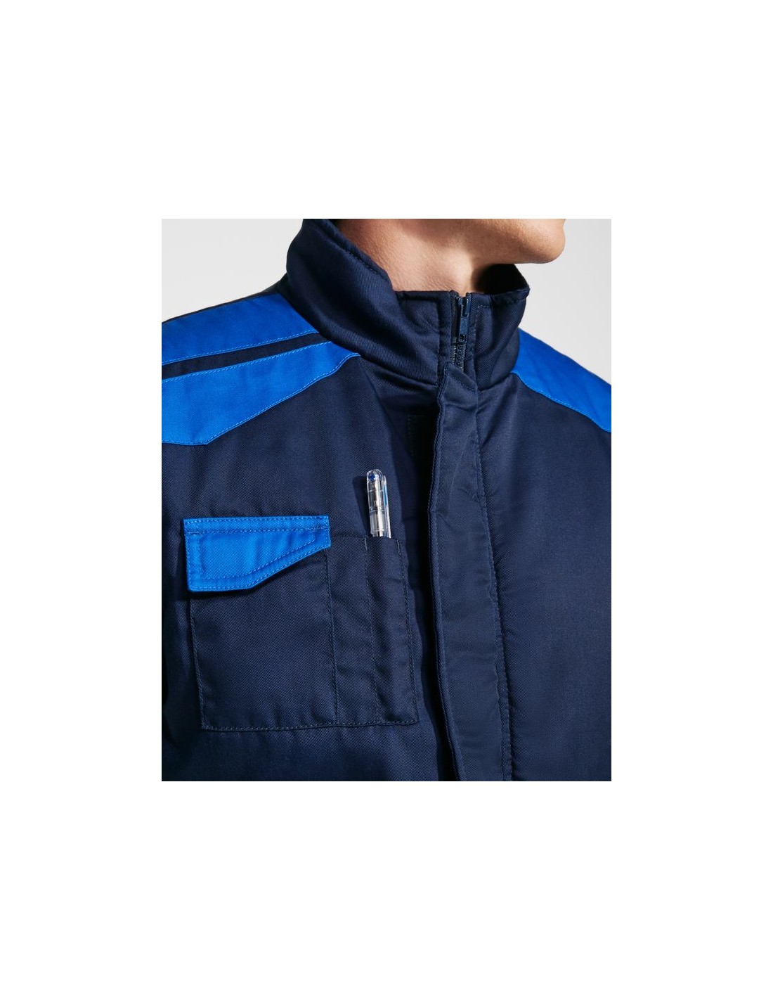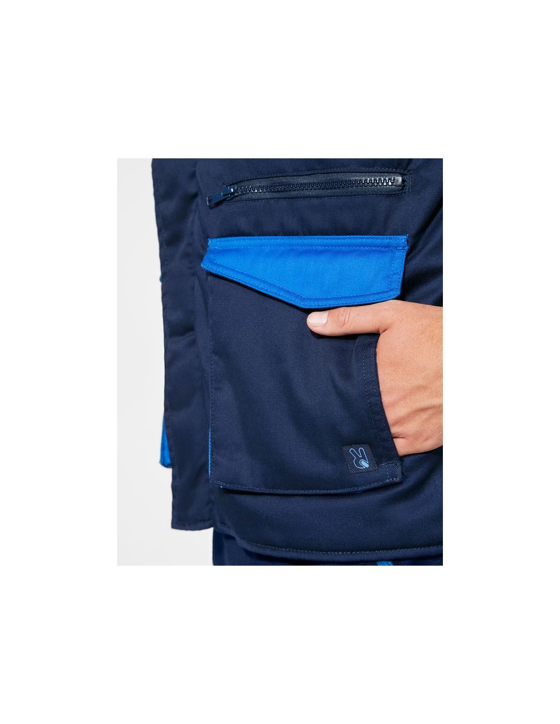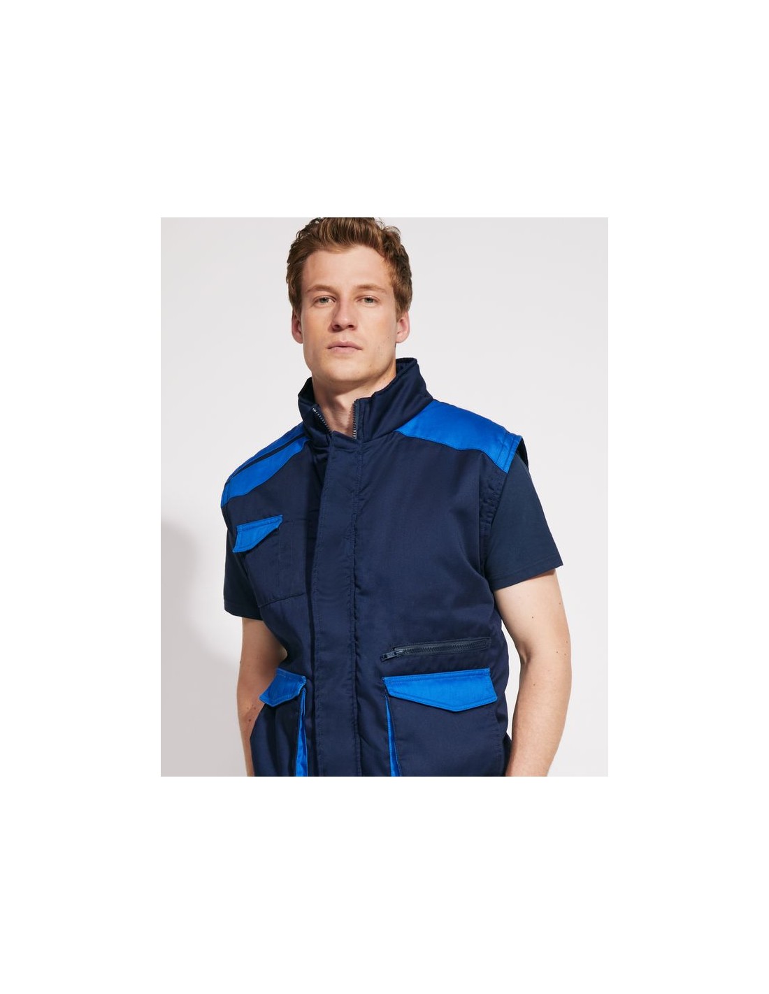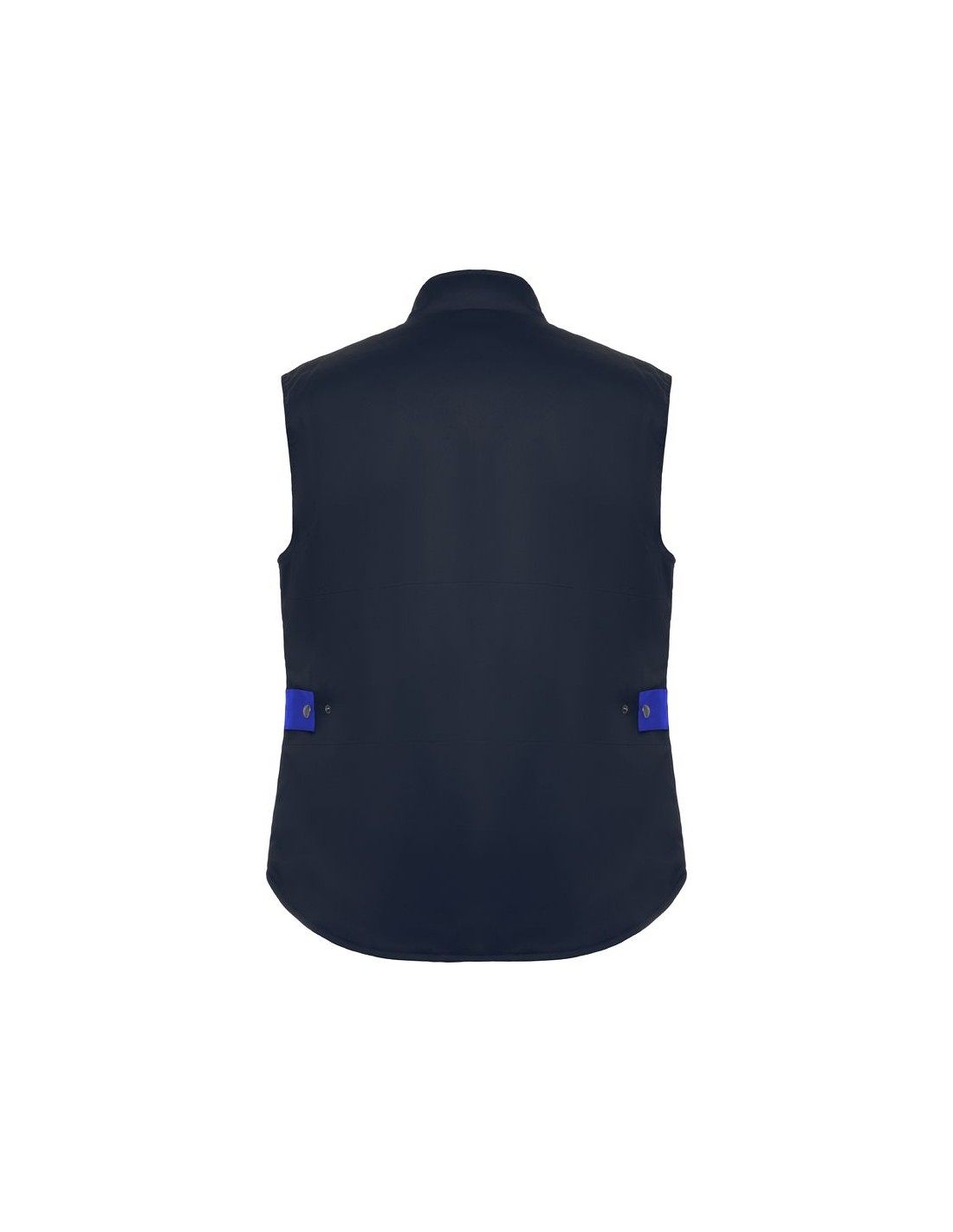 Gilet da lavoro multitasche con collo alto in colori combinati, cerniera centrale con zip e velcro, giacca a vento sulle maniche, una tasca esterna per cellulare sul lato destro, con patta e velcro, due tasche frontali con soffietto, patta e velcro, due portapenne, una tasca interna con velcro, tasca con zip, orlo posteriore con gonna, regolatore autobloccante, pannelli e dettagli sulle spalle a contrasto.
