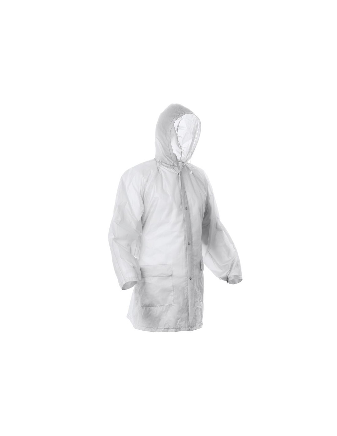 Impermeabile con finiture termosaldate, chiusura centrale con 4 bottoni a pressione, tasche laterali con patta, polsini con bottone, 3 spacchetti posteriori e cappuccio regolabile con coulisse, taglia unica adulto, custodia inclusa.
