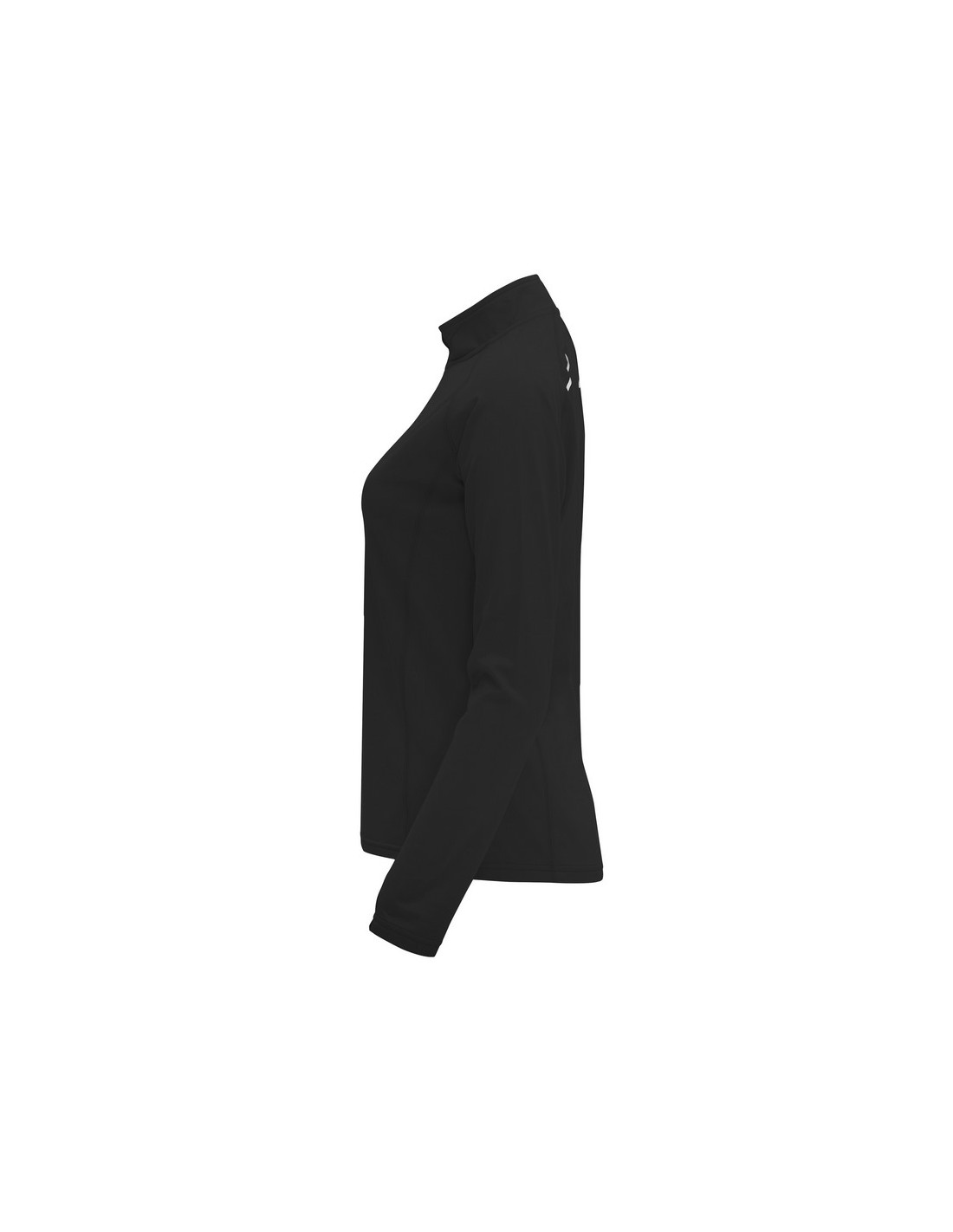 Maglia tecnica manica lunga raglan per donna, interno felpato, copri cuciture rinforzate a contrasto all'interno del collo, mezza cerniera invertita in tinta con dettagli riflettenti, polsini con apertura per il pollice, la parte posteriore è leggermente più lunga della parte anteriore, dettagli riflettenti sulle spalle.