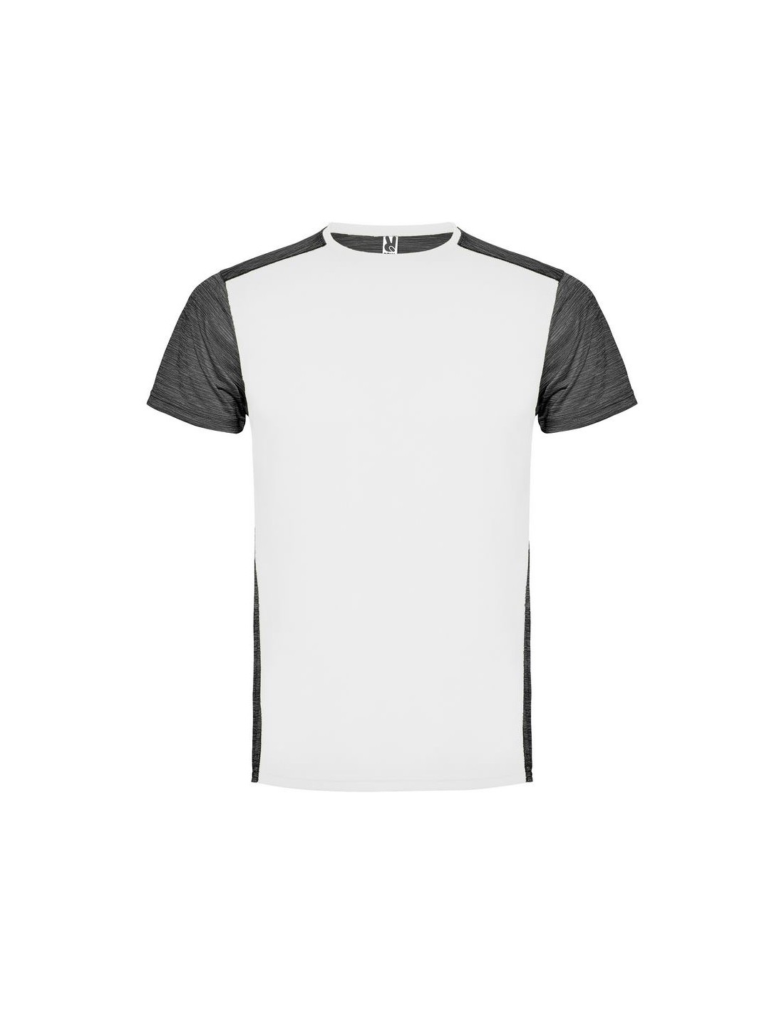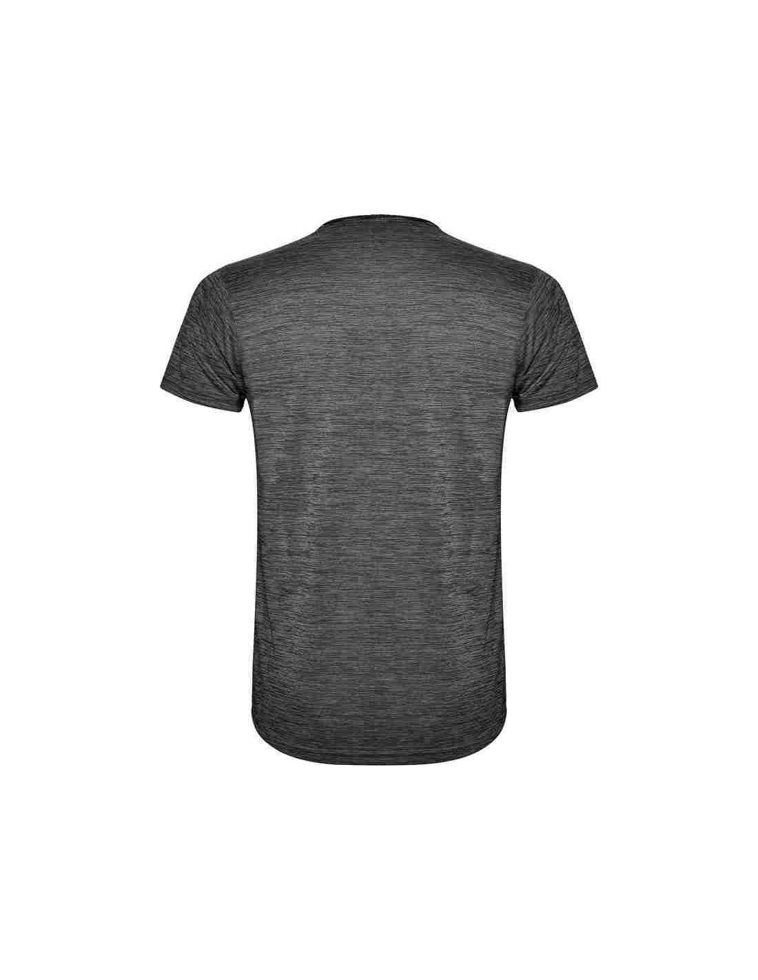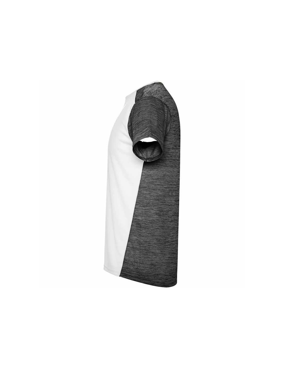 T-shirt tecnica manica corta, girocollo, tessuto a contrasto sul retro, spalle e maniche con due tessuti di poliestere, tessuto pricipale frontale a occhio di pernice e tessuto space dye nella parte posteriore, parte posteriore leggermente più lunga.