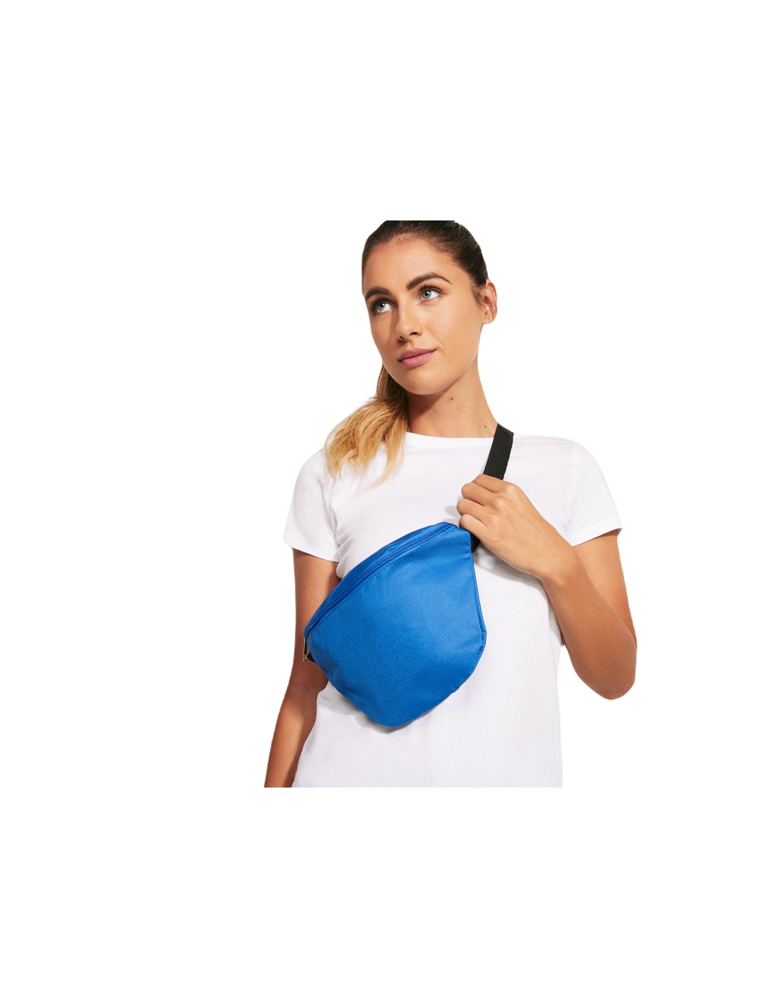 Marsupio con tasca frontale e tasca posteriore, cerniere e tiralampo in tinta con il marsupio, cinturino e fibbia di regolazione in colore nero.