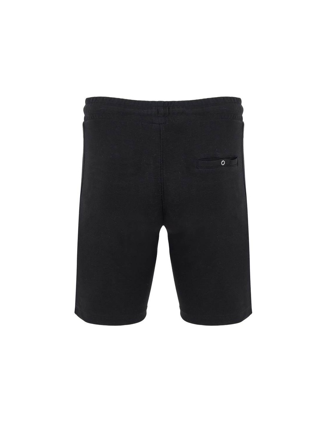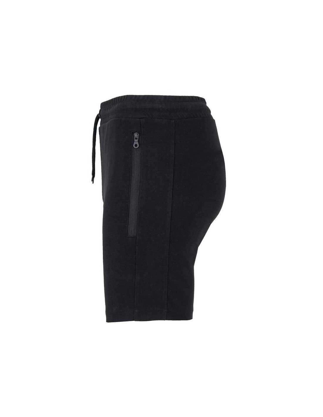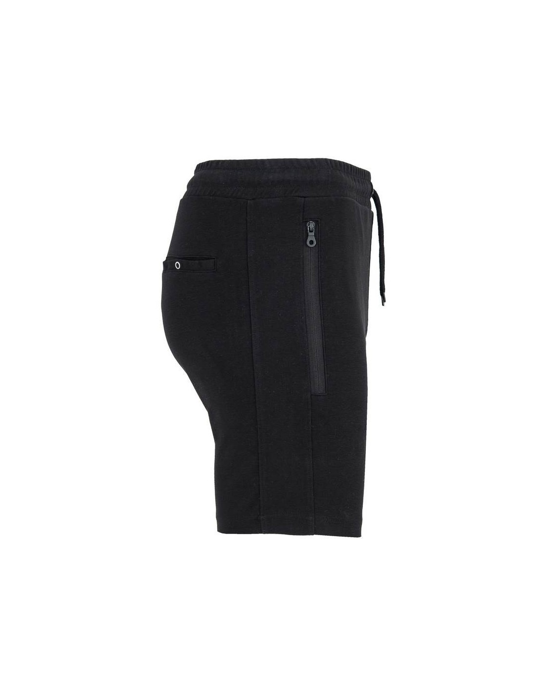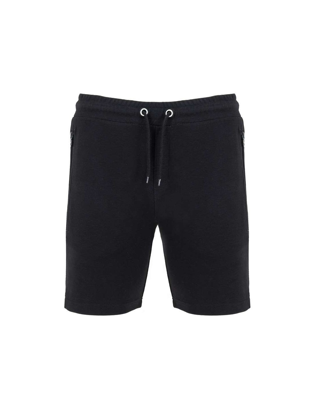 Pantaloncini con girovita elastico e cordoncini con occhielli metallici, due tasche laterali con cerniera invertita in tinta e tiretto, fascia laterale in tinta, ornamento della patta cucita, tasca posteriore con bottoni a pressione.