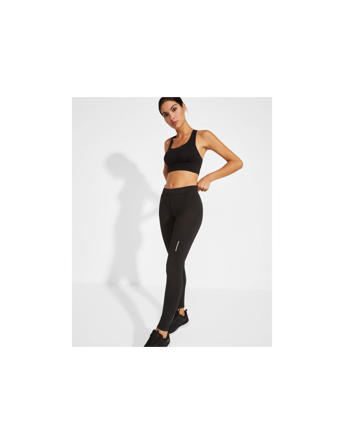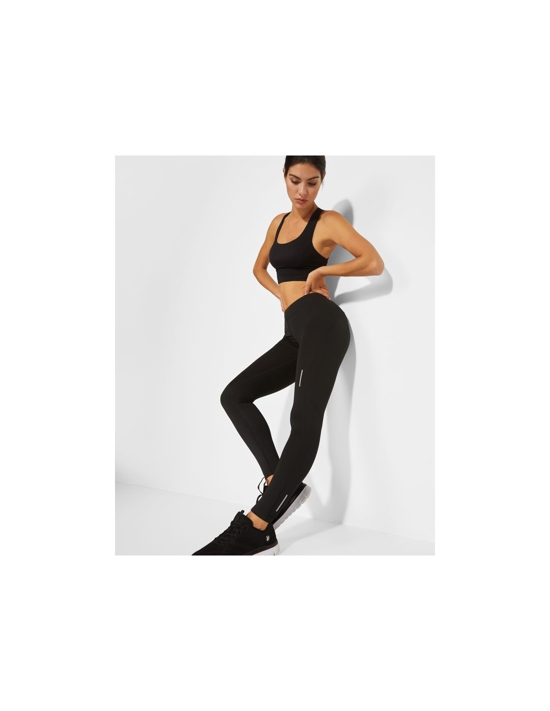 Leggins lungo tecnico per donna con girovita elastico e cordoncino interno incrociato per facilitare la regolazione, dettagli riflettenti, tasca interna anteriore, tessuto elastico ed adattabile al corpo.