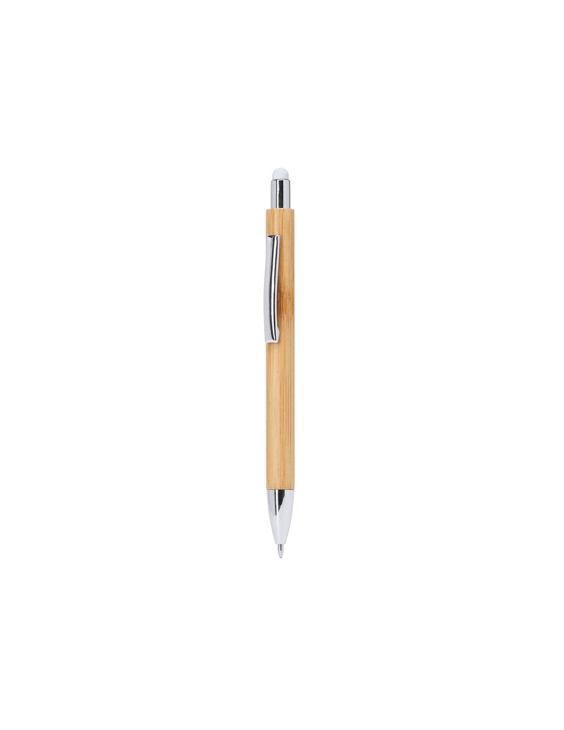 Penna della linea eco con corpo in bambù, puntatore tattile a colori e clip in metallo, bottone, clip e punta argentati, carica jumbo trasparente da 1,0 mm con inchiostro blu.