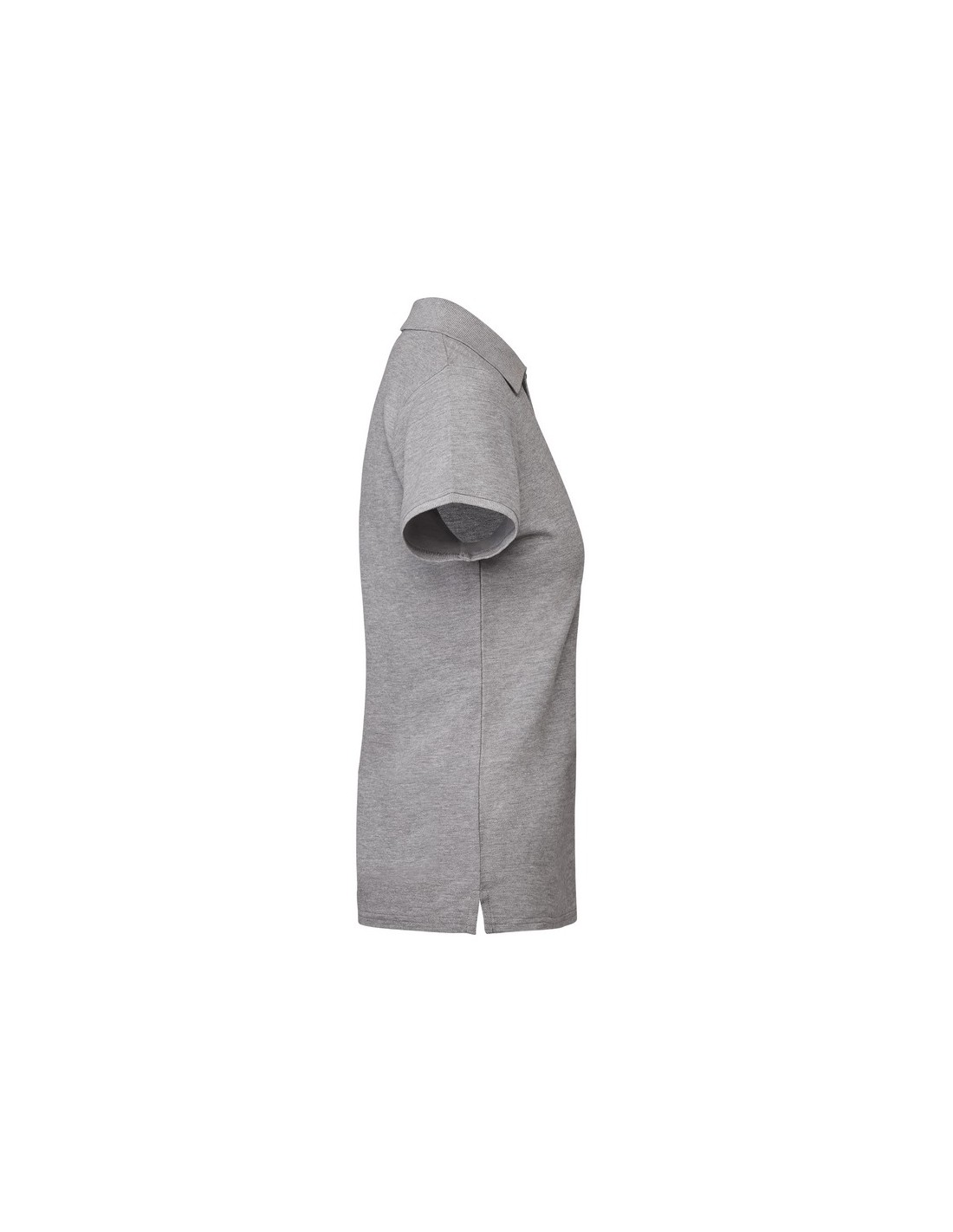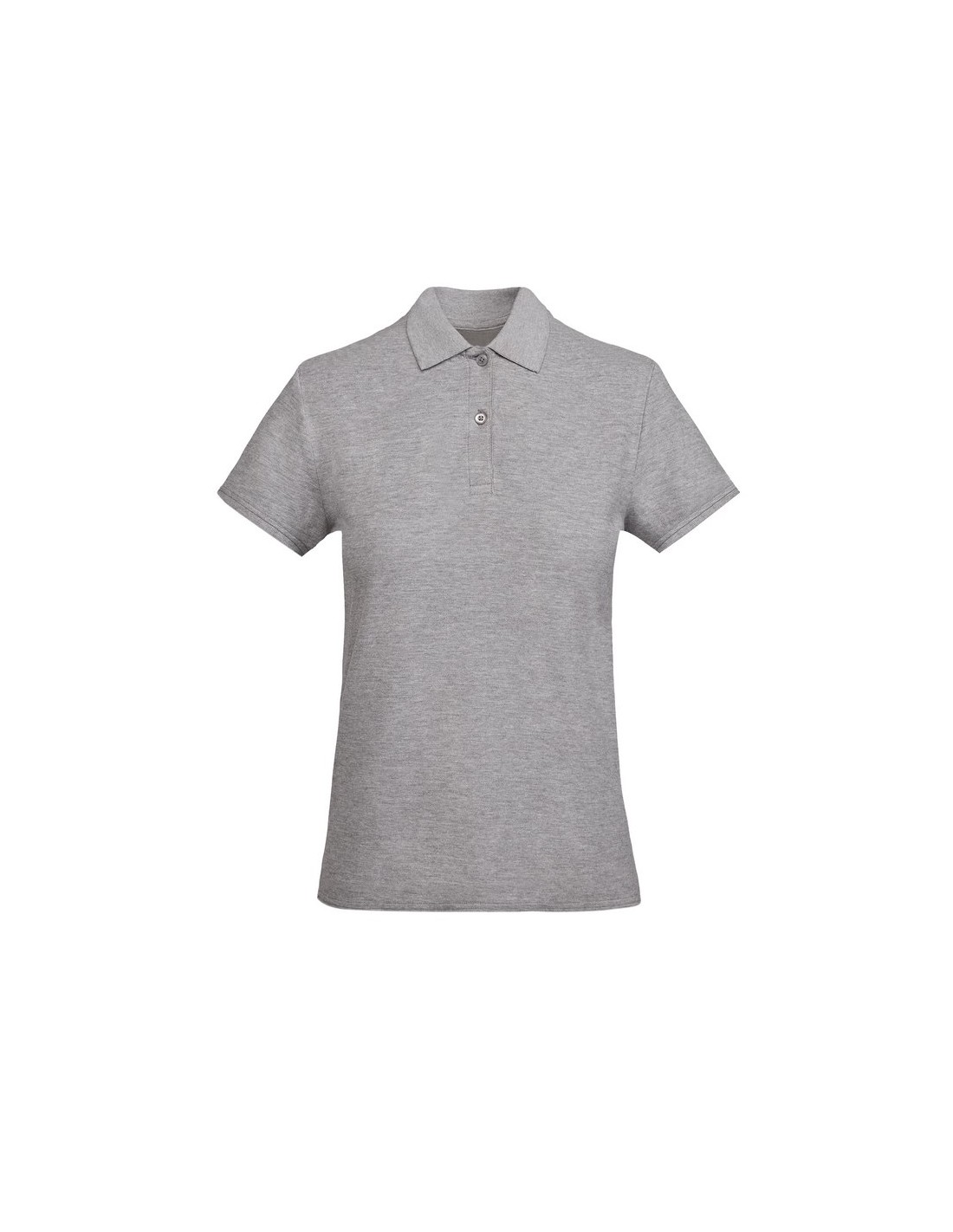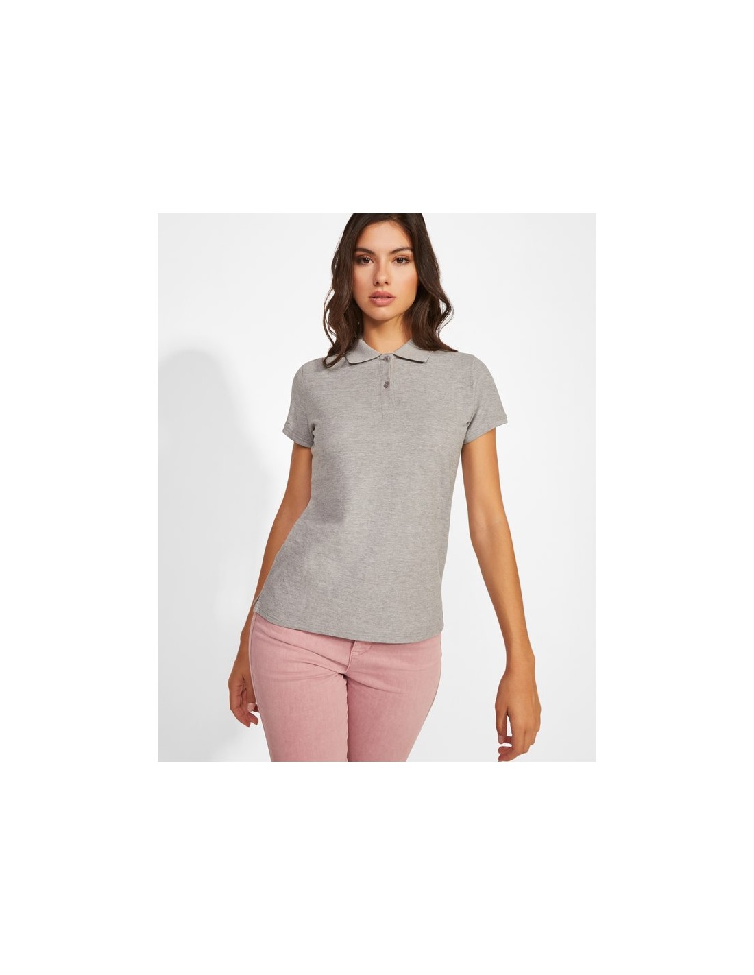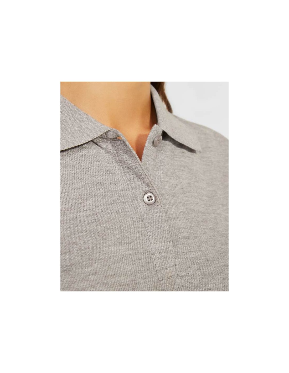 Polo da donna aderente a maniche corte in cotone organico certificato OCS, colletto e polsini delle maniche in costina 1x1, chiusura a due bottoni, copri cuciture rinforzate sul colletto, spacchi laterali sull'orlo.